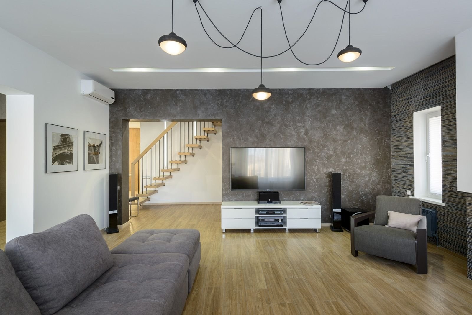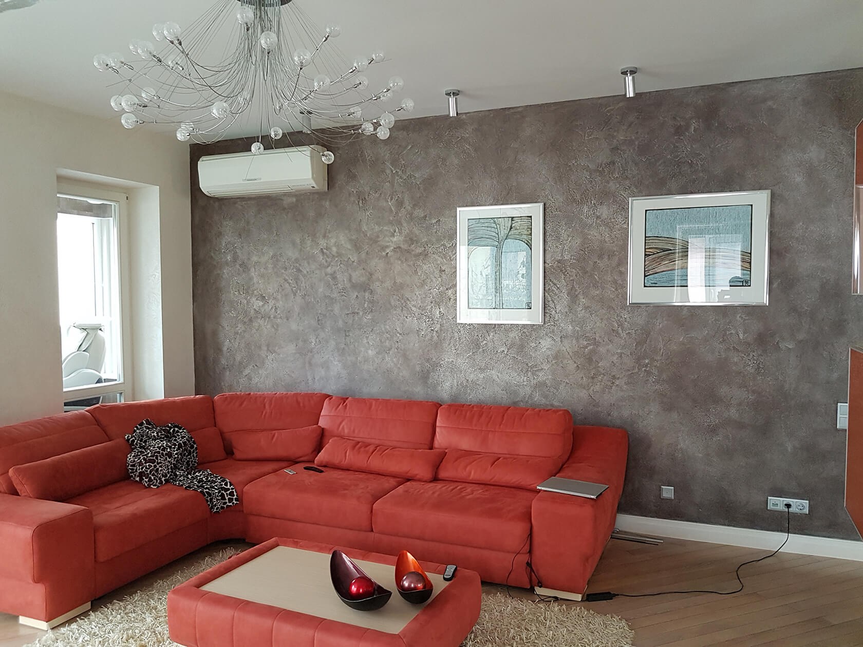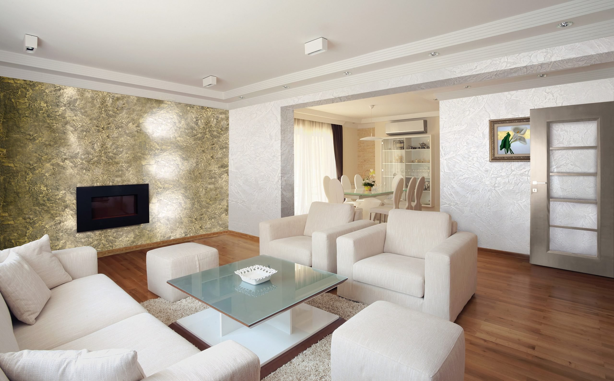Обои под штукатурку в интерьере гостиной (61 фото)