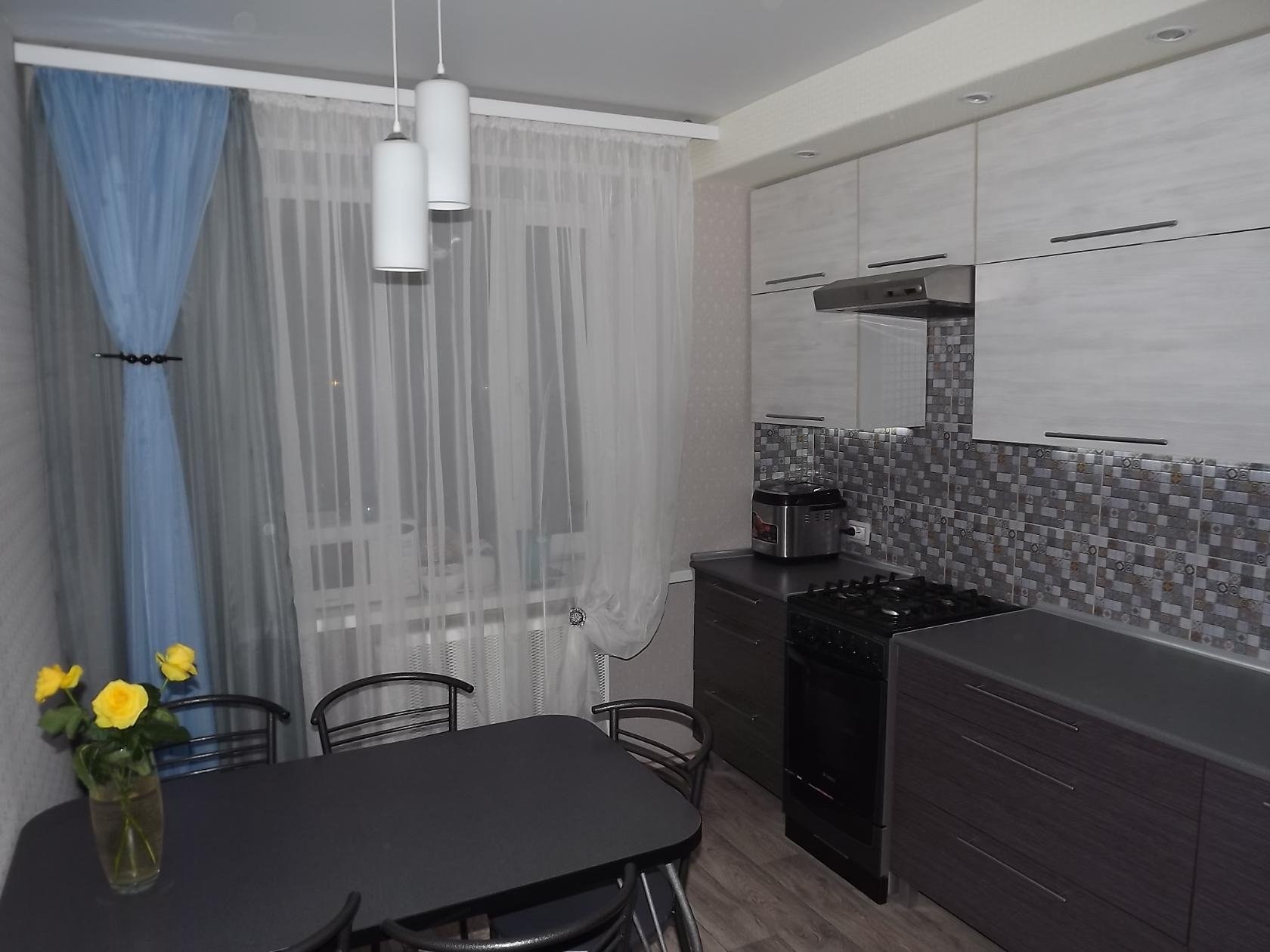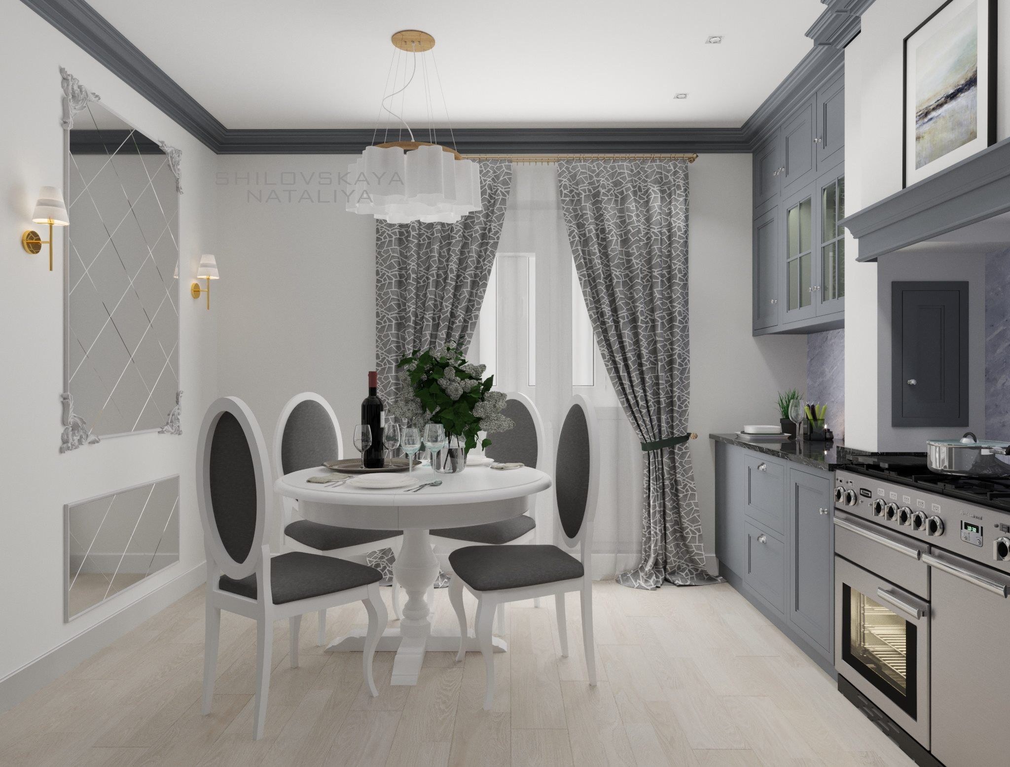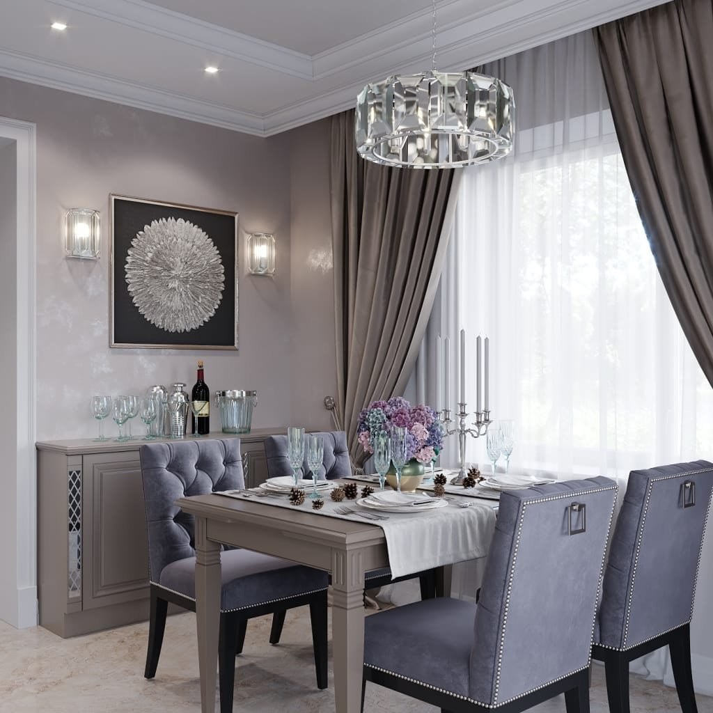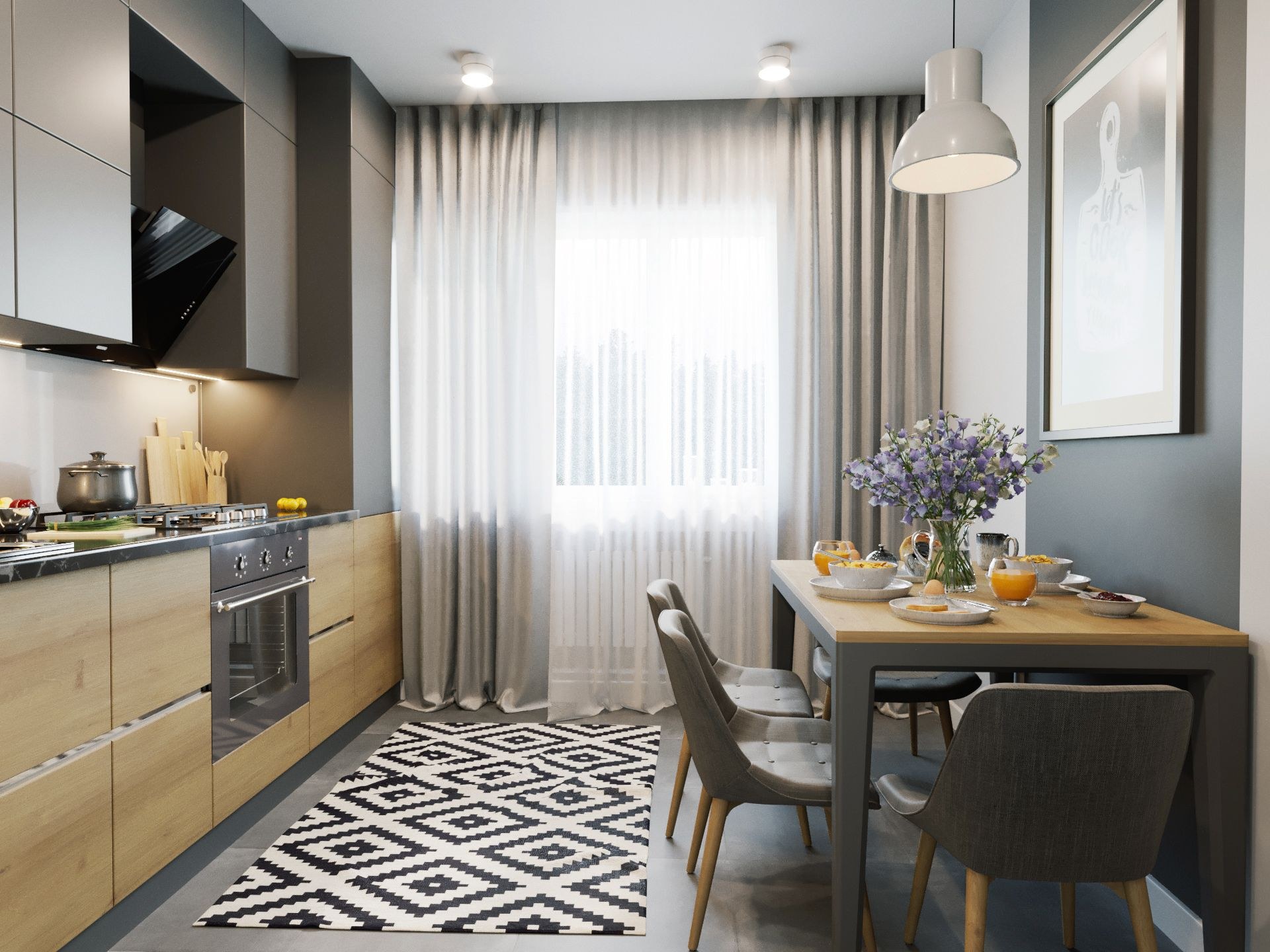 Серые шторы в интерьере кухни