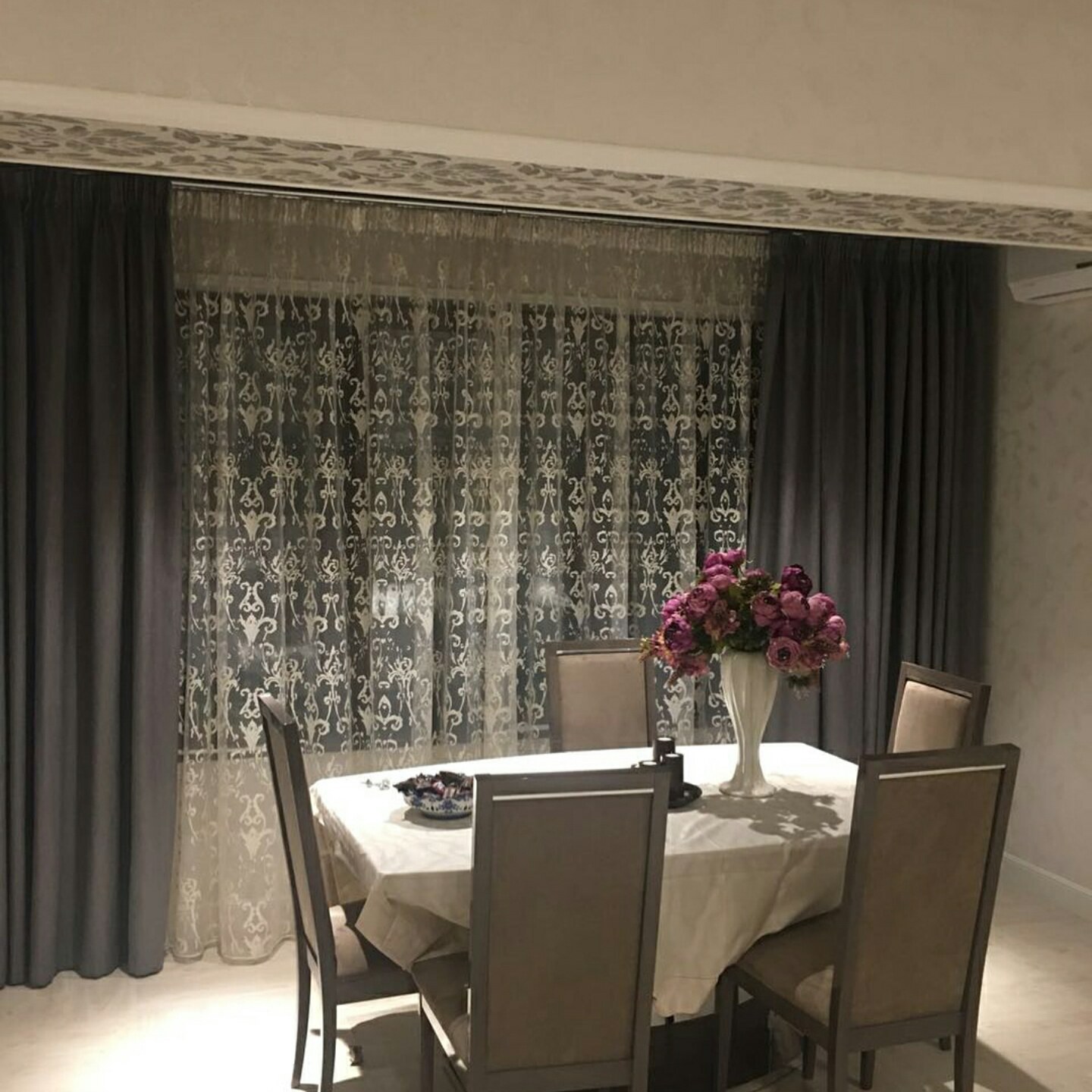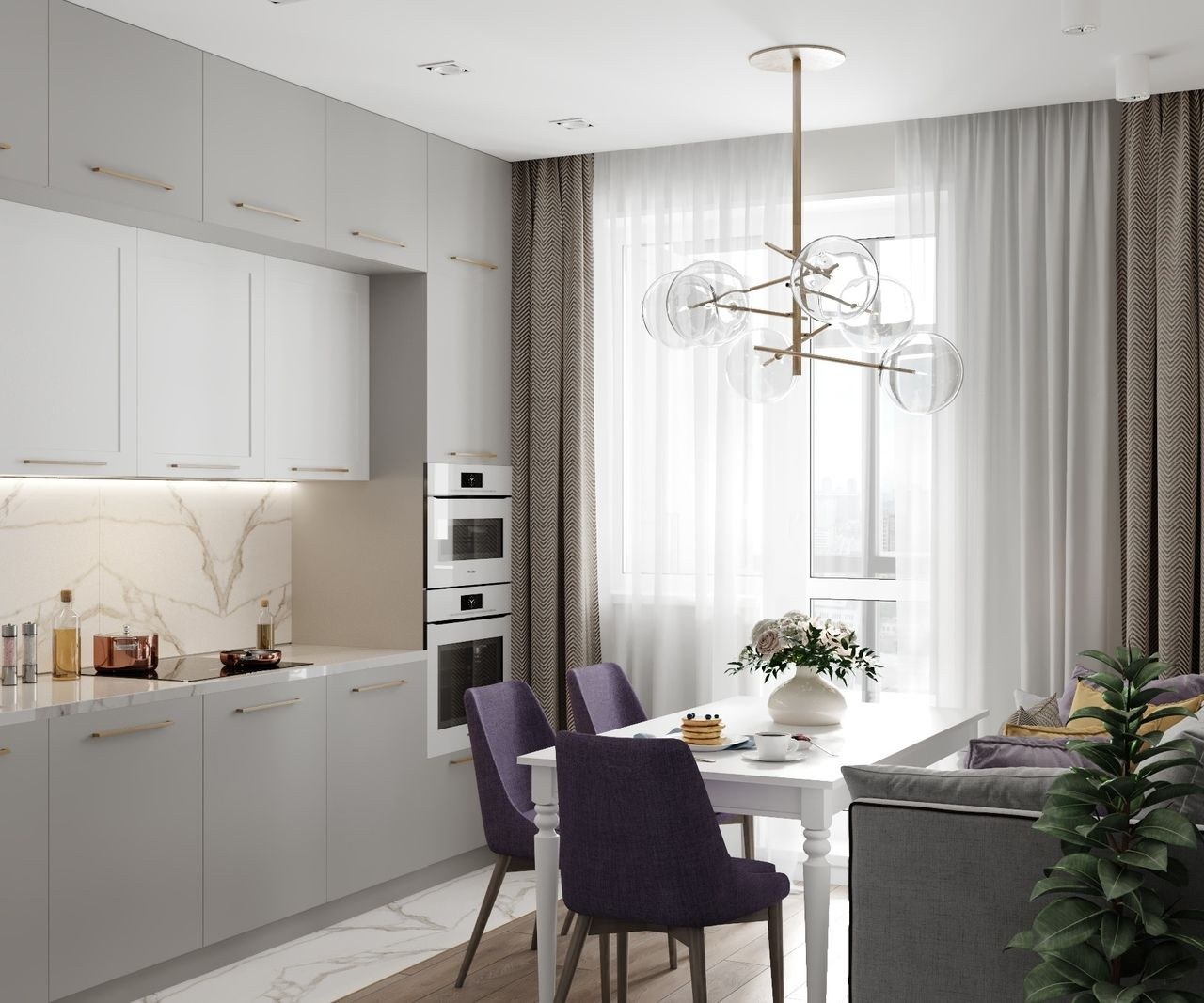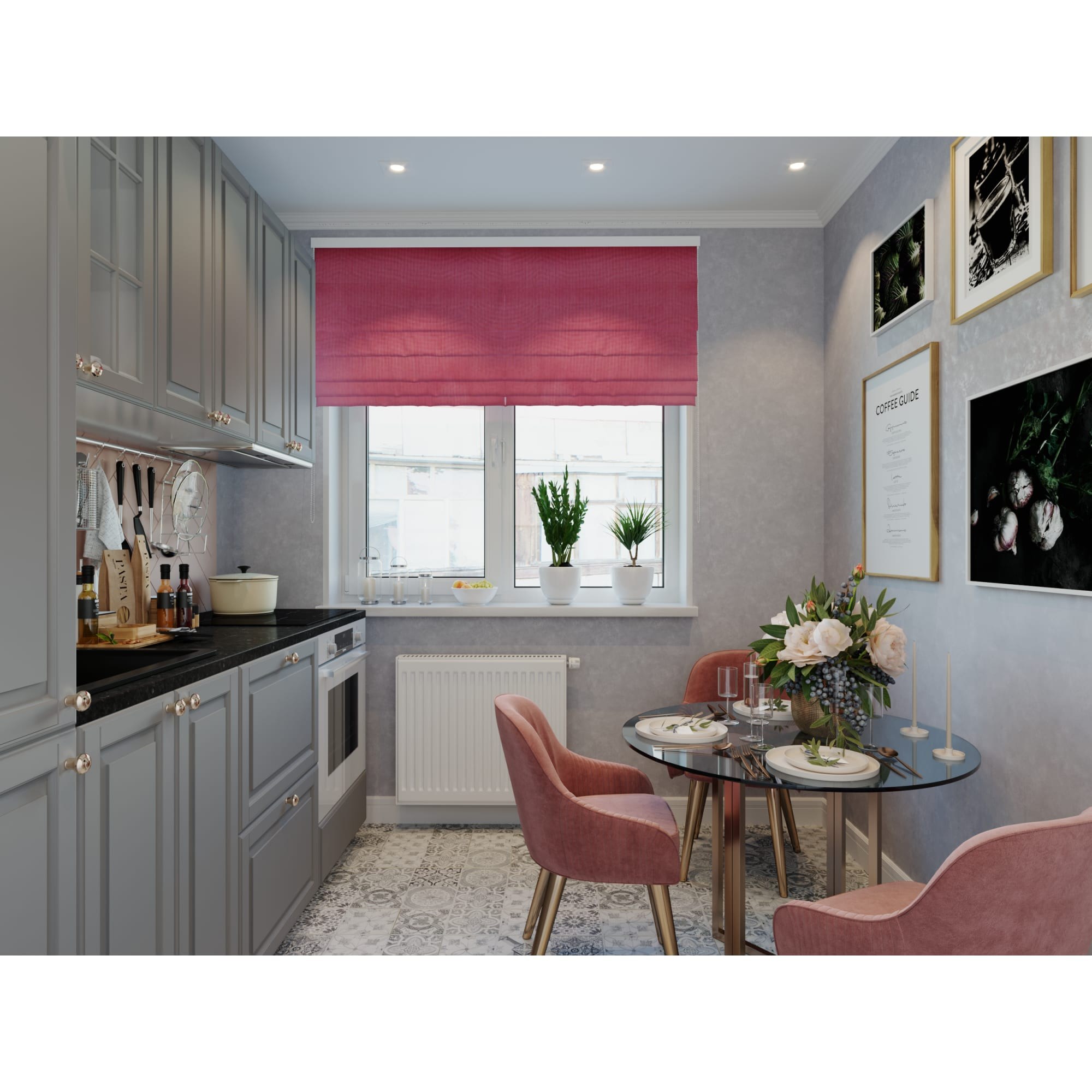 Серые шторы в интерьере кухни