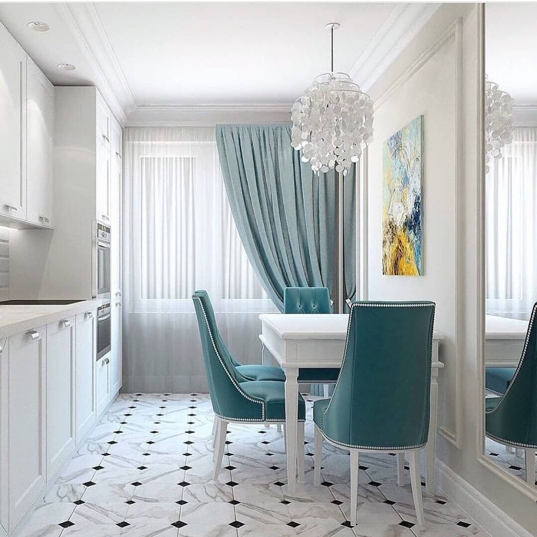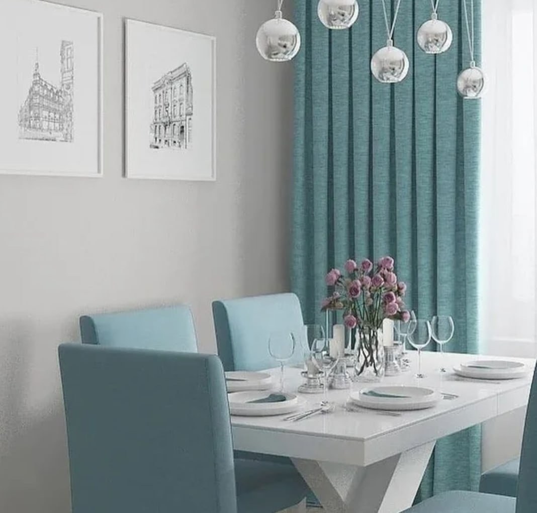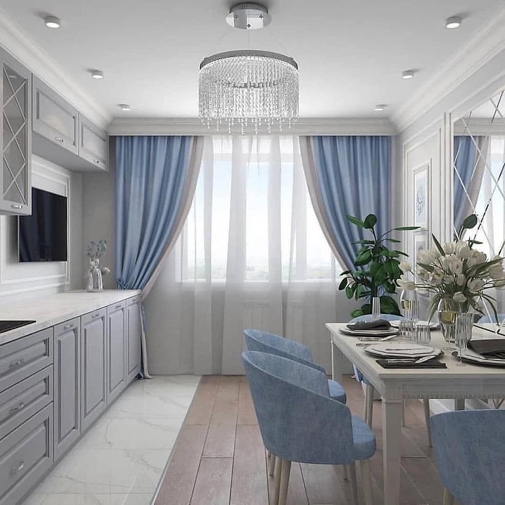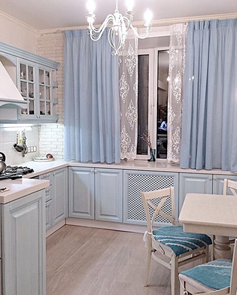 Голубые шторы в интерьере кухни