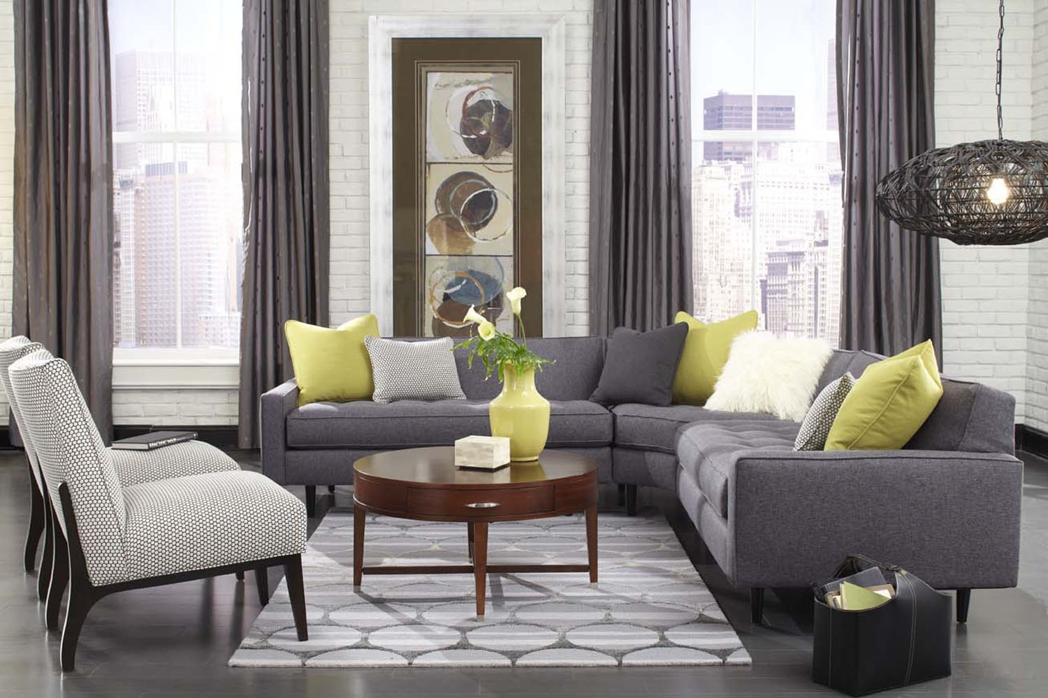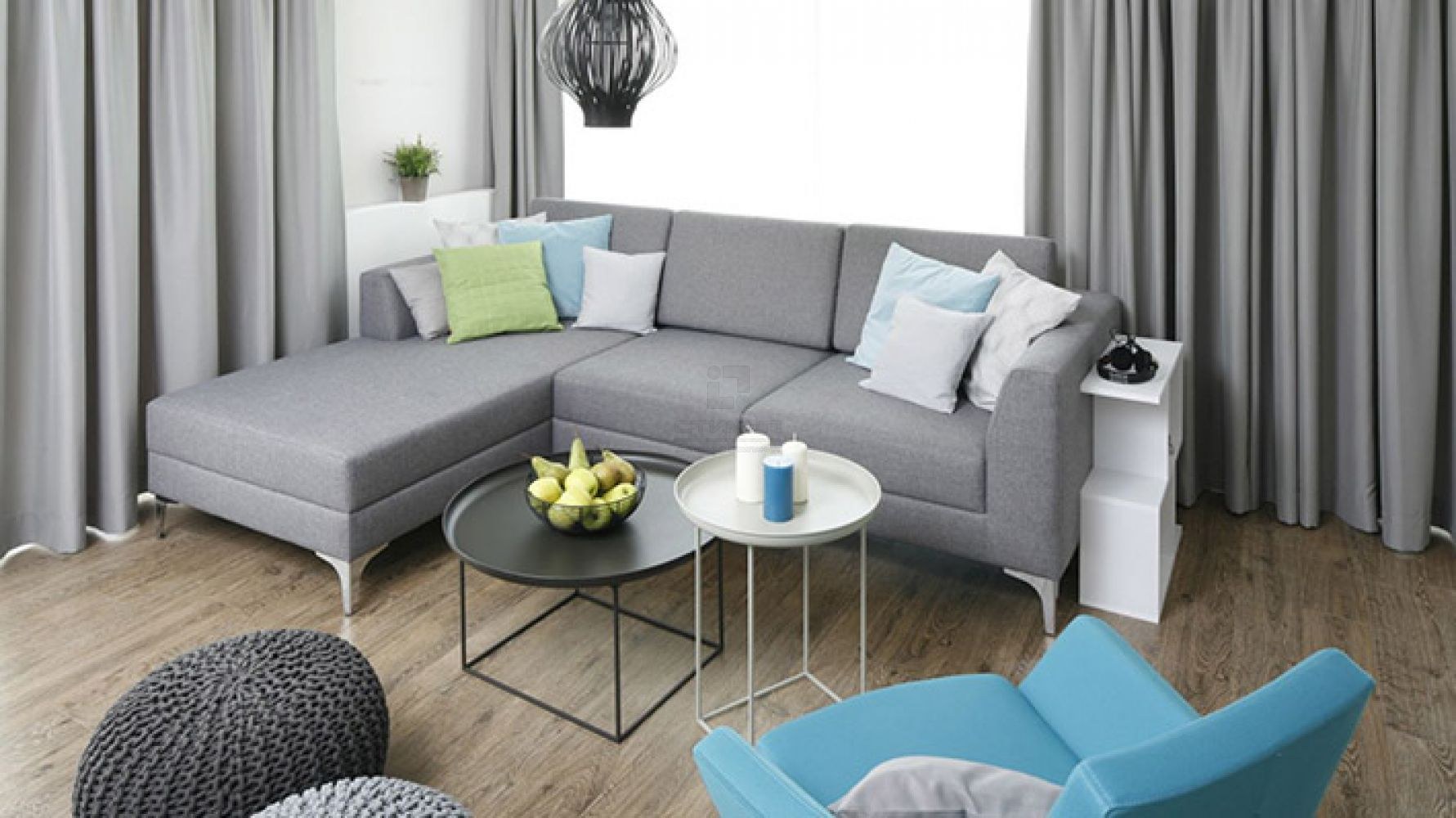 Гостиная с серым диваном