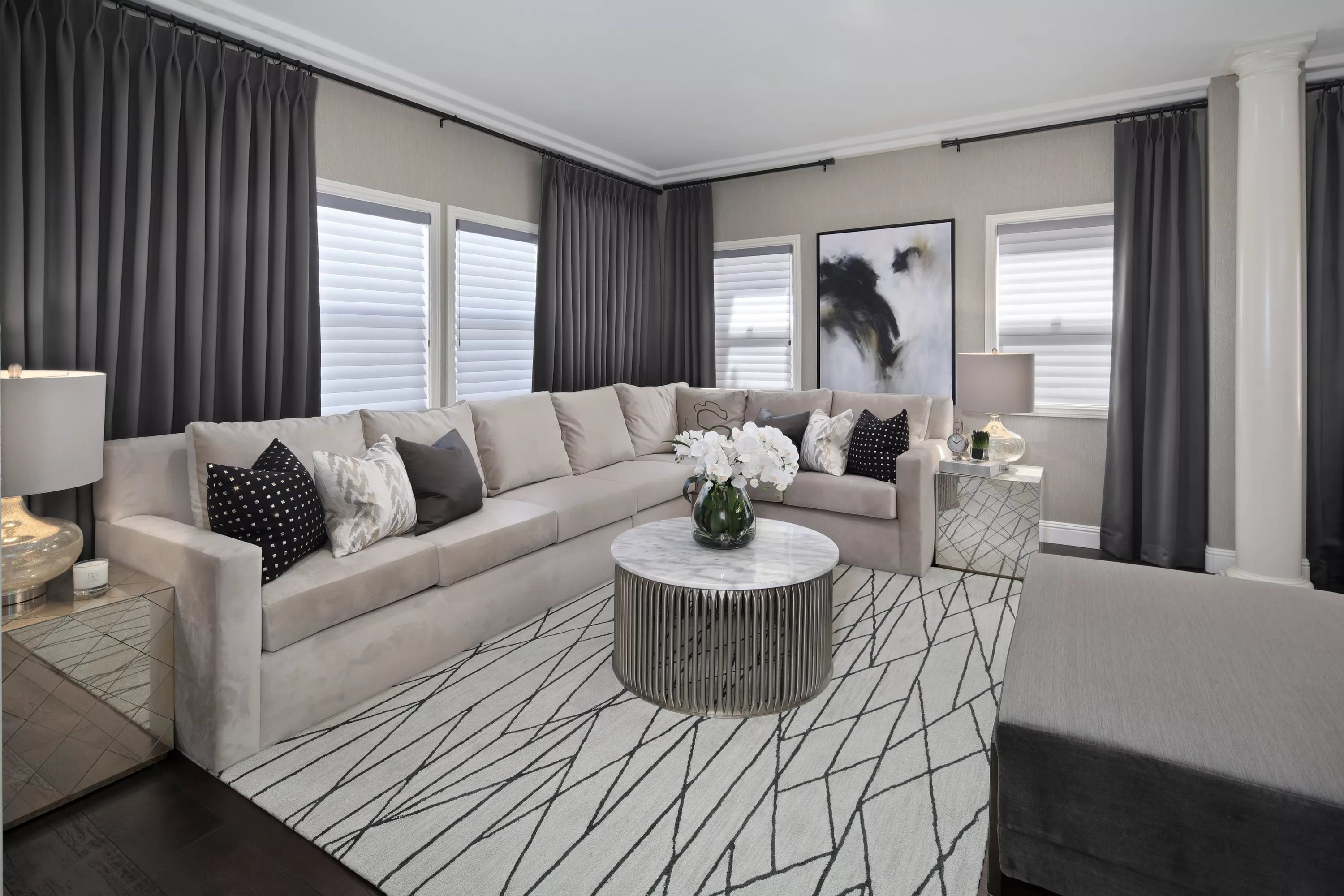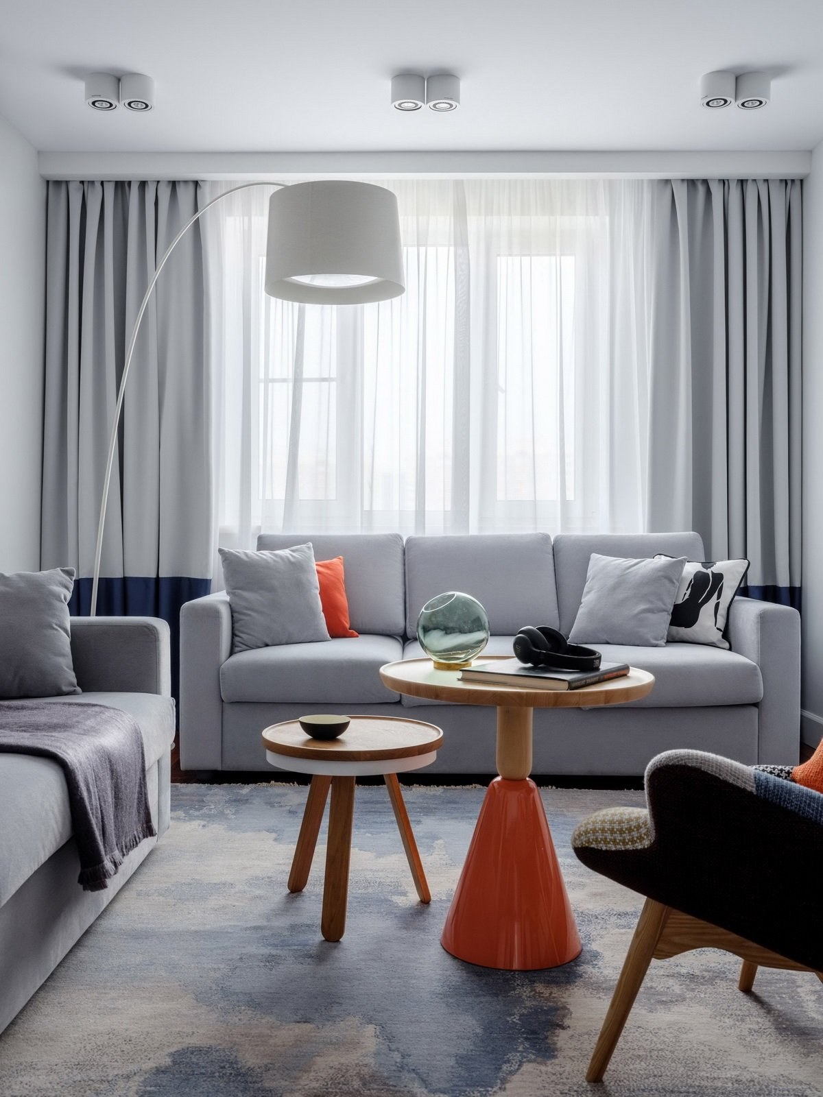 Серые шторы в интерьере гостиной