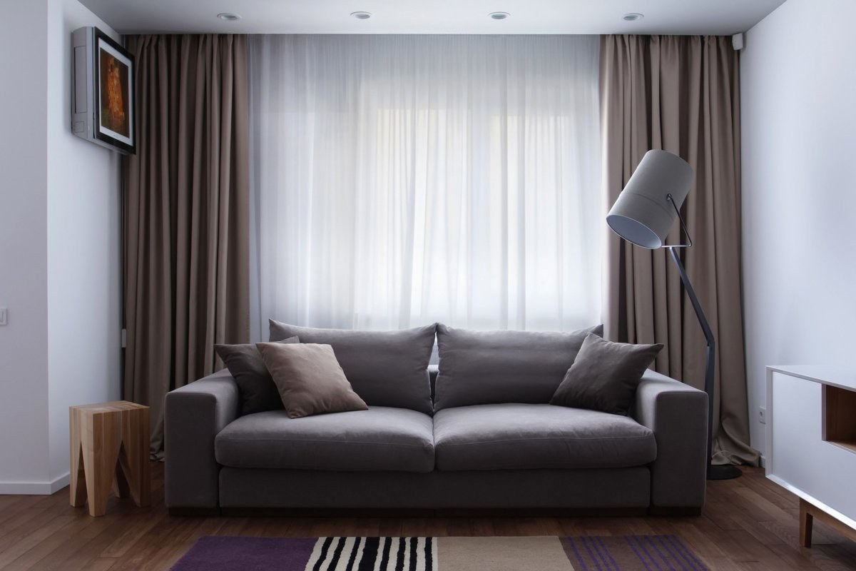 Серый диван в интерьере какие шторы (58 фото)