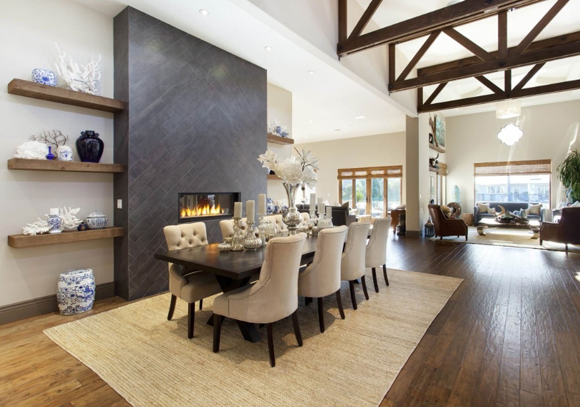Гостиная столовая с камином в частном доме