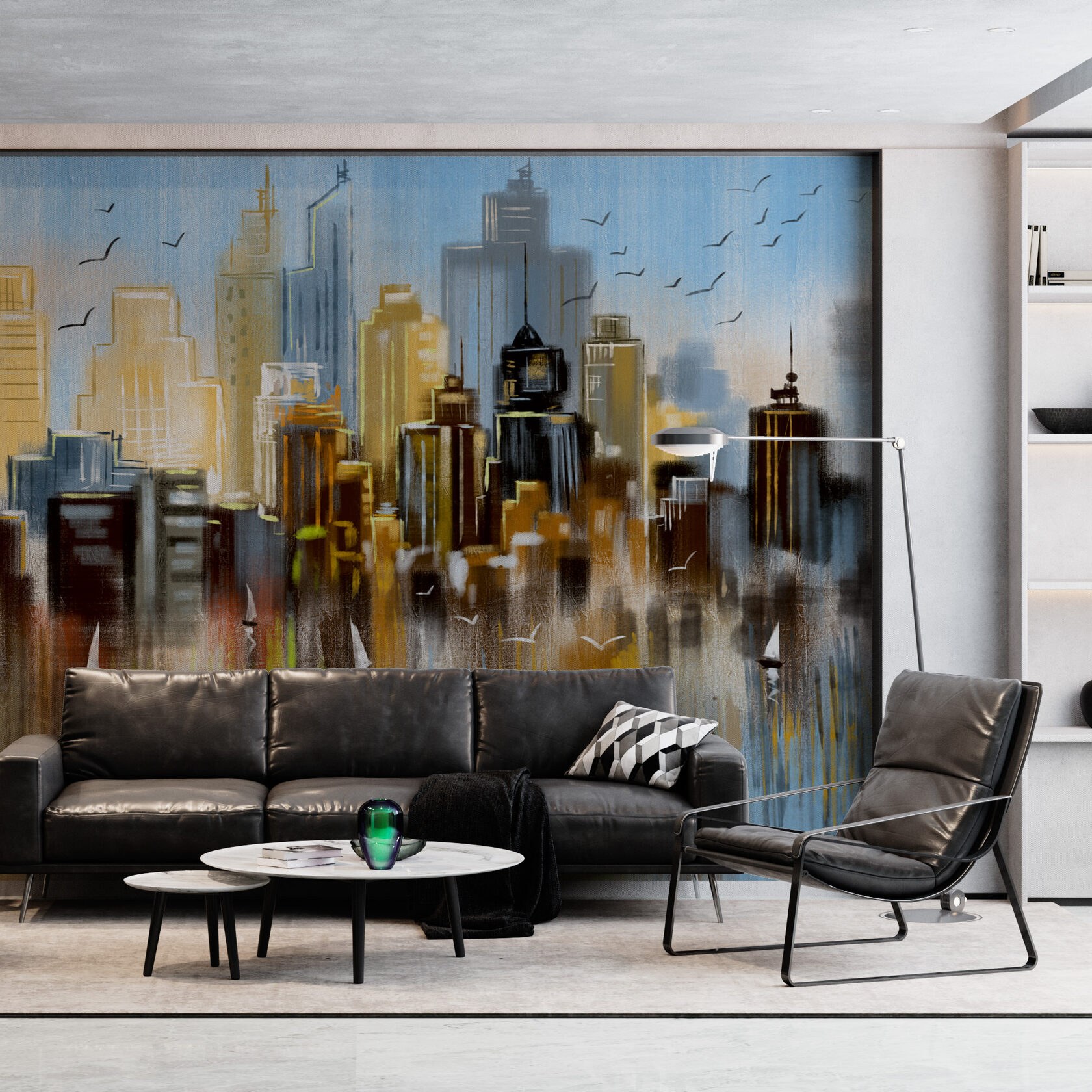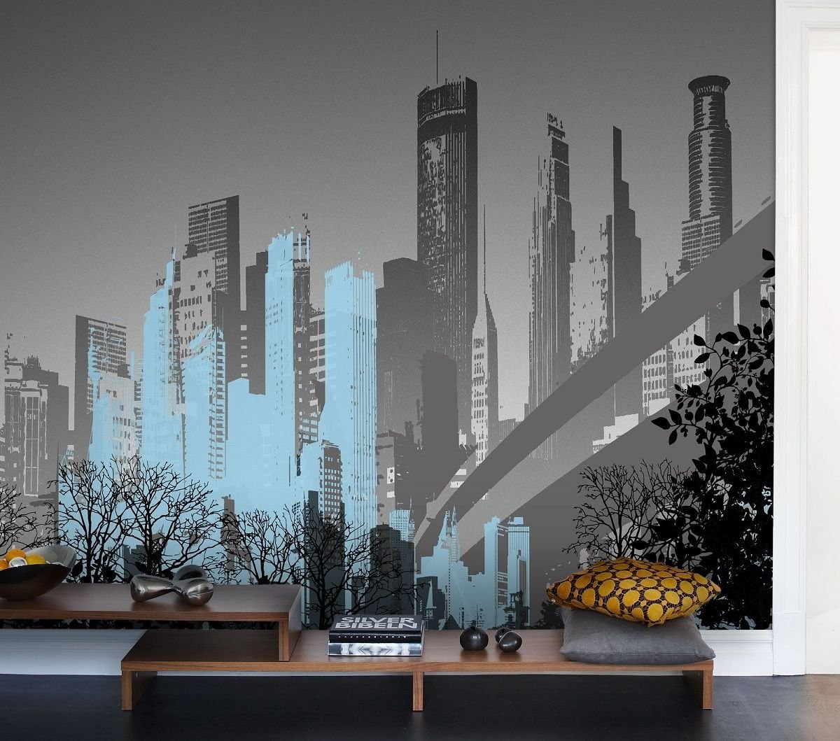 Обои город в интерьере гостиной