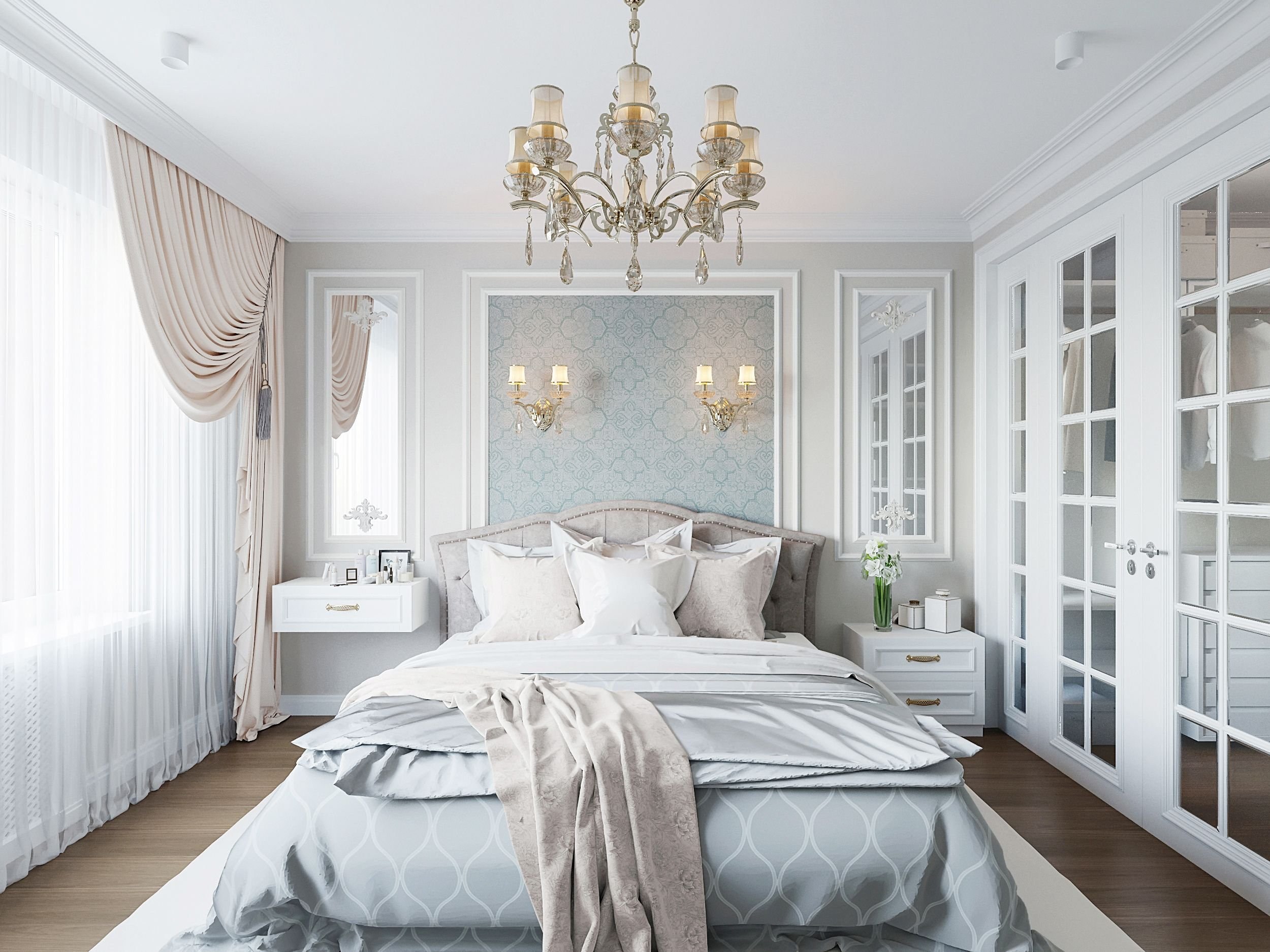 Интерьер спальни в классическом стиле в светлых тонах