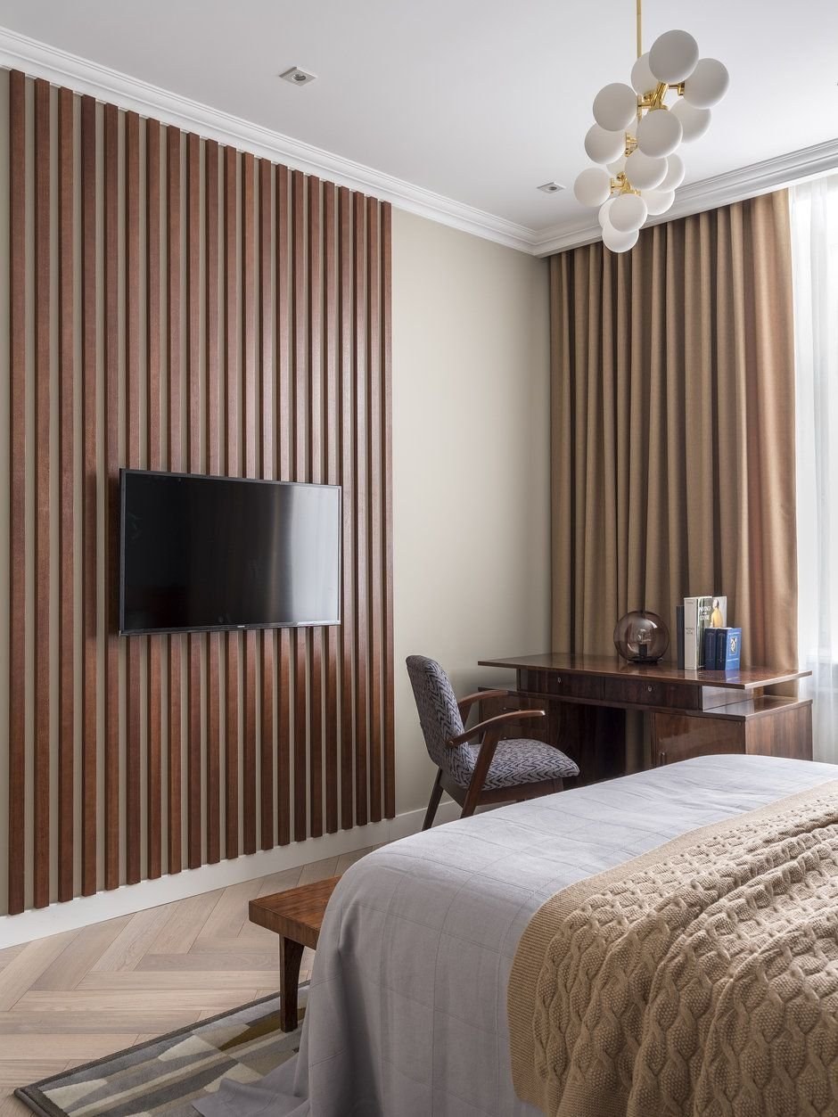Спальня с деревянными рейками на стене