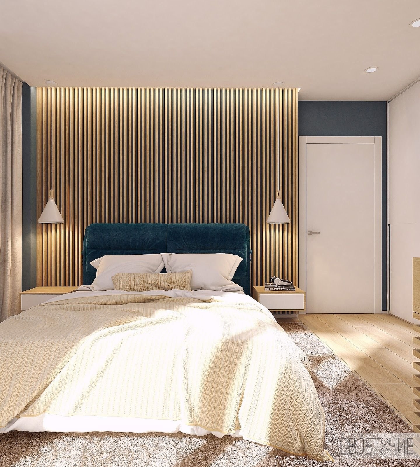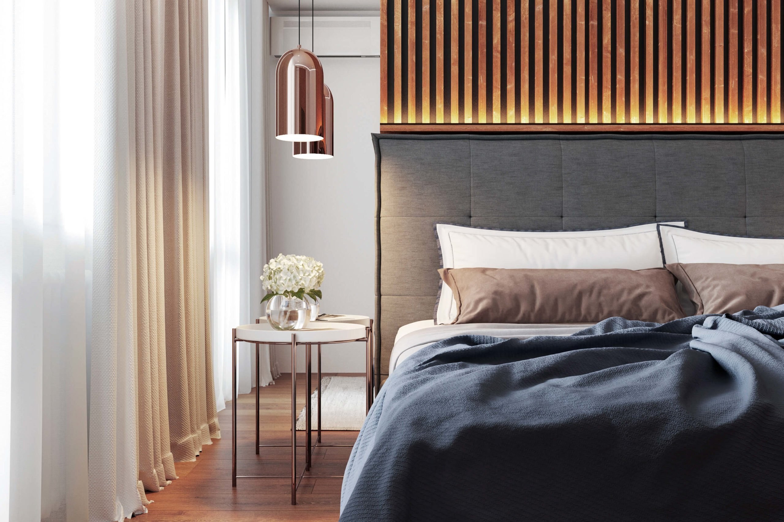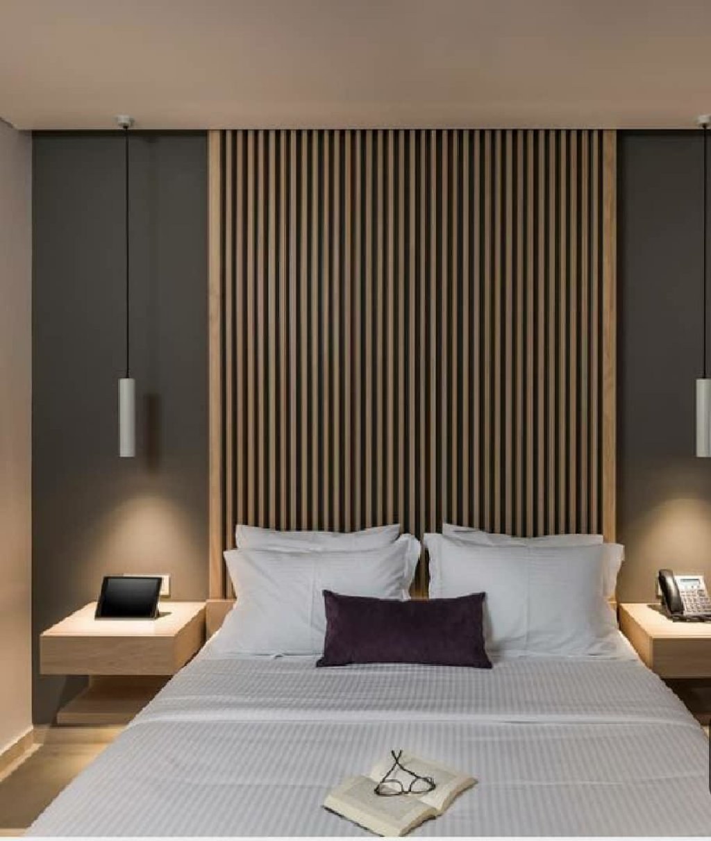 Спальня с деревянными рейками в изголовье