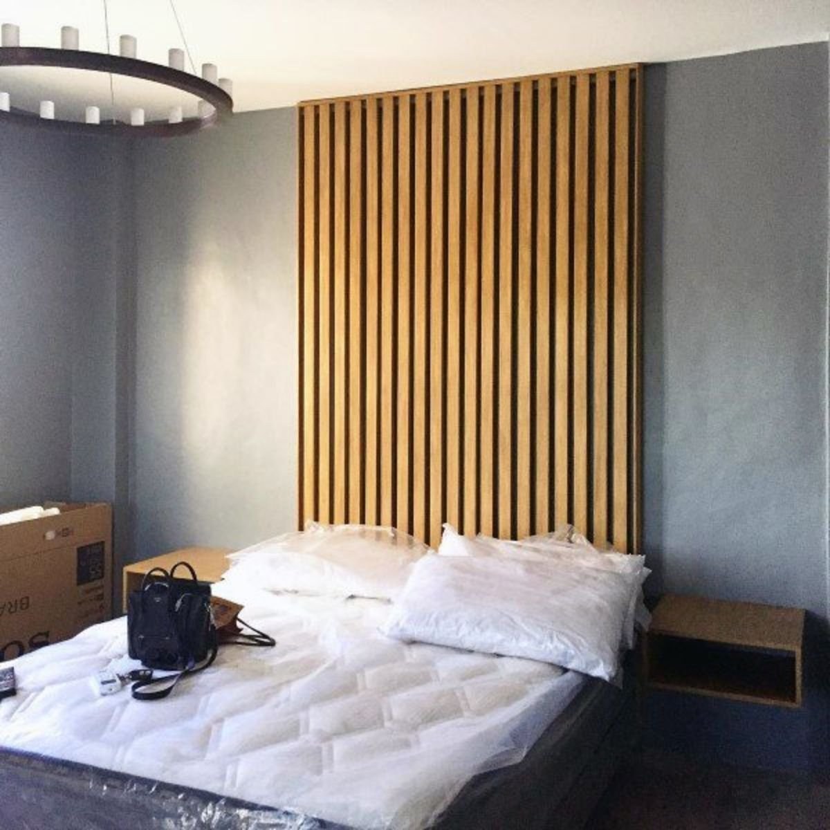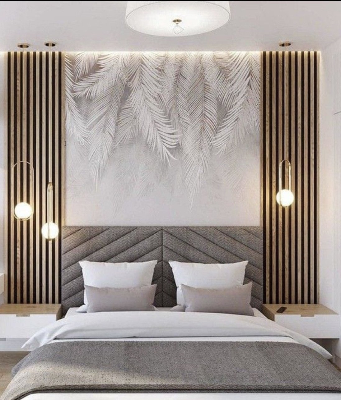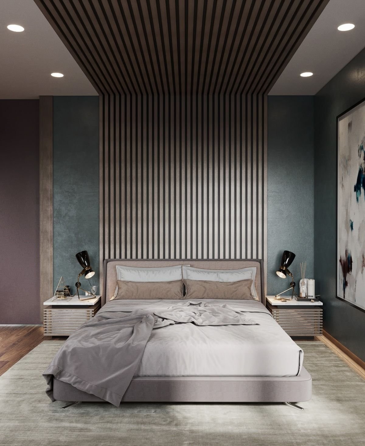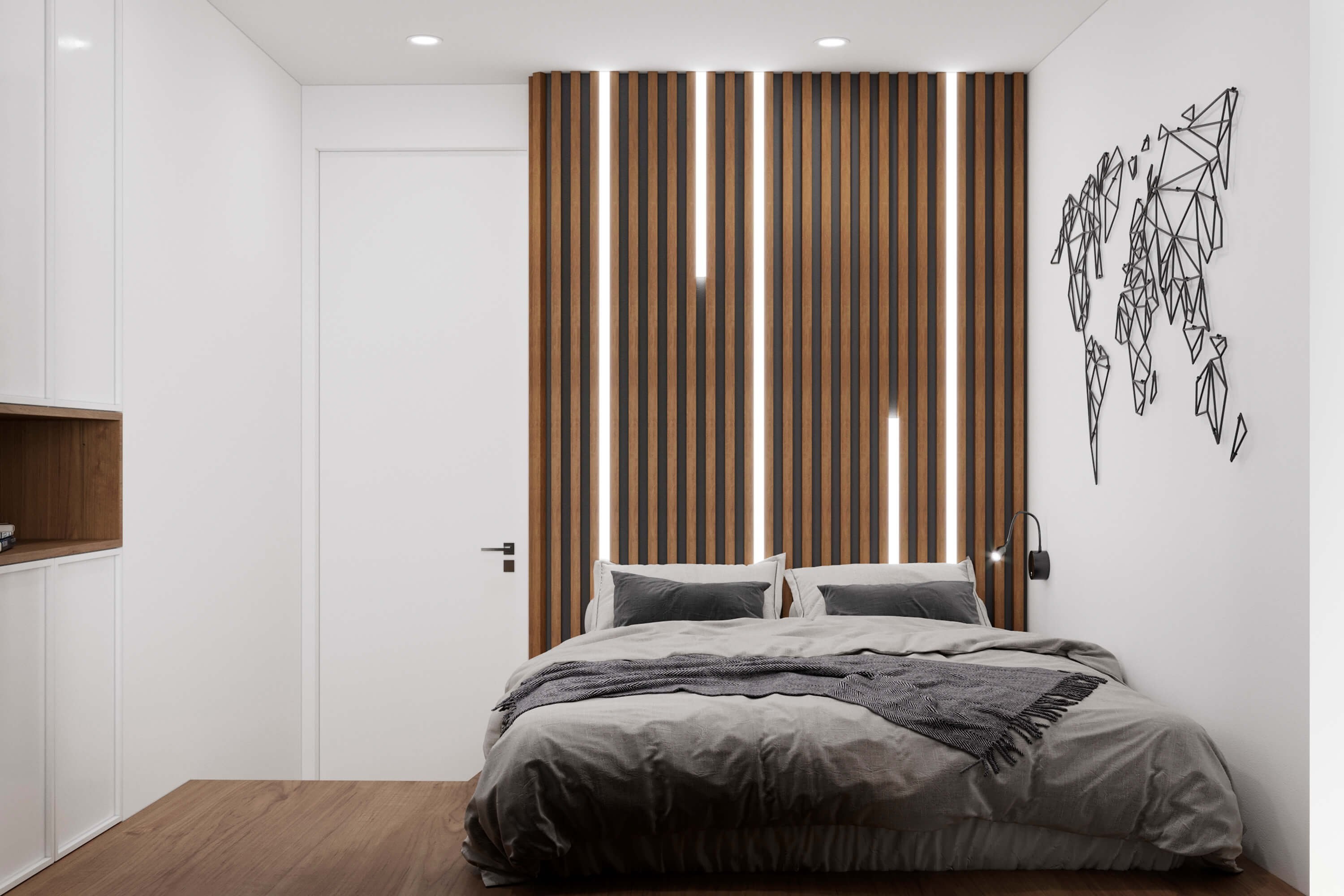 Спальня с деревянными рейками в изголовье