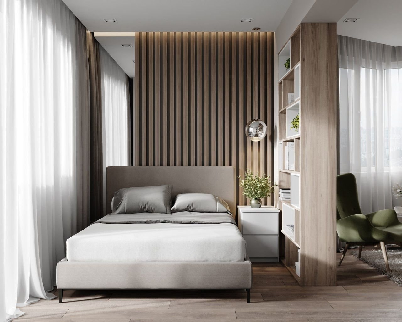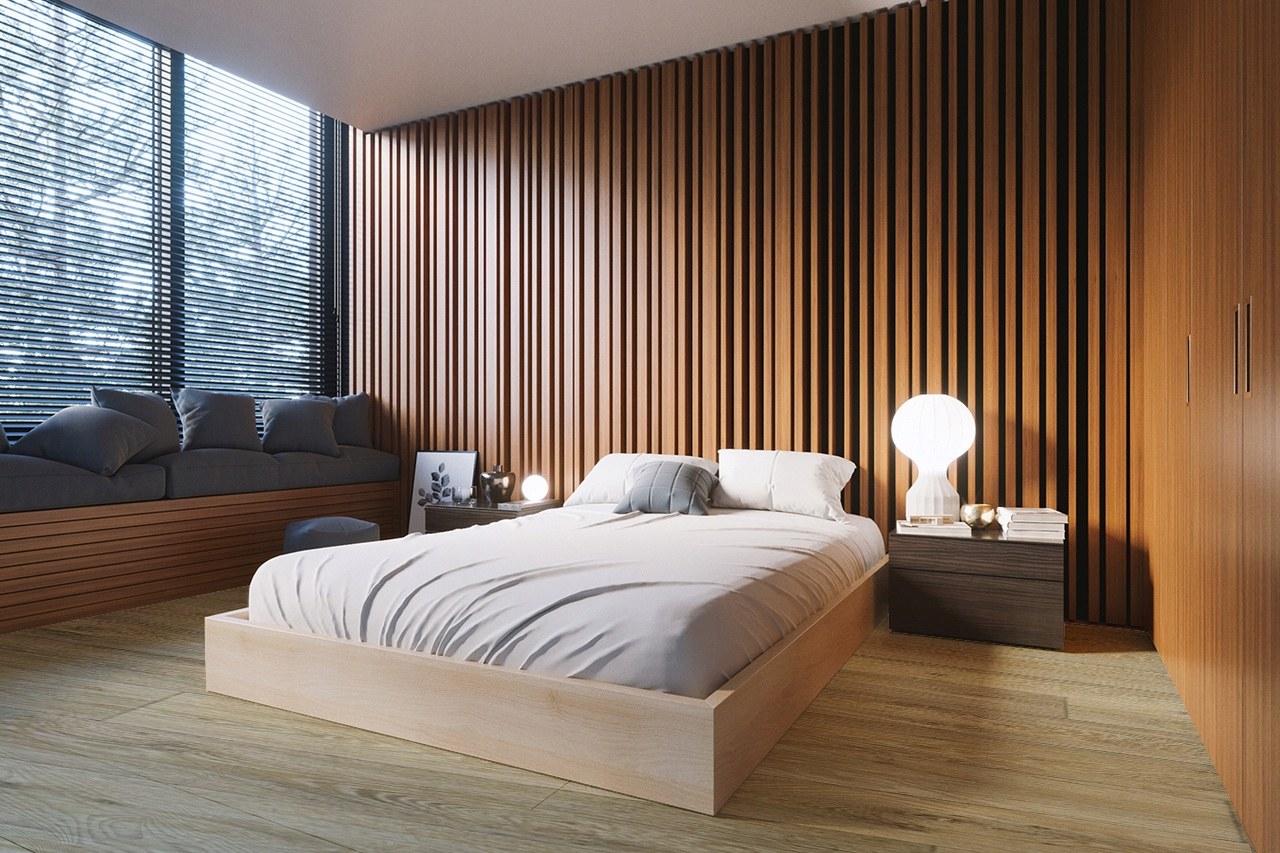 Спальня с деревянными рейками