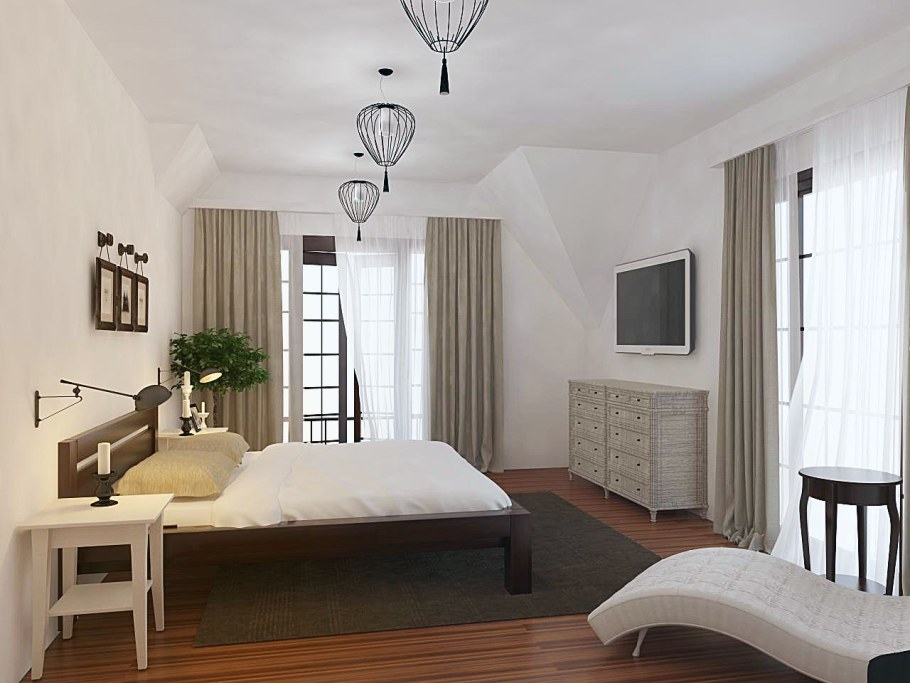 Дизайн спальни с 3 окнами