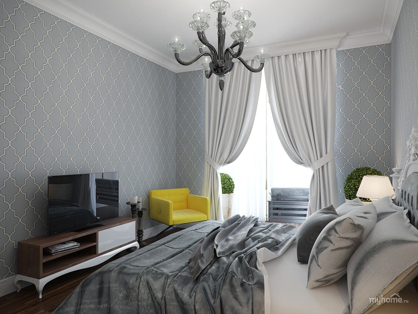 Серая спальня с белой мебелью