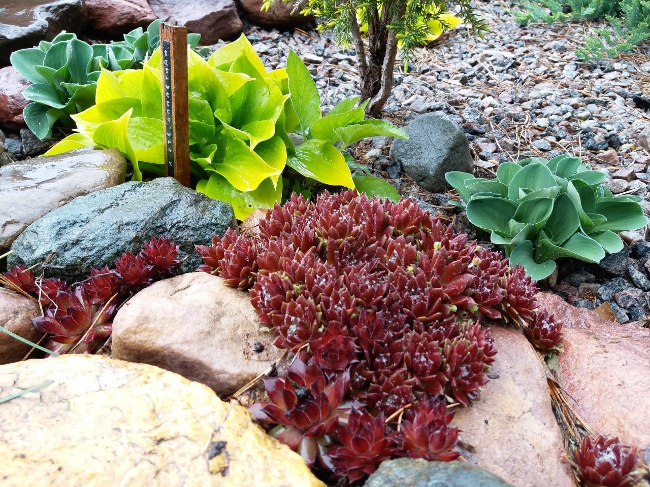 Альпийская горка с каменной розой молодило