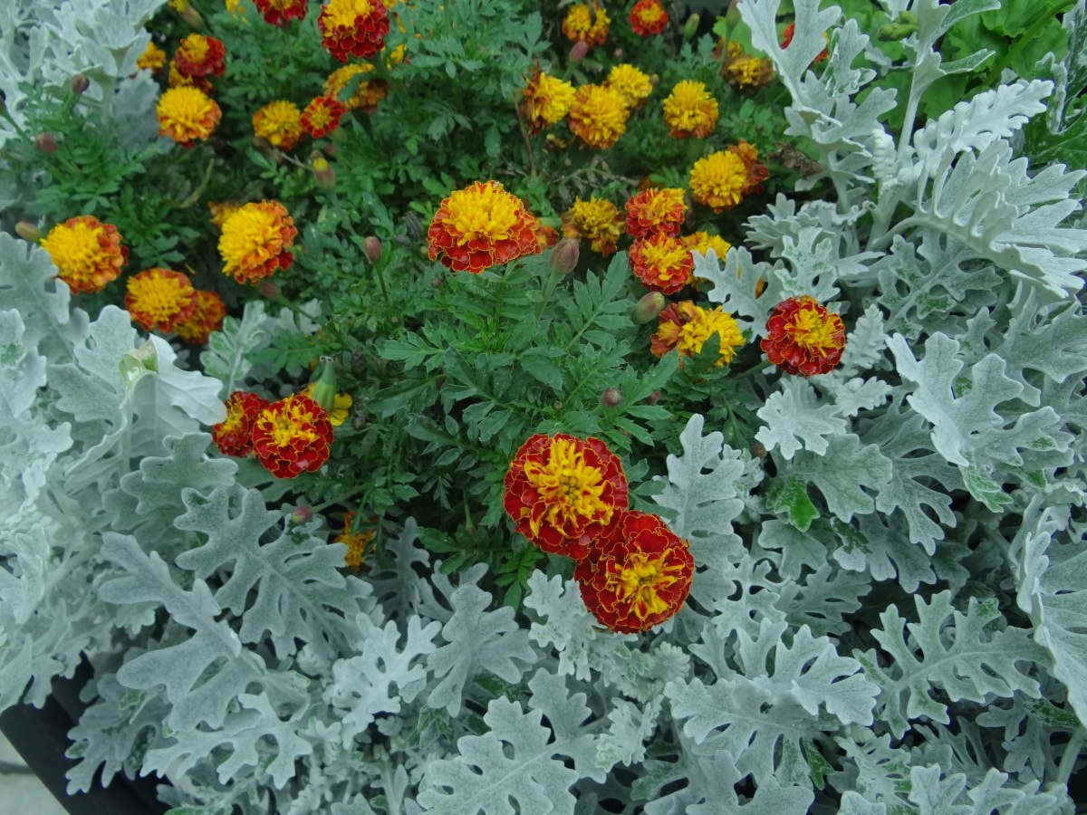 Бархатцы и цинерария на клумбе