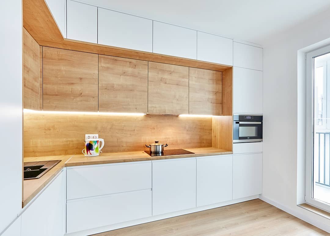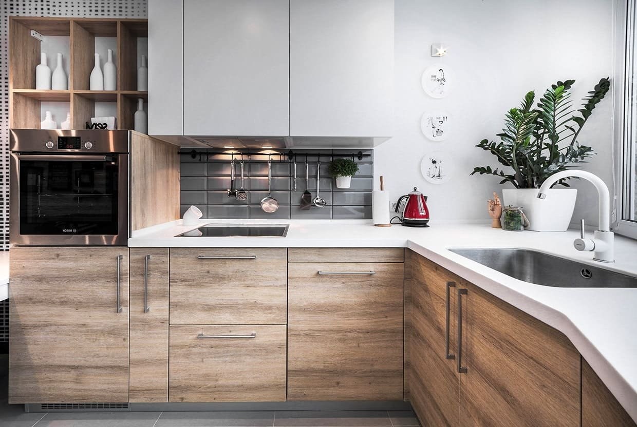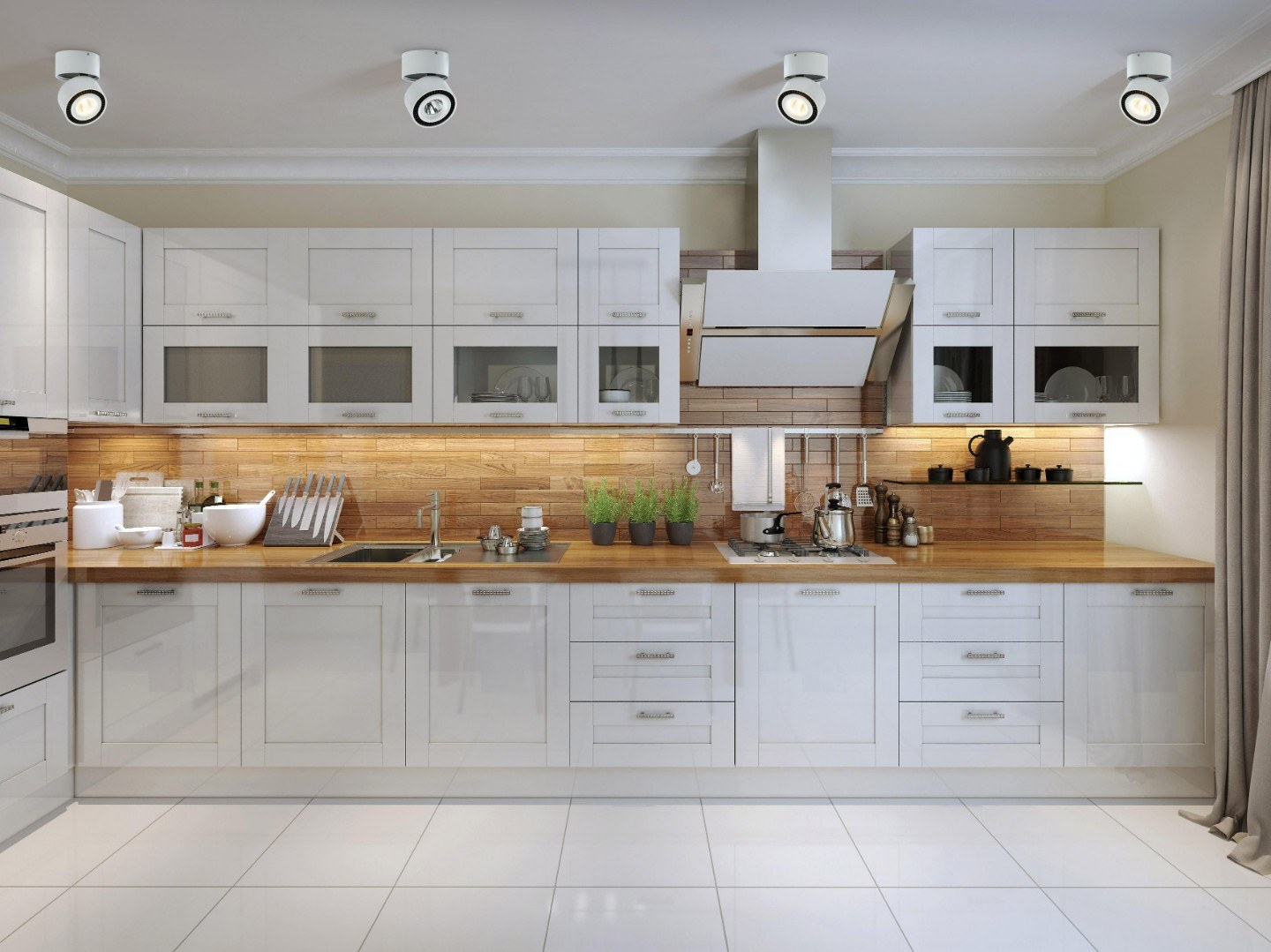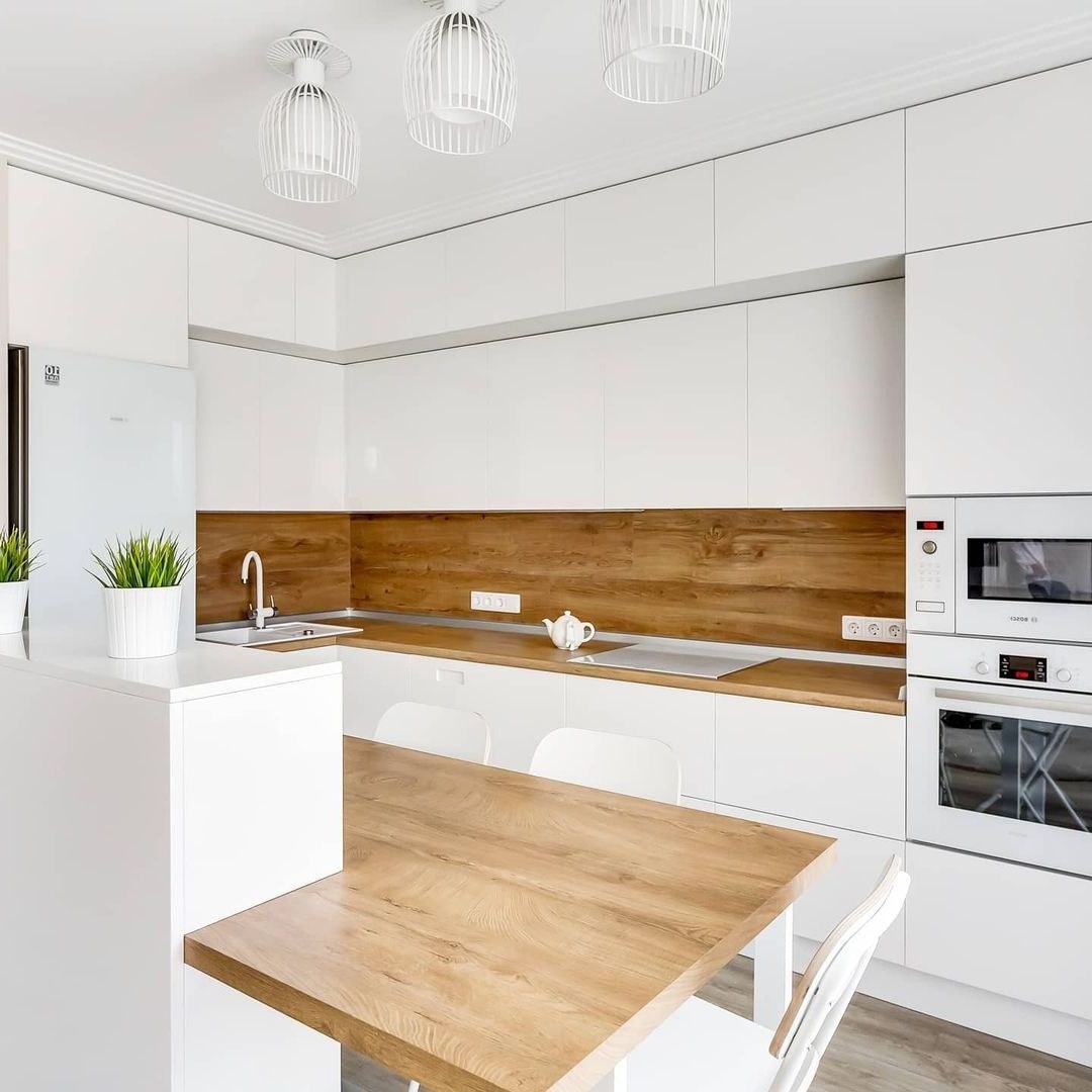 Белая кухня с деревянной столешницей в скандинавском стиле