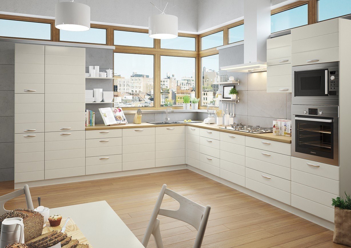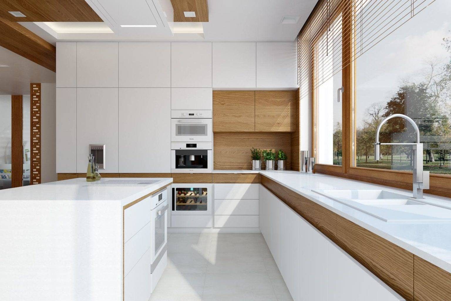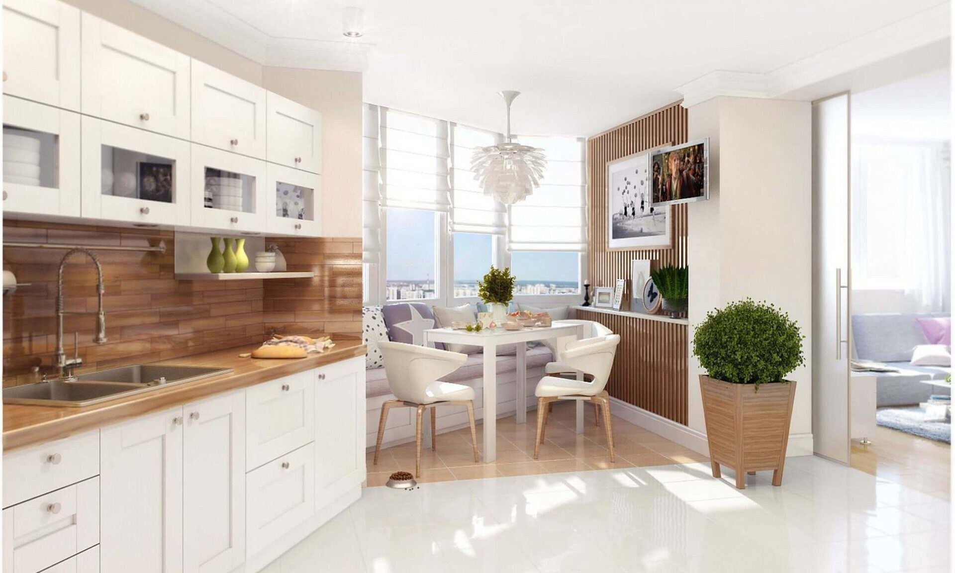 Белая кухня с деревянной столешницей в скандинавском стиле