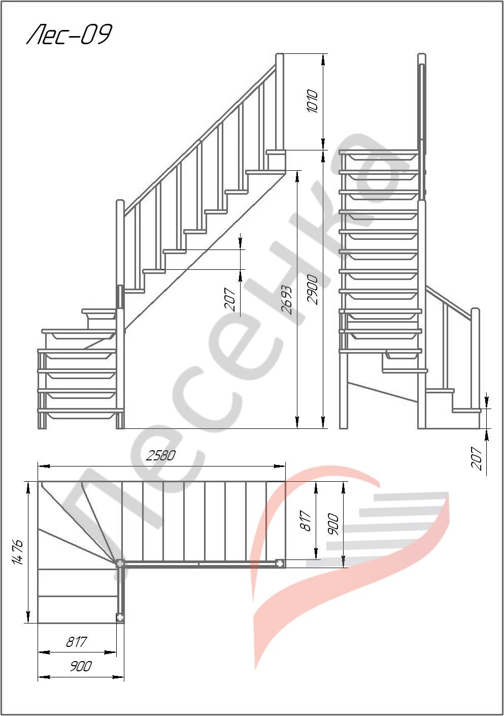 Лестница на тетиве поворотная на 90 с забежными ступенями