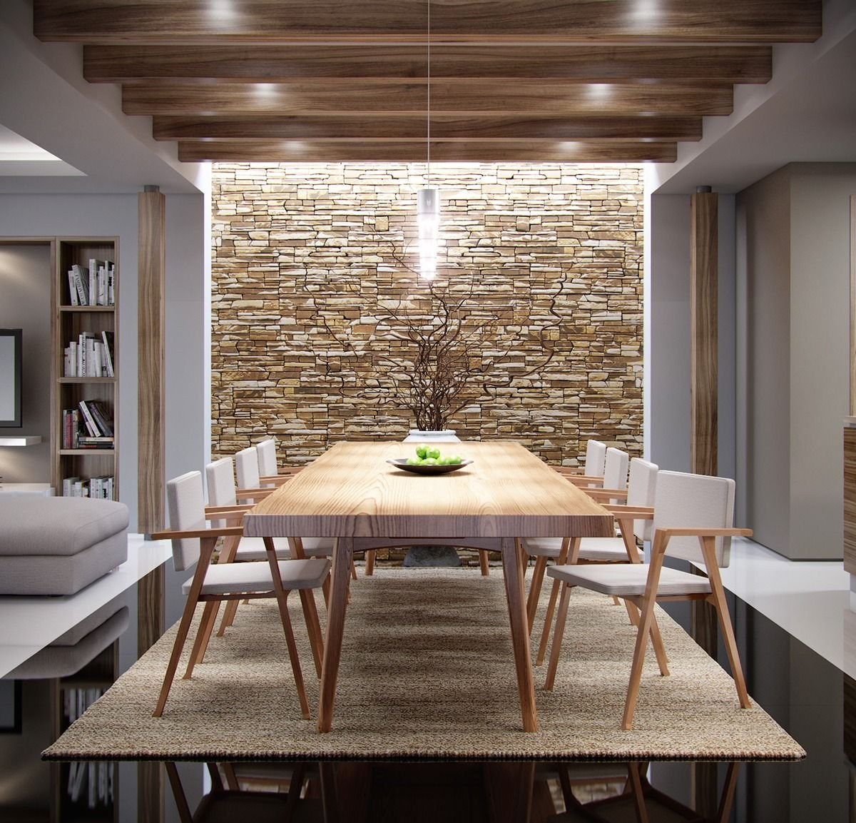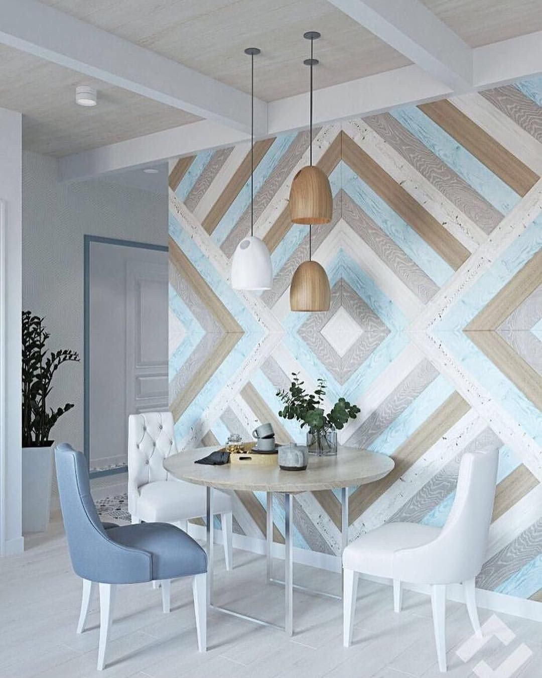 Обеденный стол у стены в интерьере