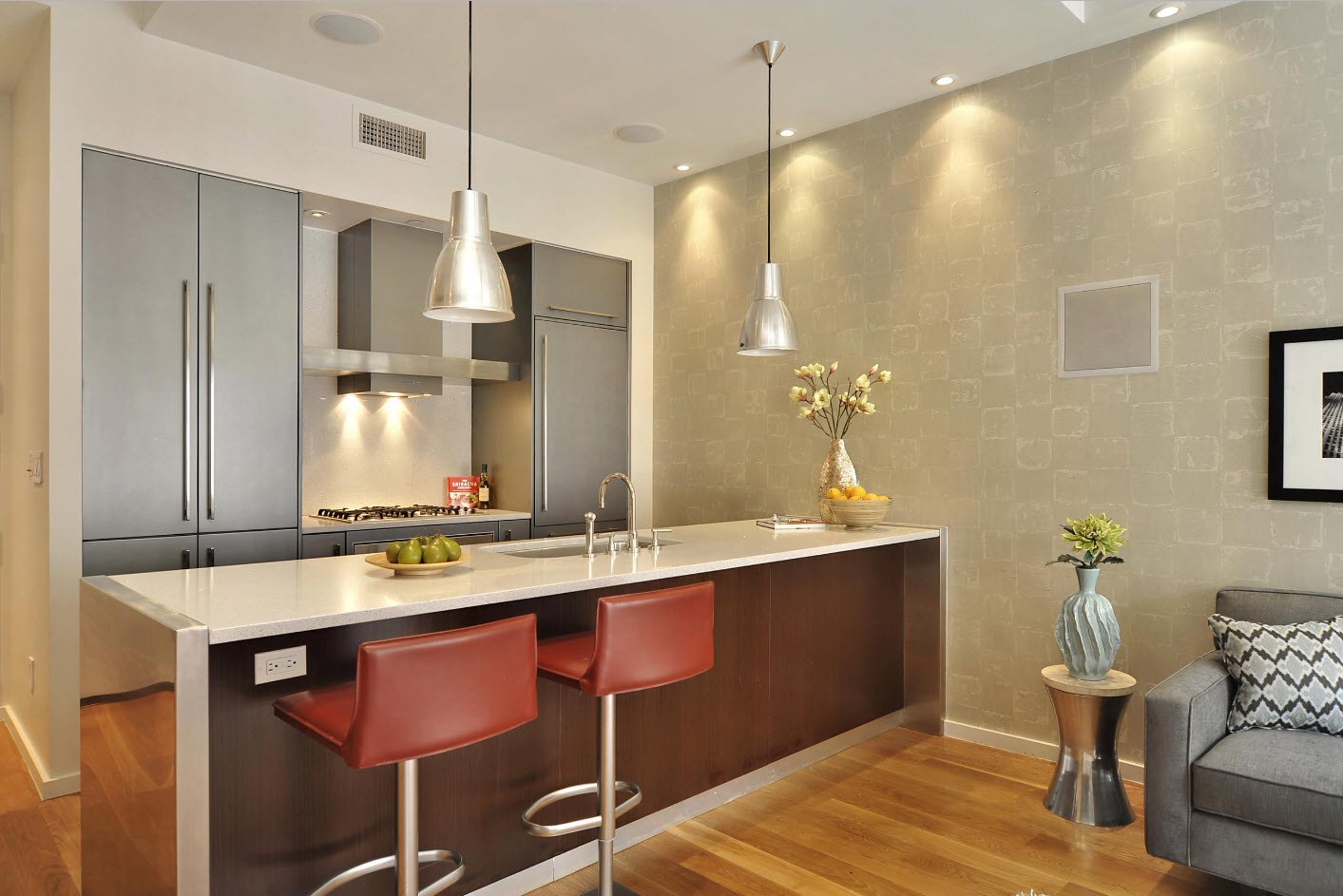 Интерьер кухни с комбинированными обоями