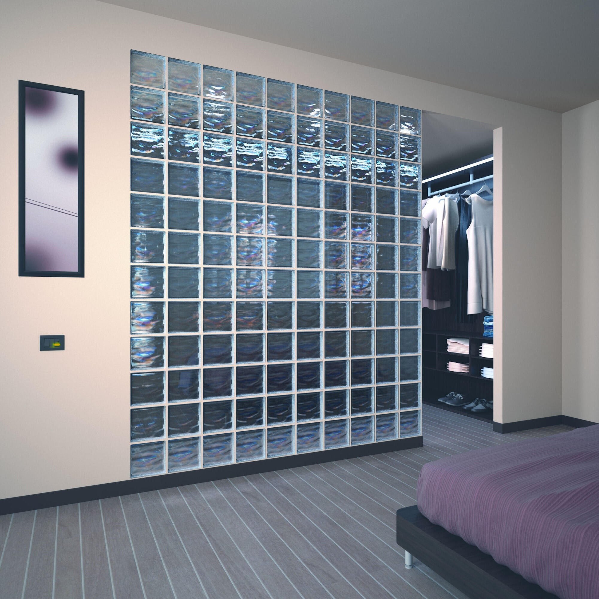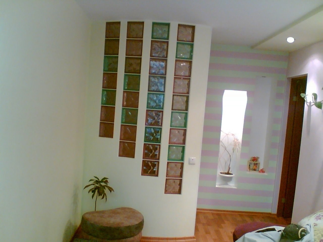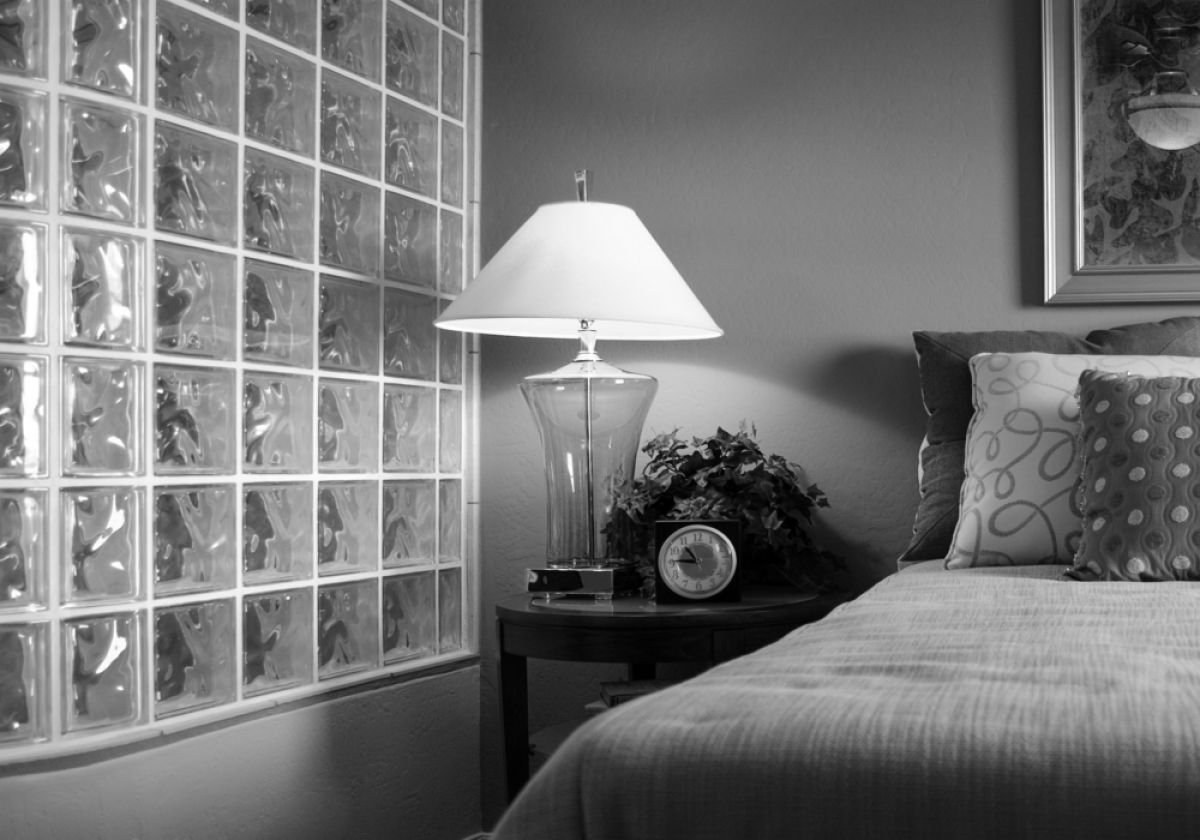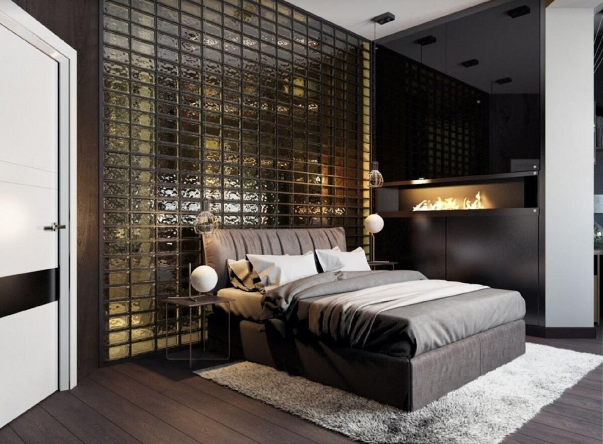 Стена из стеклоблоков в спальне