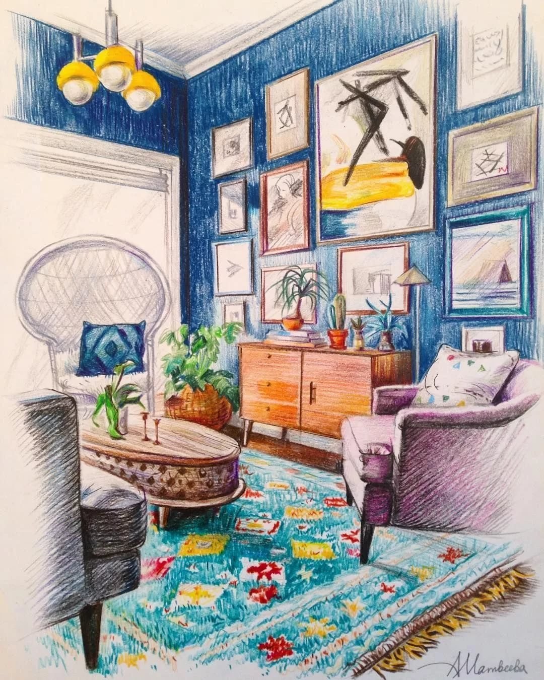 Интерьер цветными карандашами