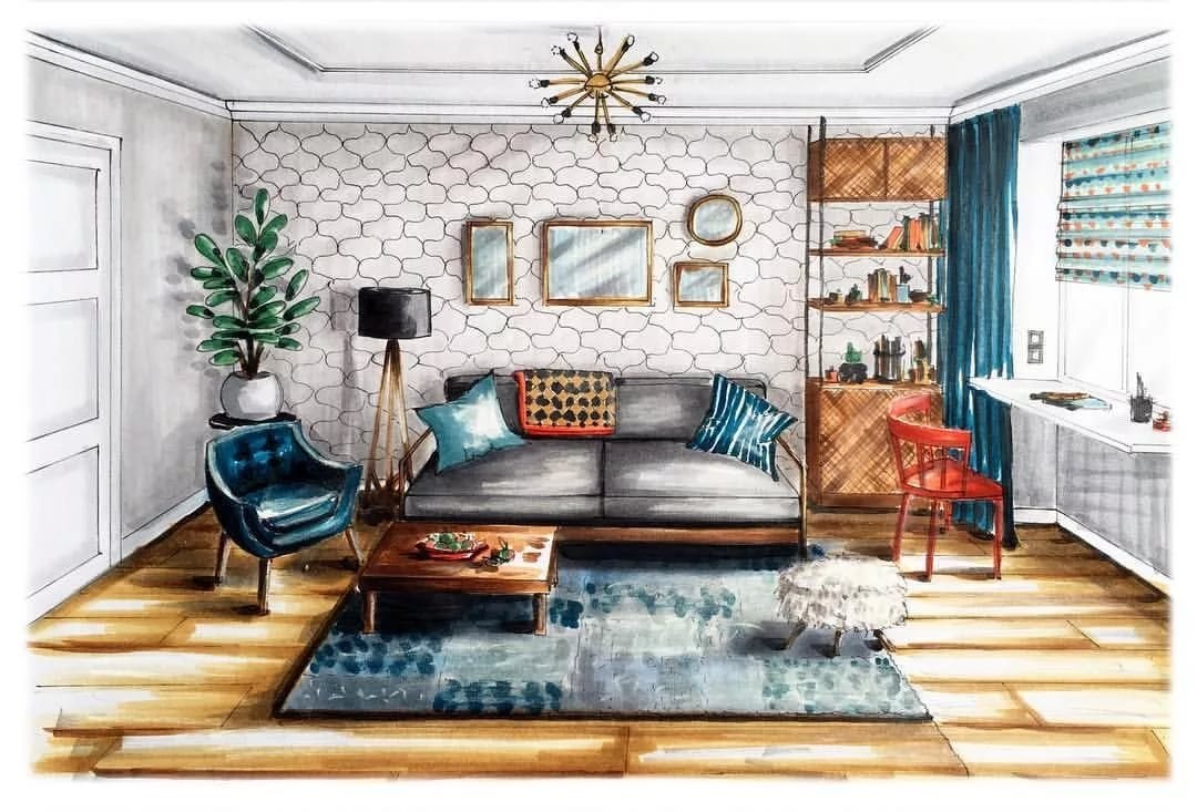 Эскиз интерьера цветными карандашами