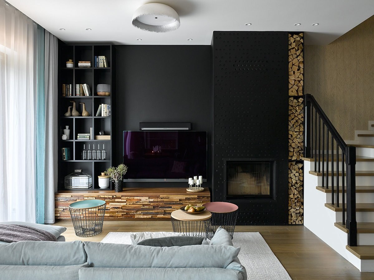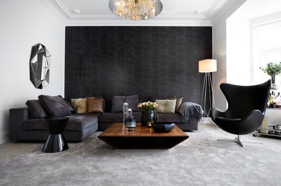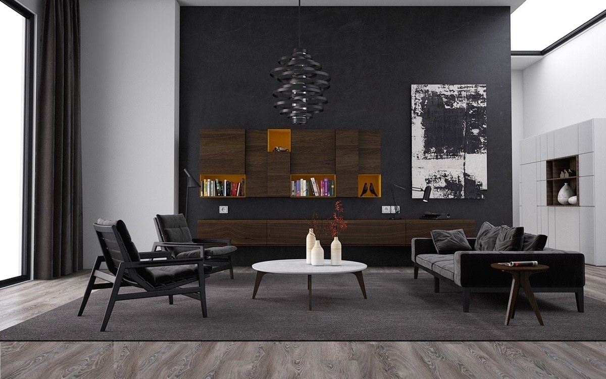 Черная стена в интерьере гостиной (65 фото)