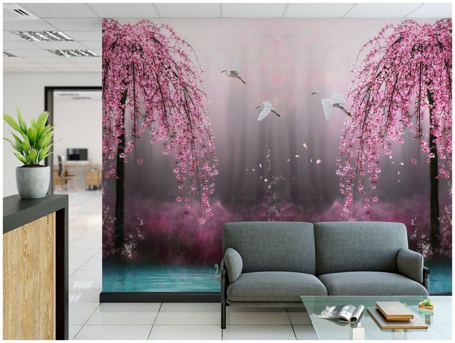 Обои сакура в интерьере гостиной с чем сочетаются (50 фото)