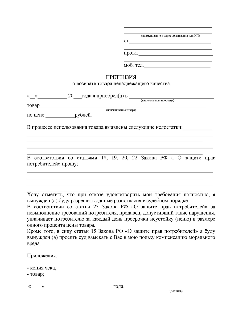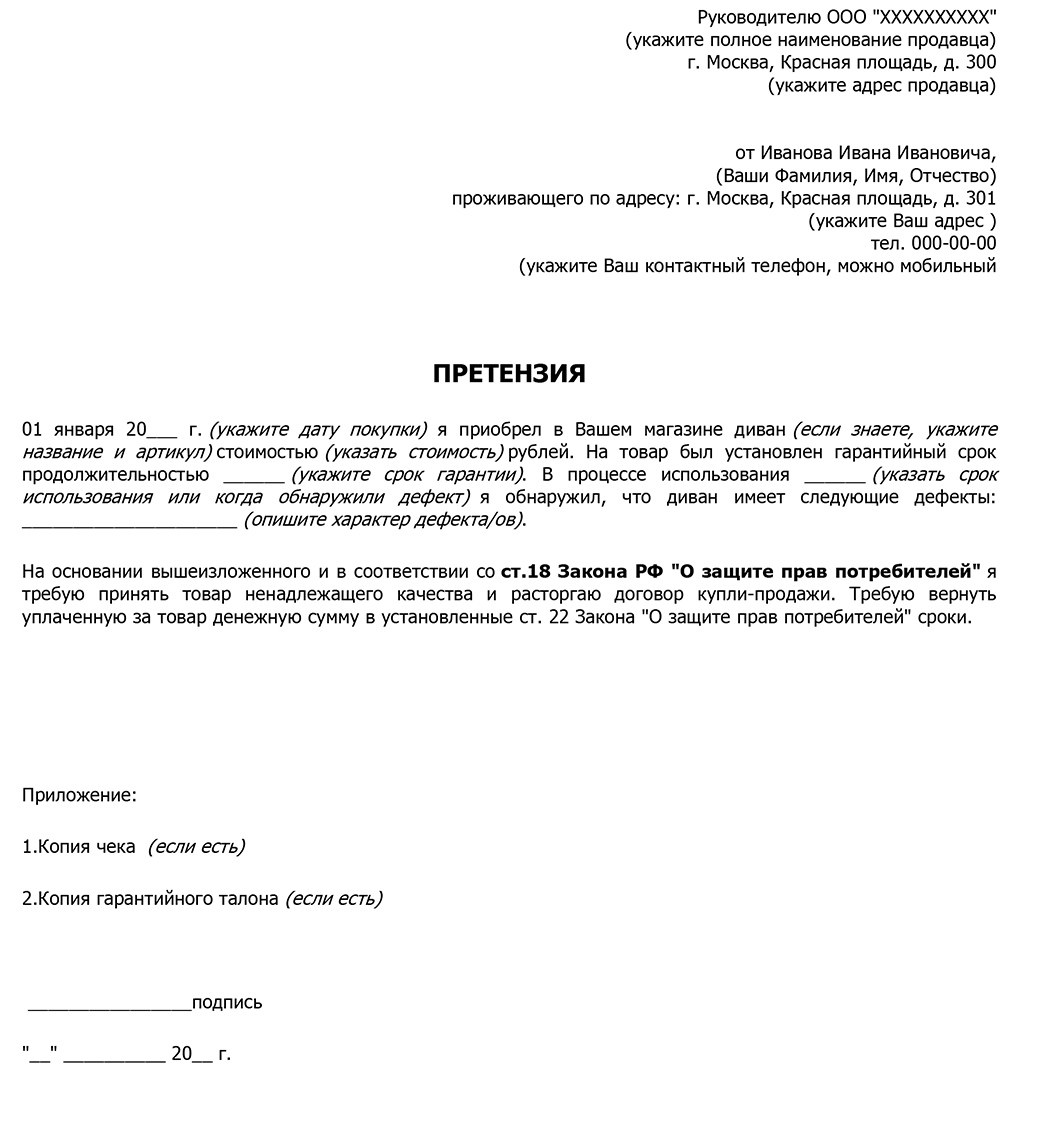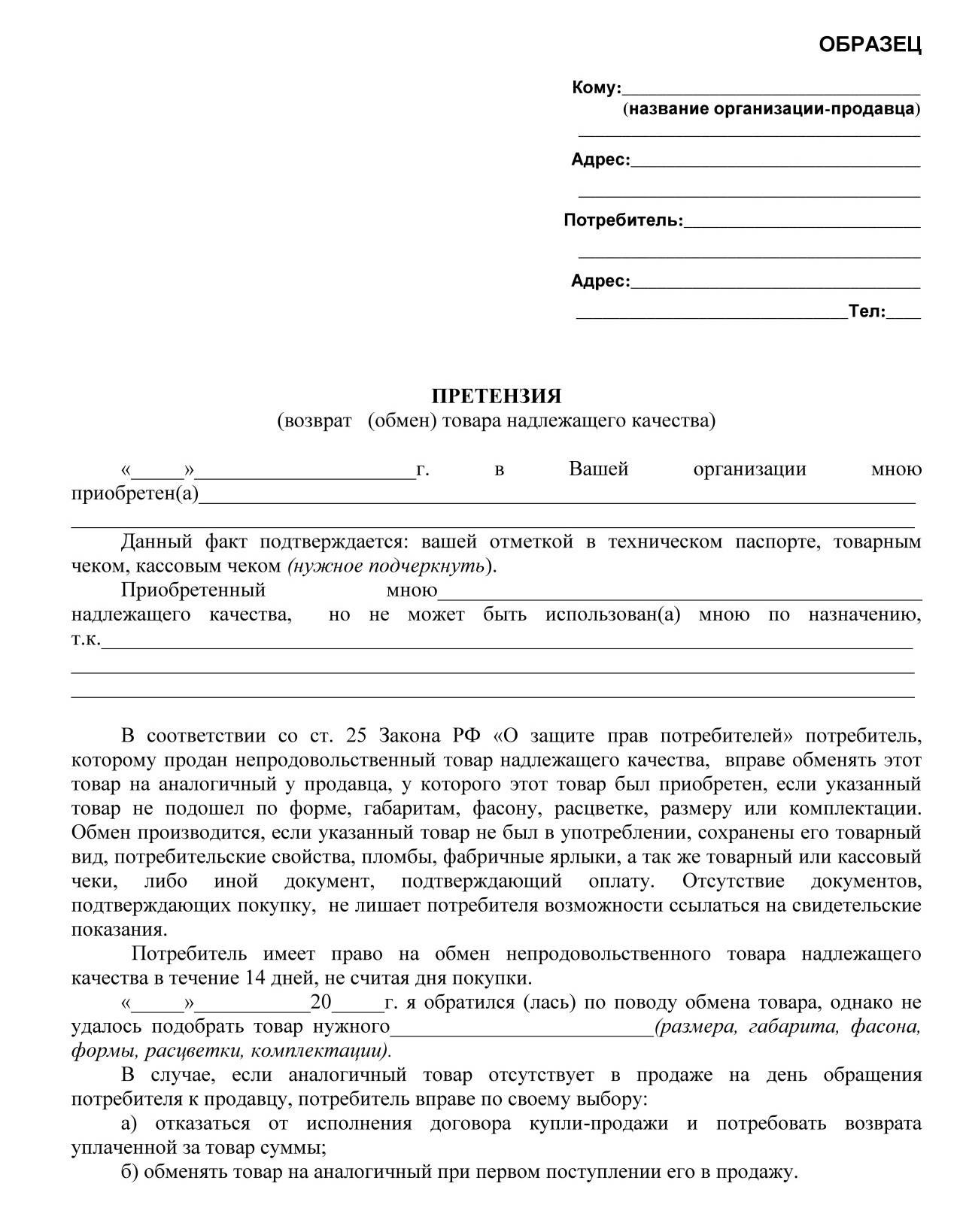 Образец претензии возврата товара ненадлежащего