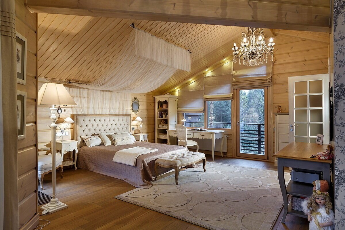 Интерьер спальни в доме из клееного бруса