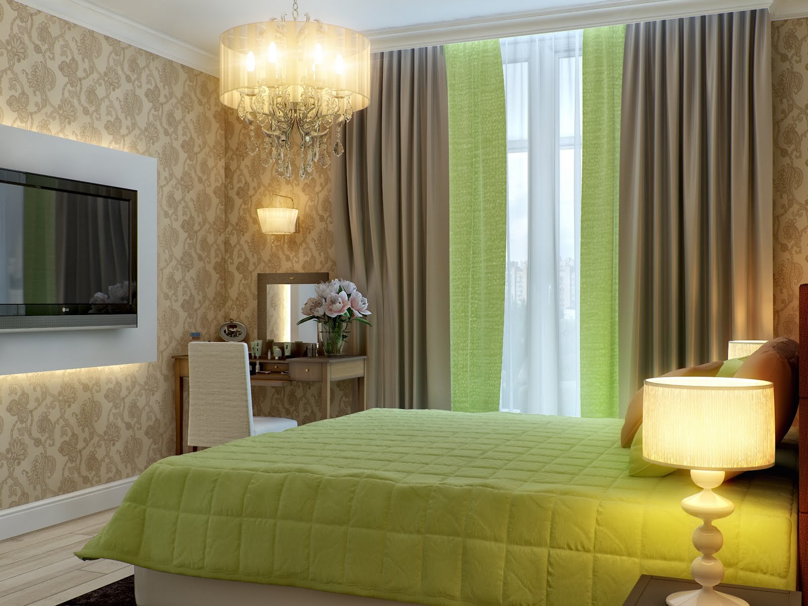 Спальня с зелеными шторами