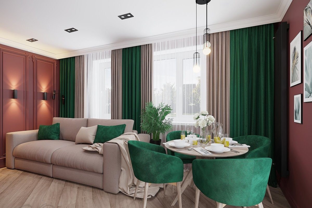 Изумрудные шторы в интерьере гостиной