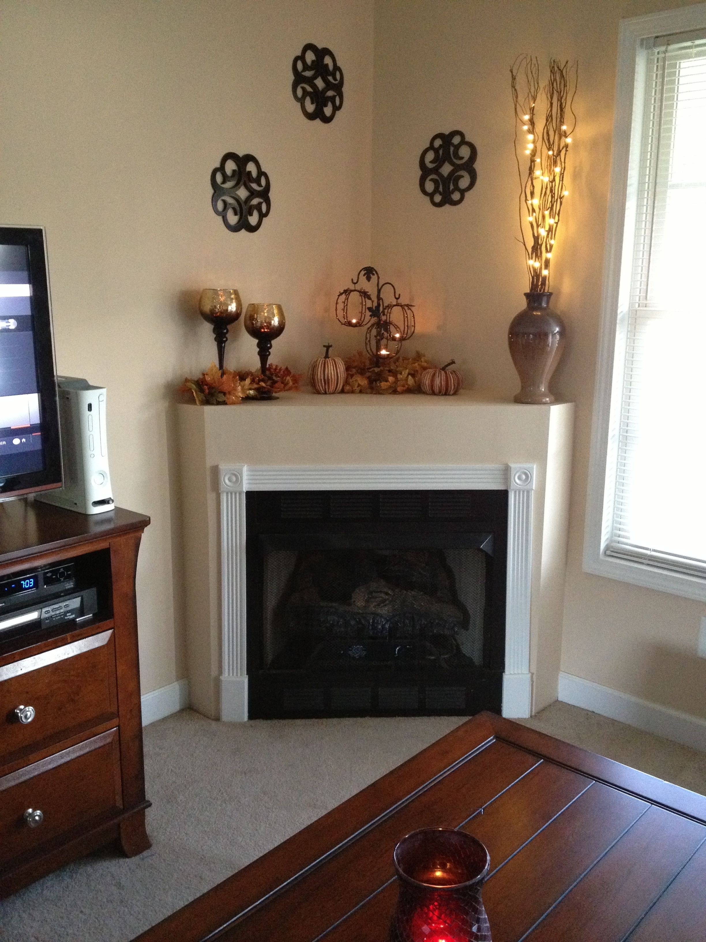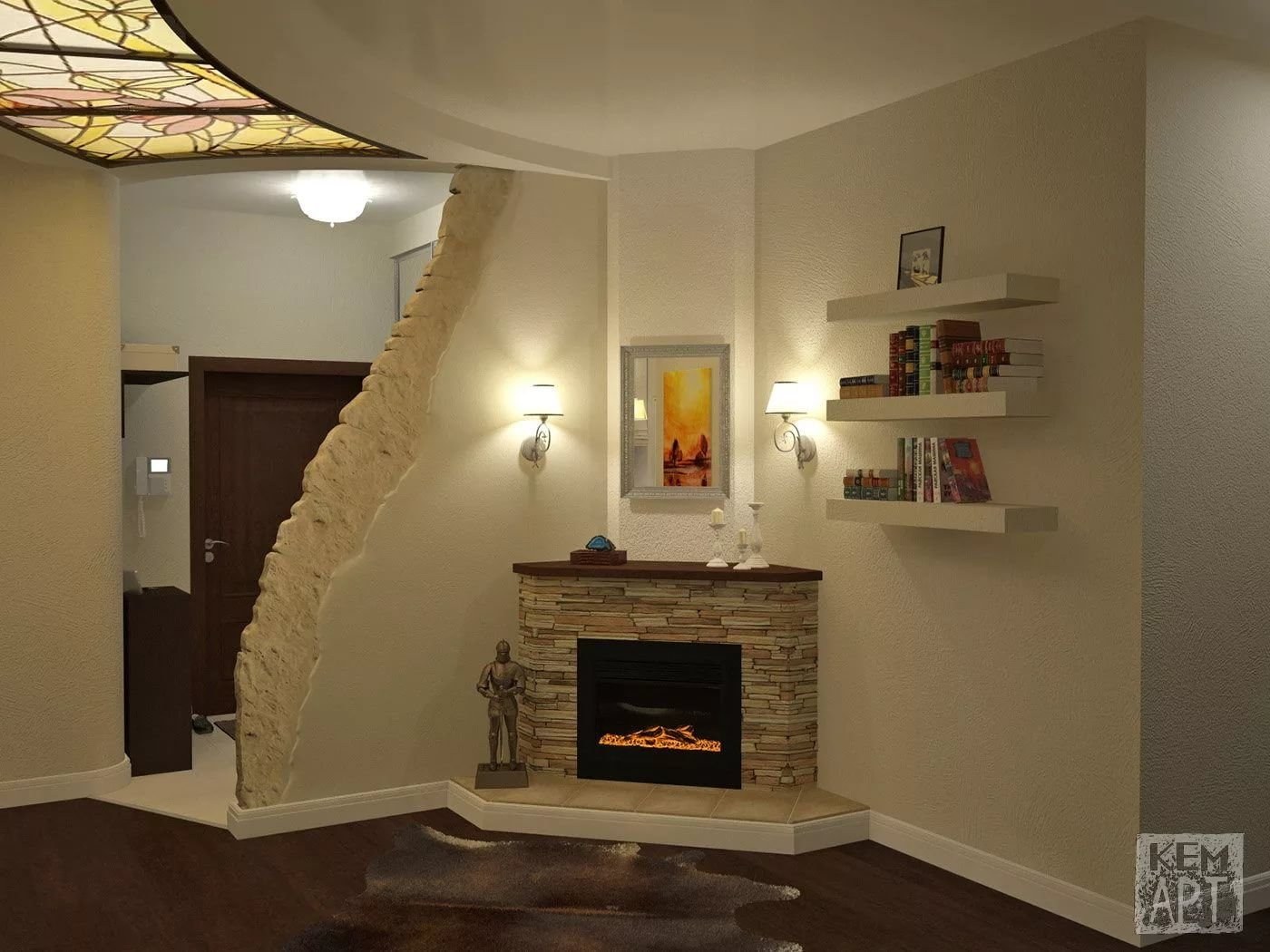 Угловой камин в гостиной