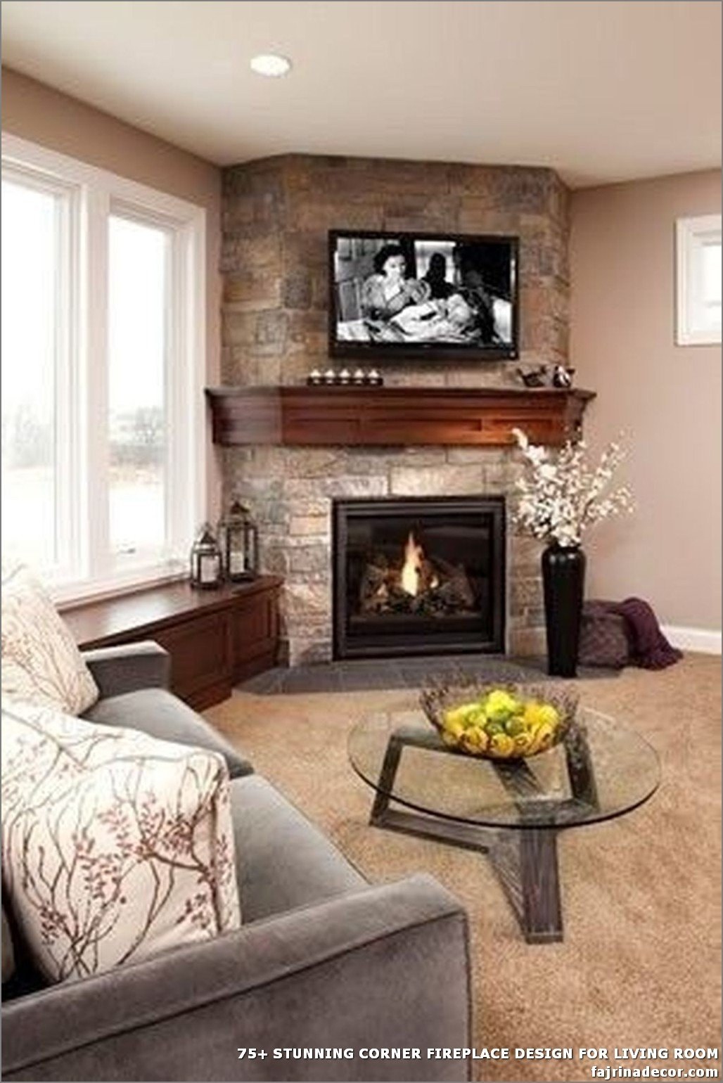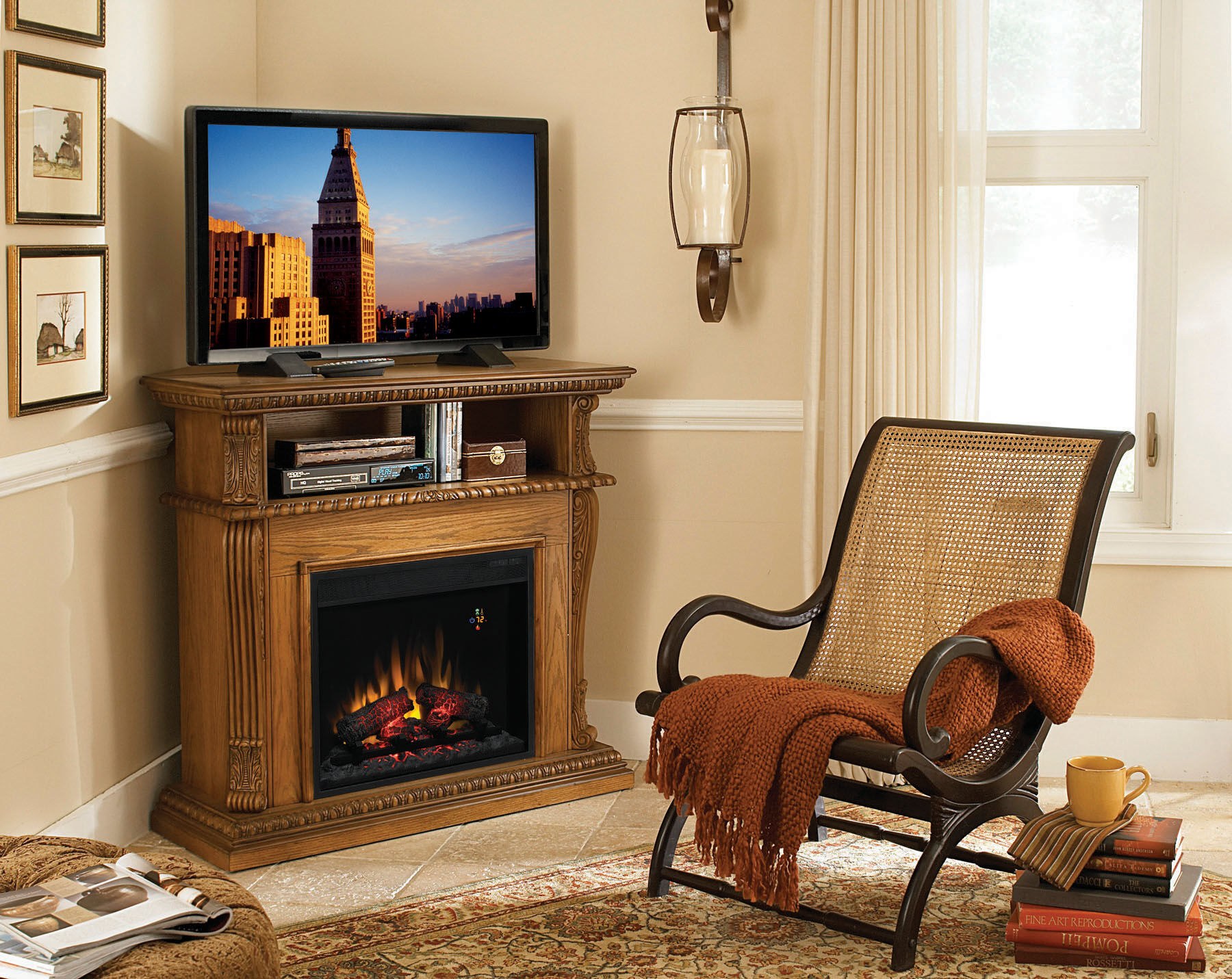 Угловой электрокамин в интерьере гостиной (55 фото)