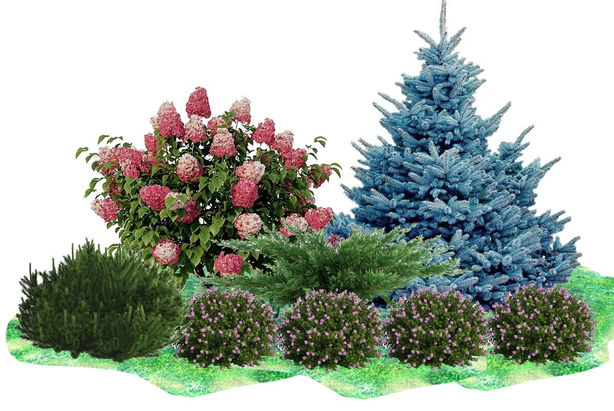 Миксбордер с гортензией метельчатой и хвойниками