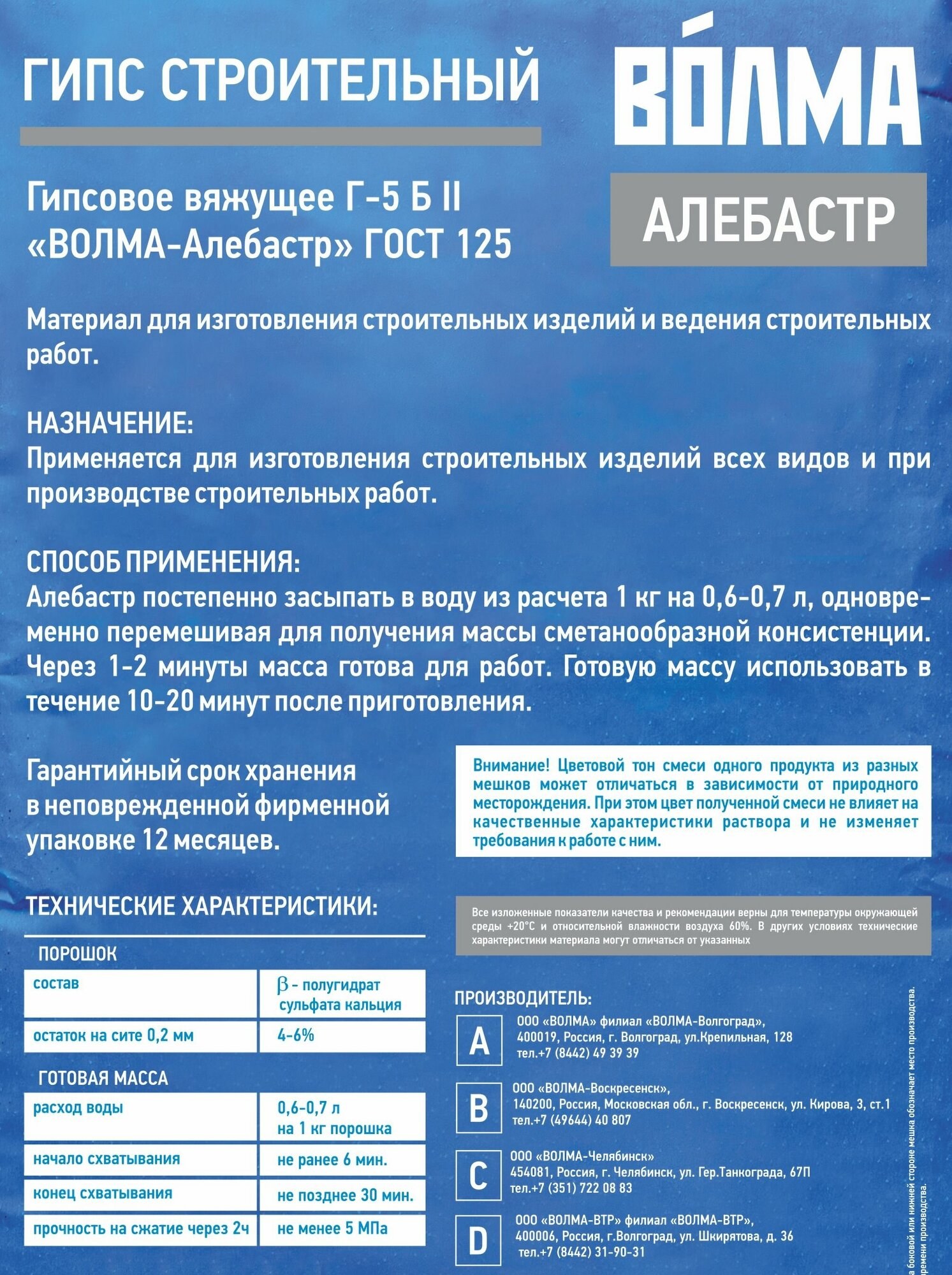 Гипс строительный (30кг) / Волма алебастр гипс строительный (30кг)