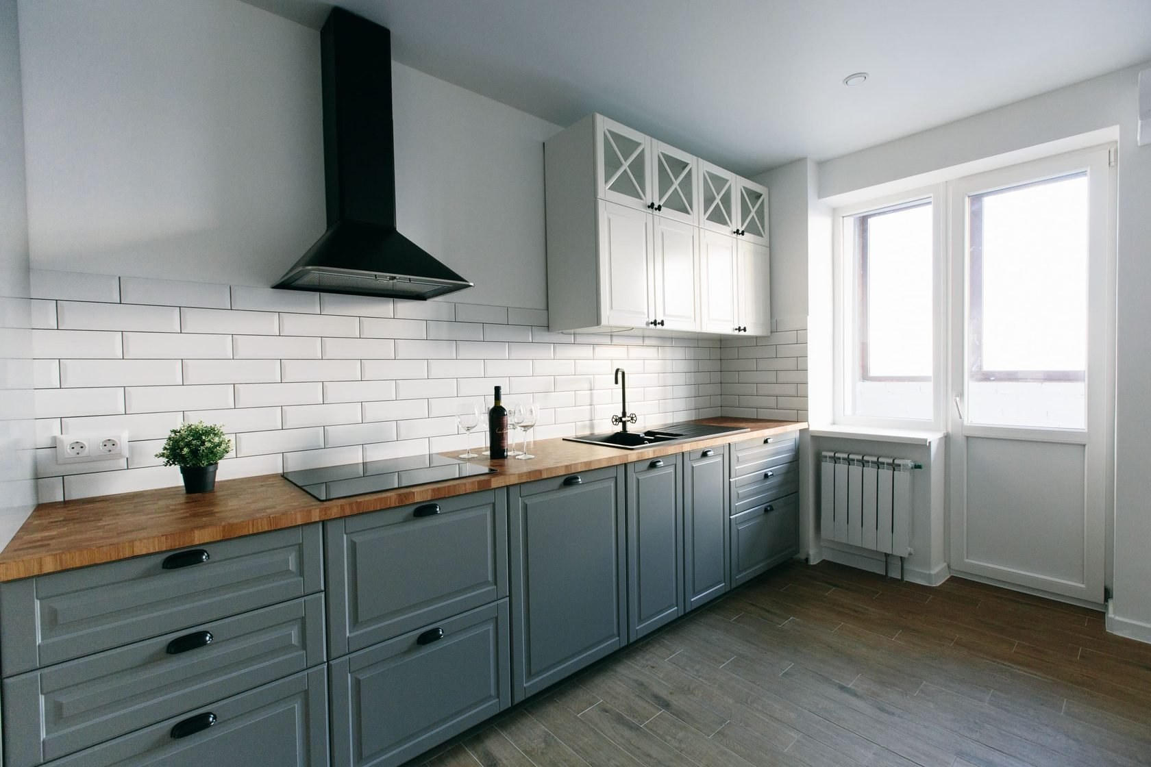 Сканди кухня серая с деревянной столешницей