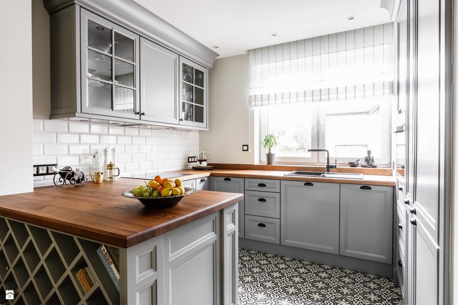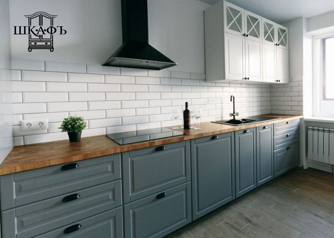Серо белая кухня с деревянной столешницей