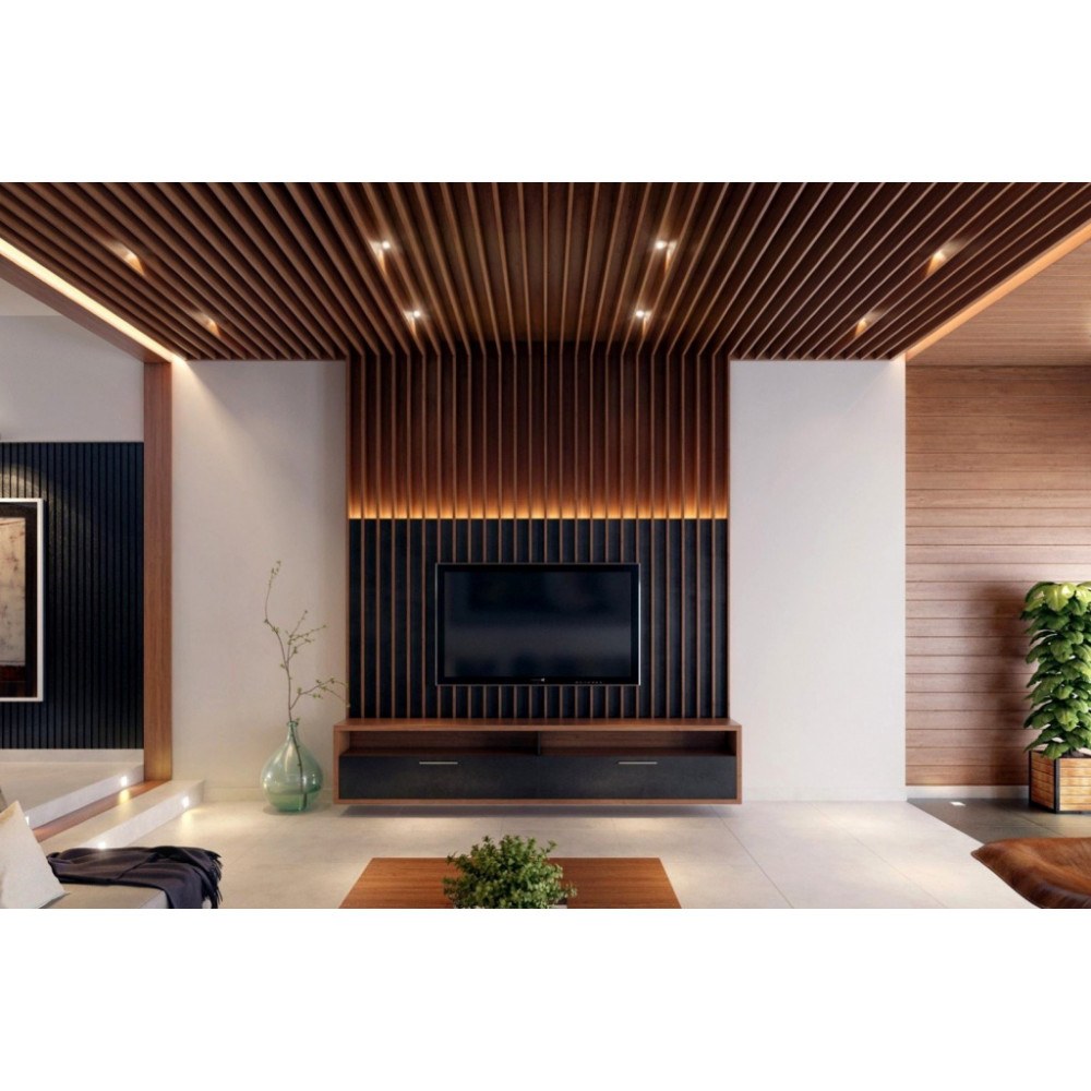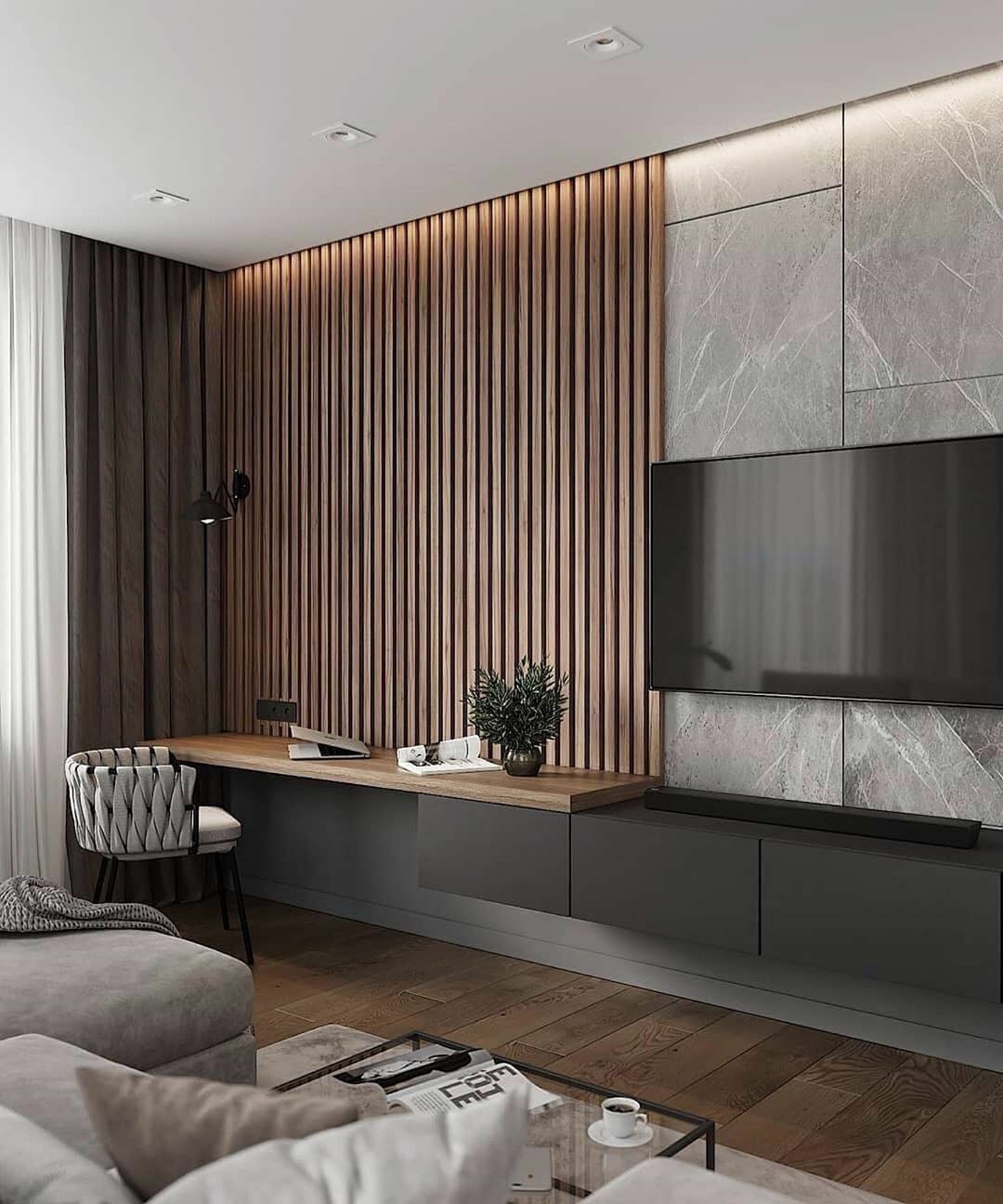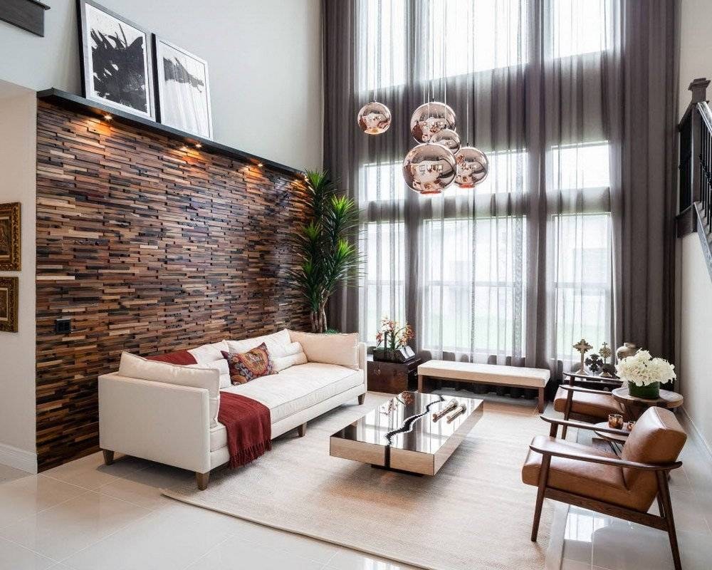 Гостиная с деревянными рейками