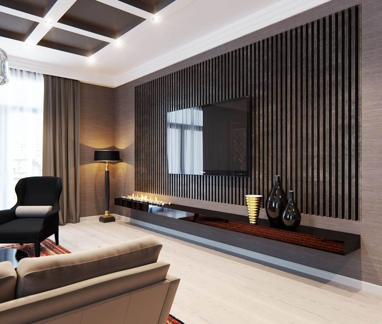 Деревянные рейки на стене в гостиной