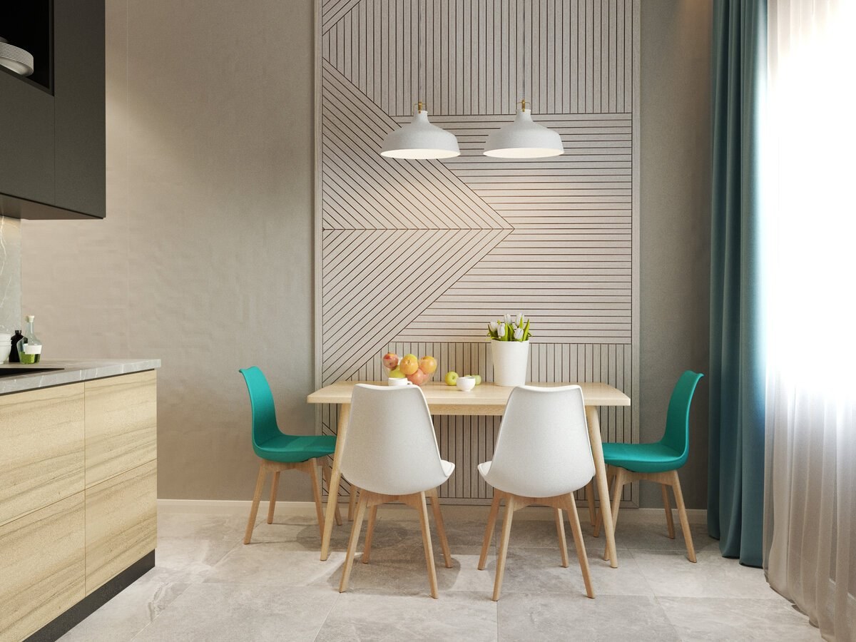 Деревянные рейки в интерьере на стене на кухне
