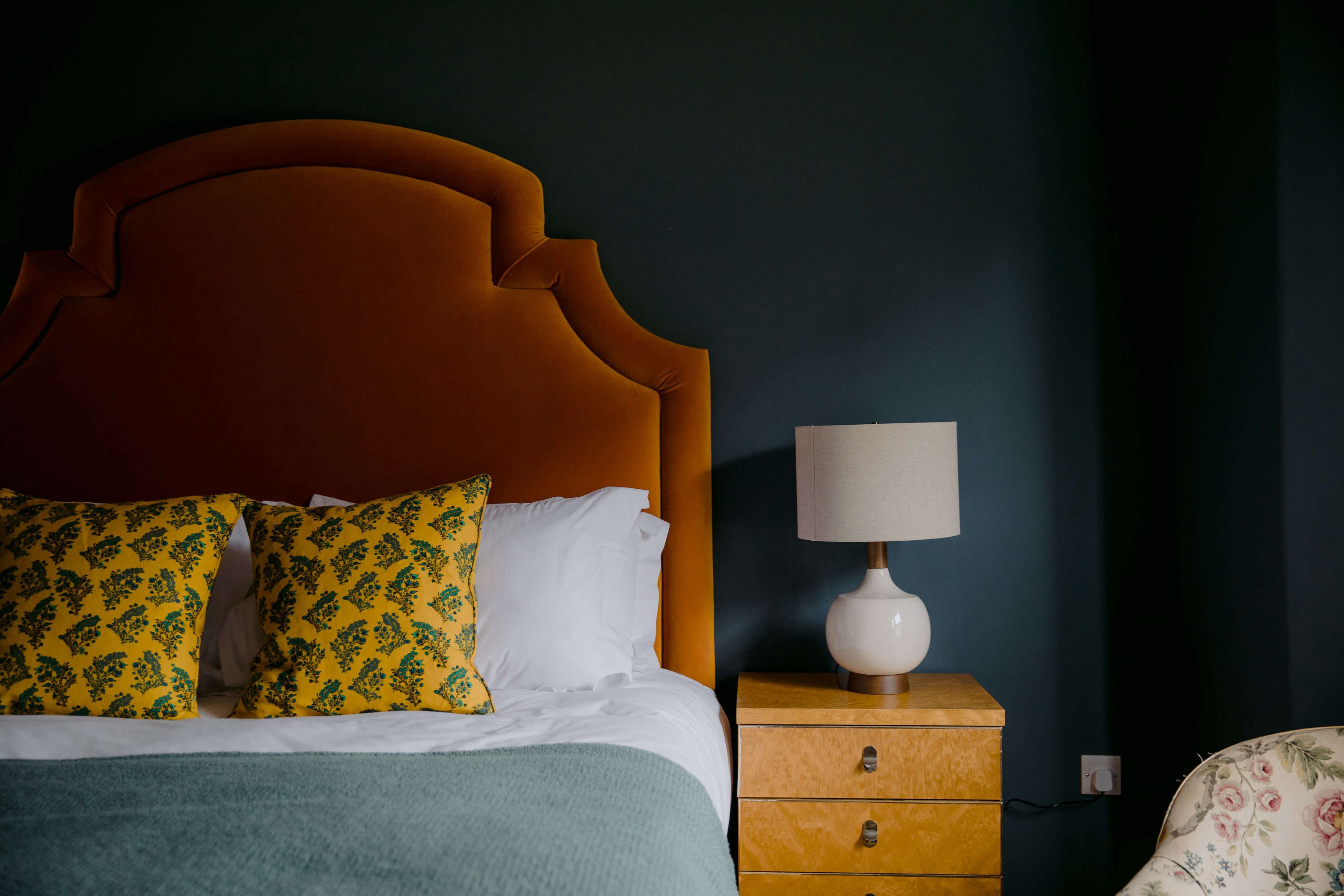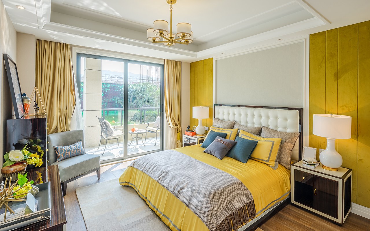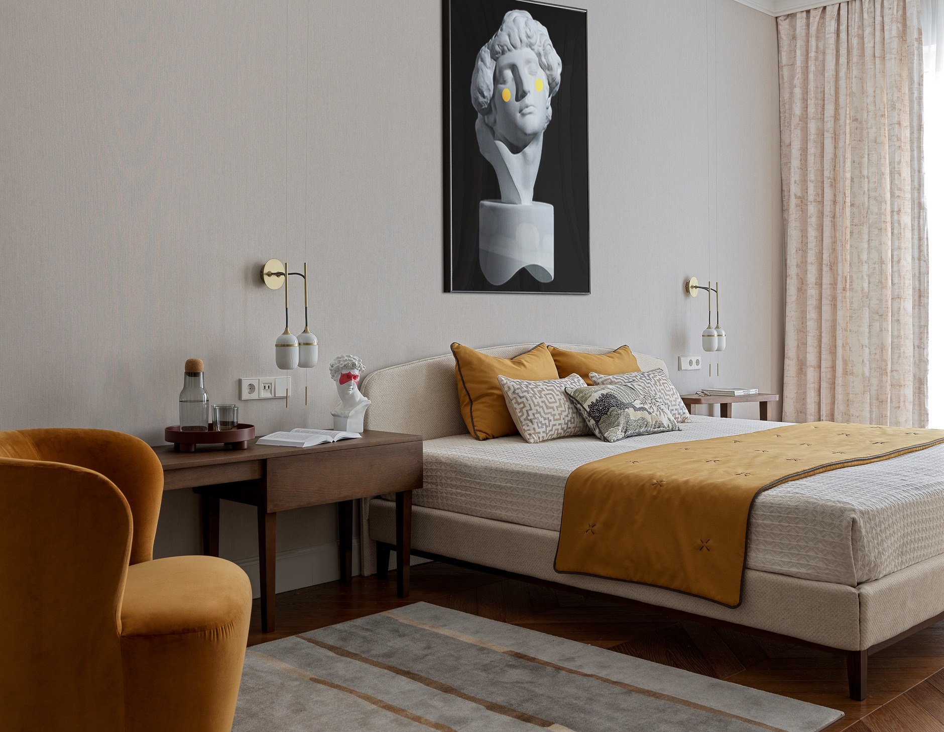 Горчичный цвет в интерьере спальни