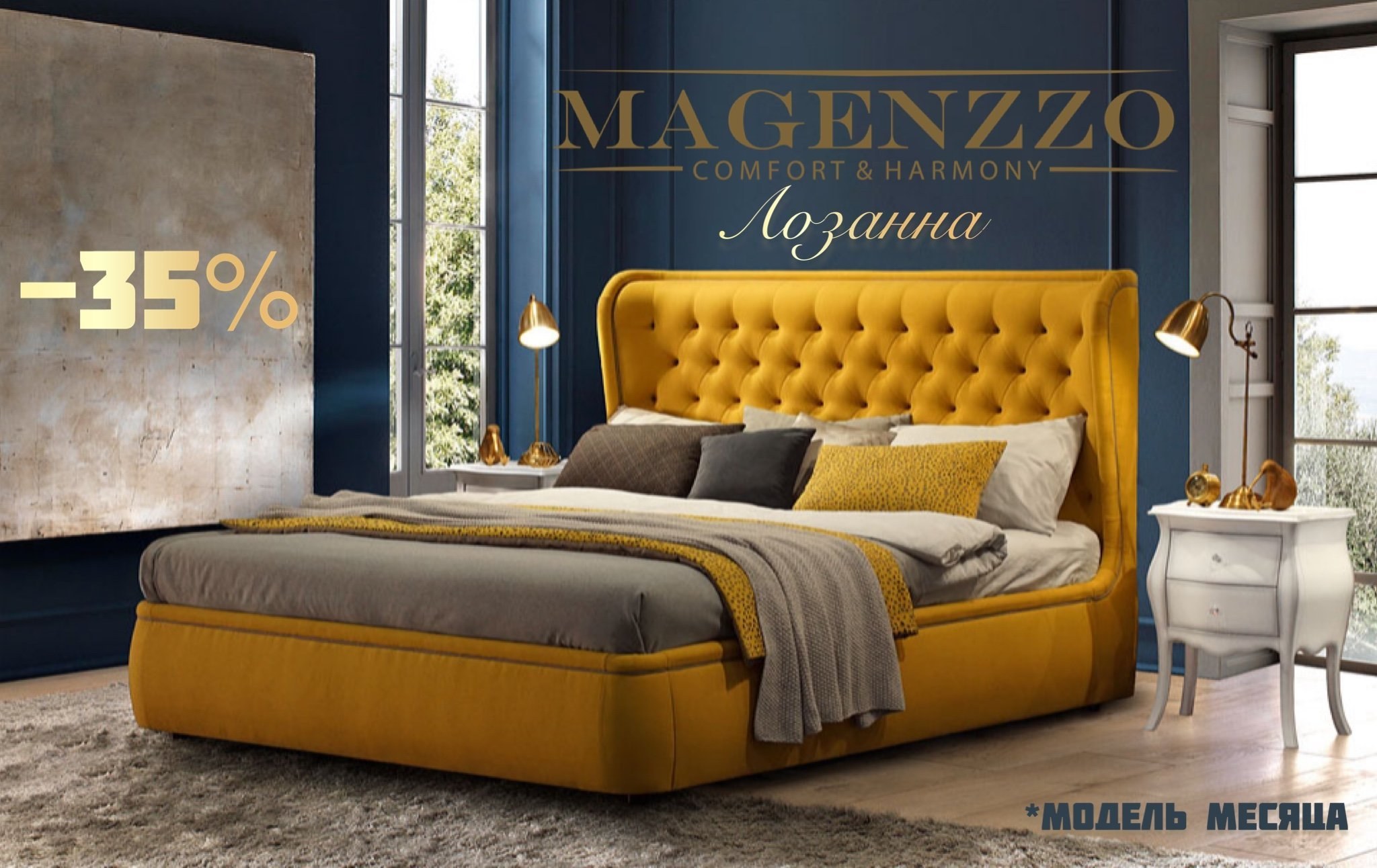 Кровать с желтым изголовьем