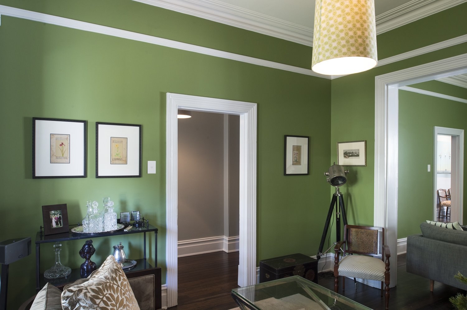 Оливковые стены в интерьере гостиной