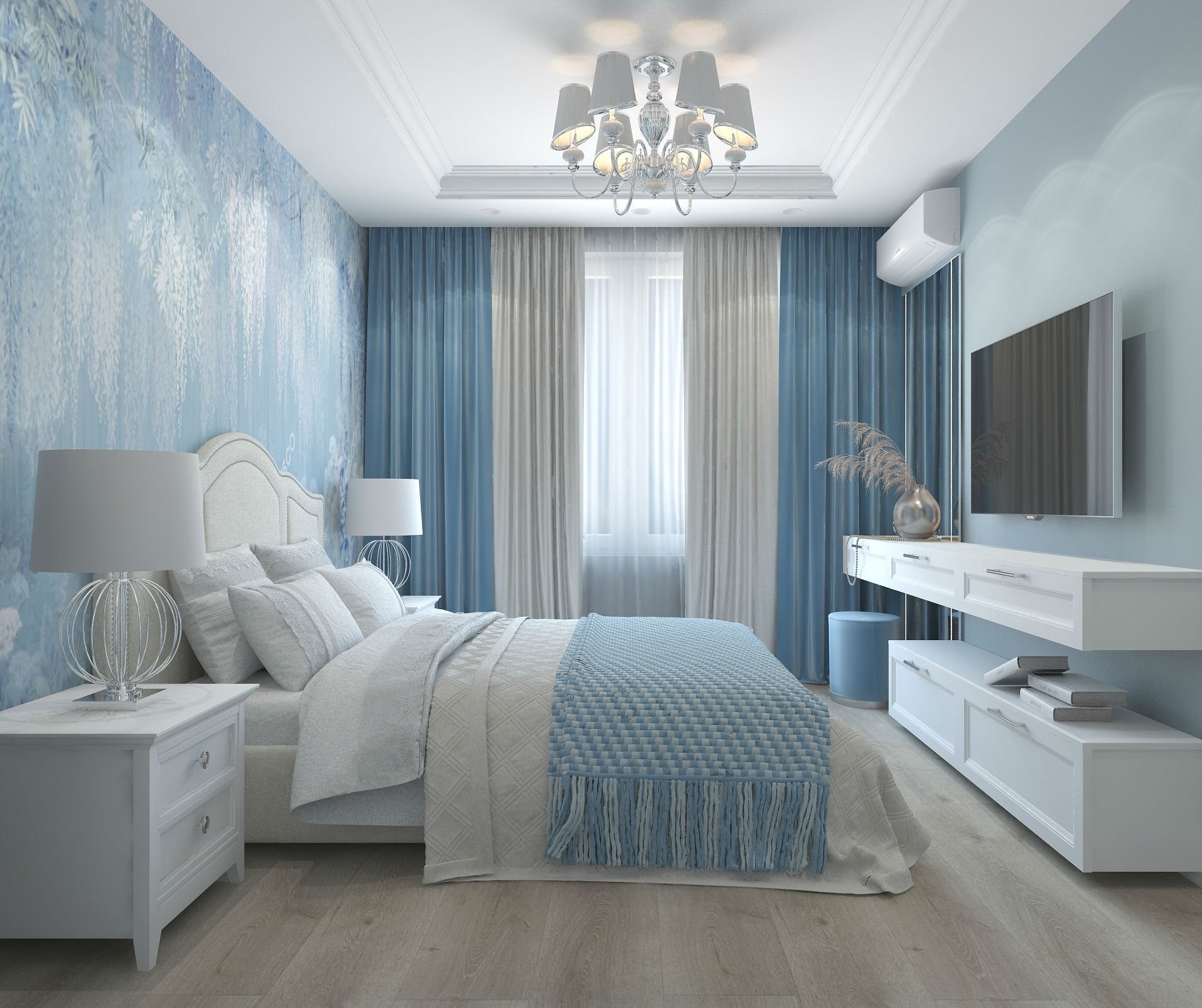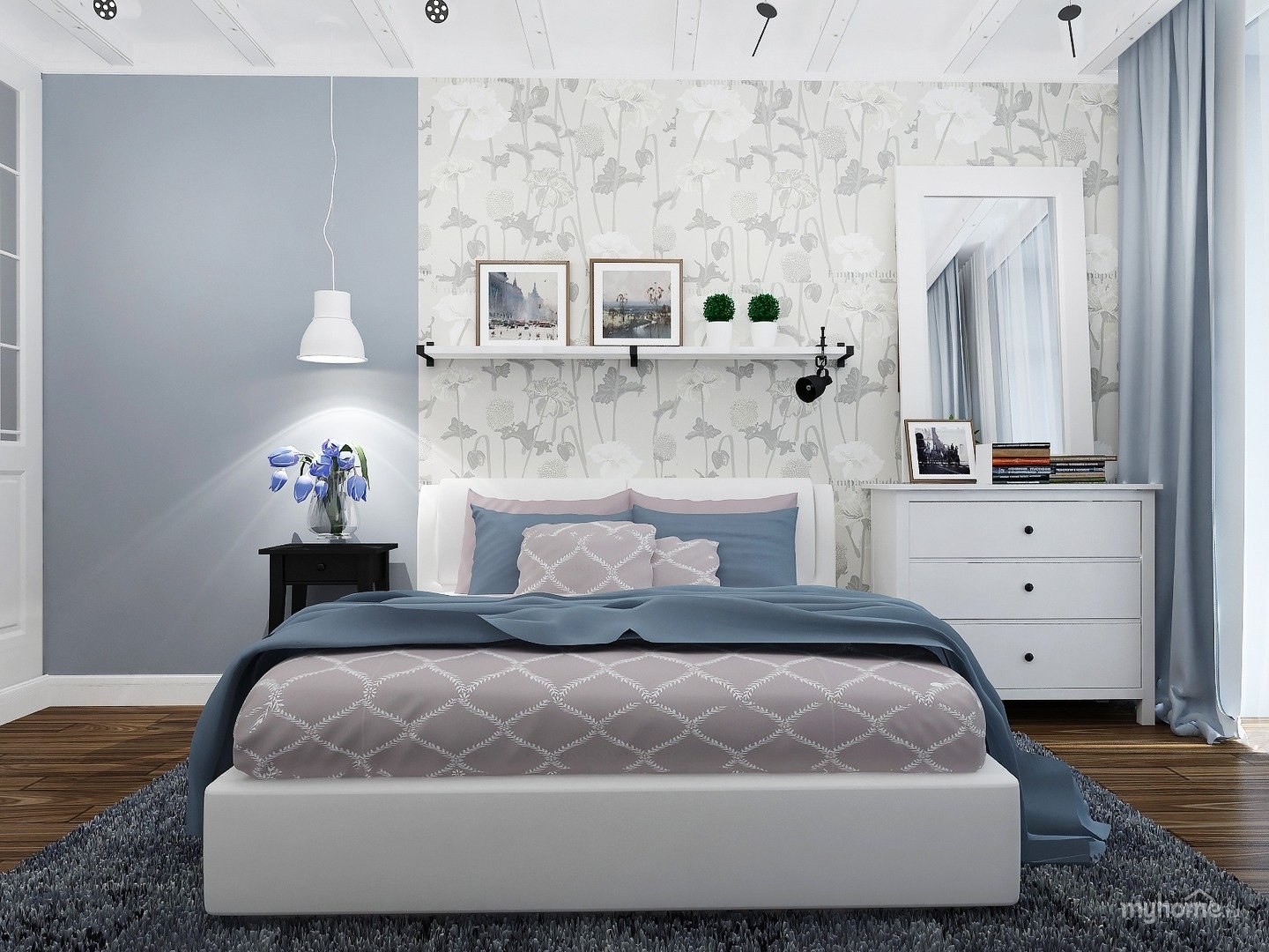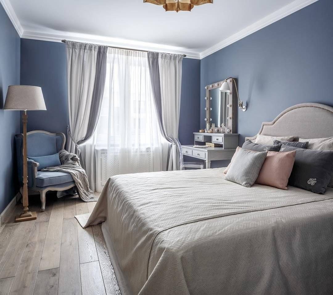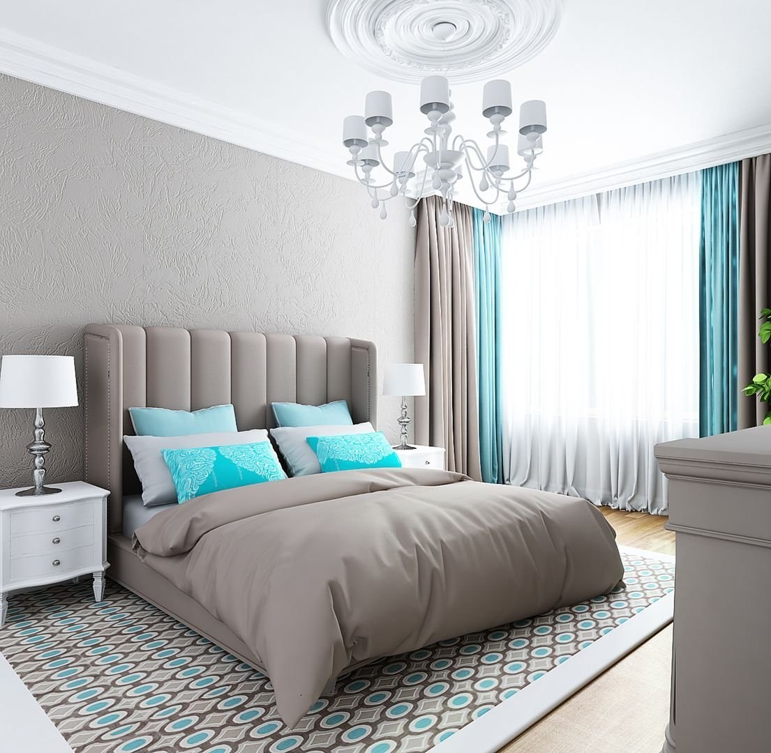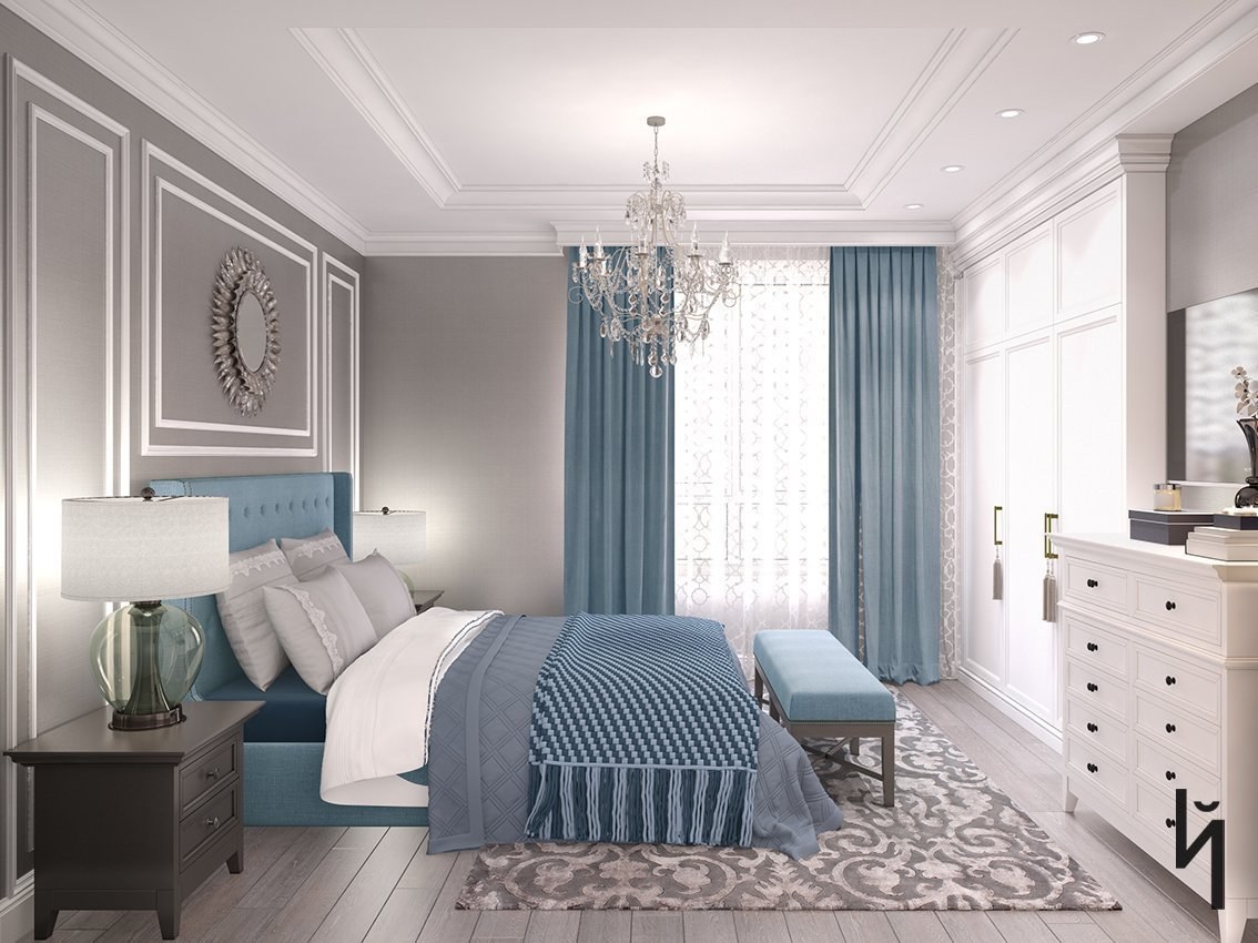 Спальня в серо голубых тонах с белой мебелью (58 фото)
