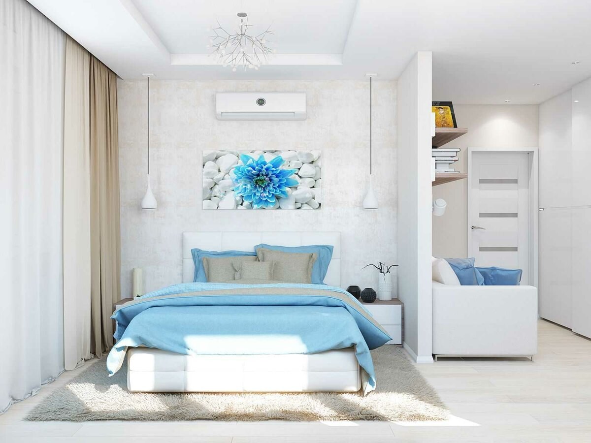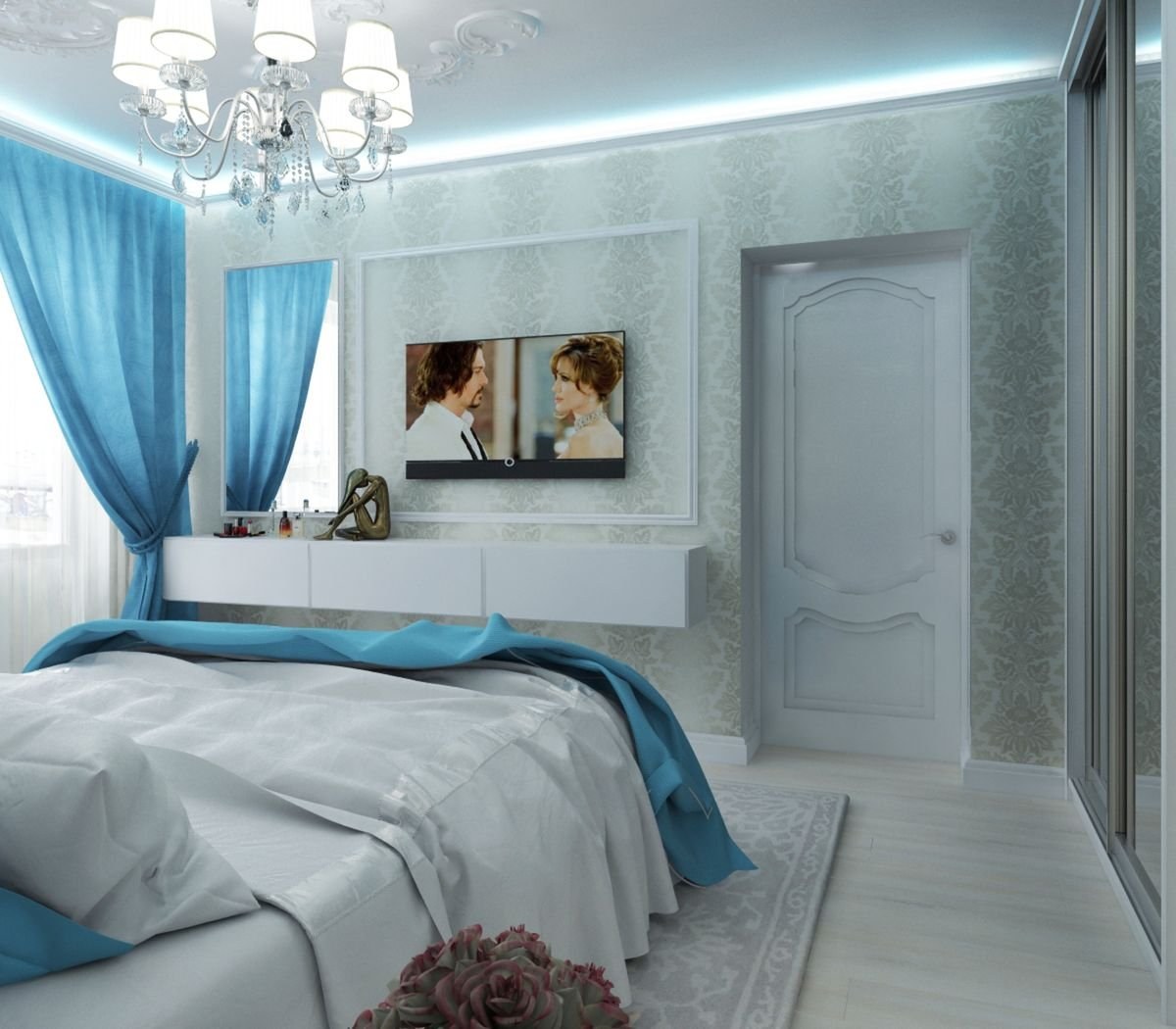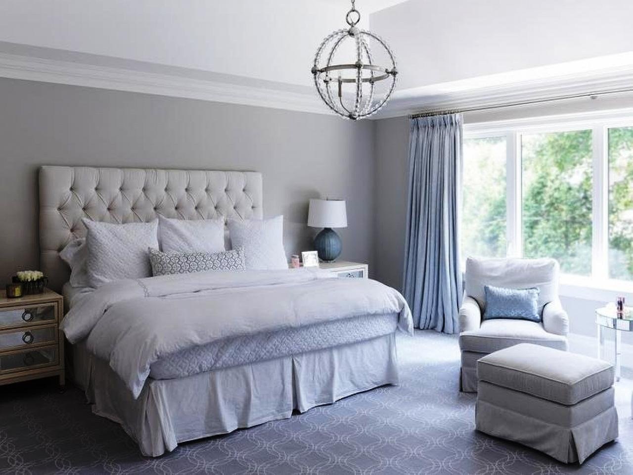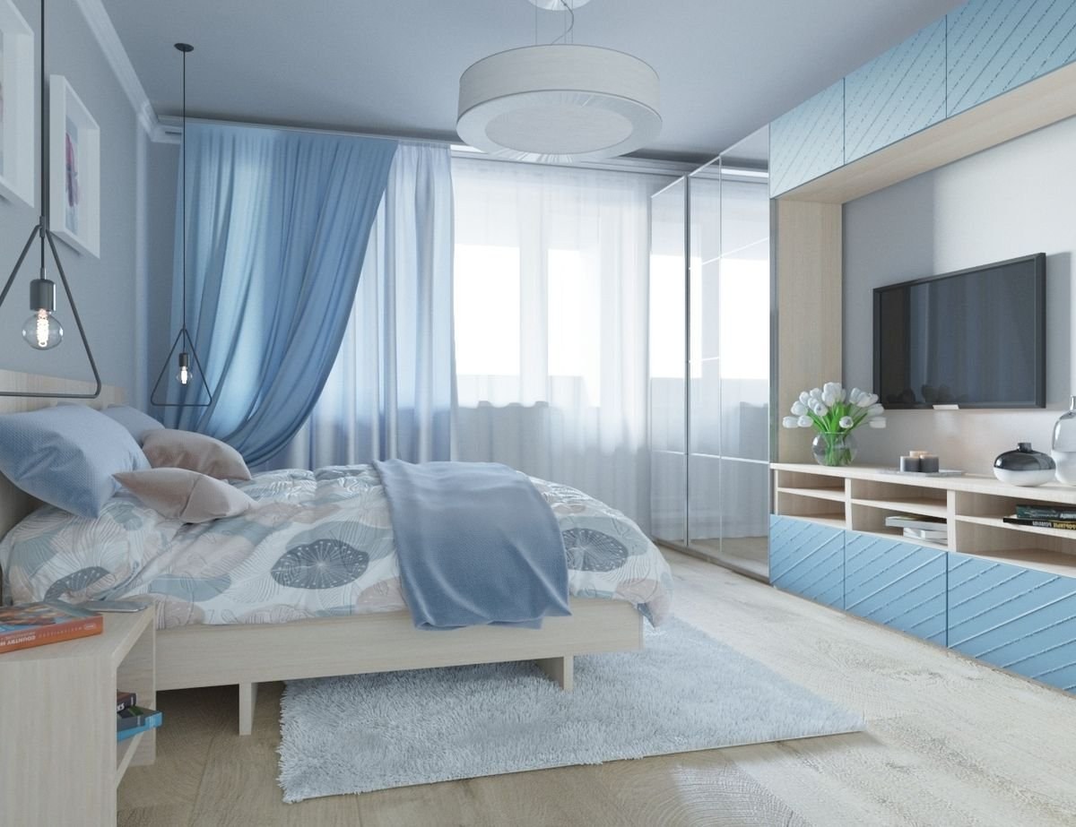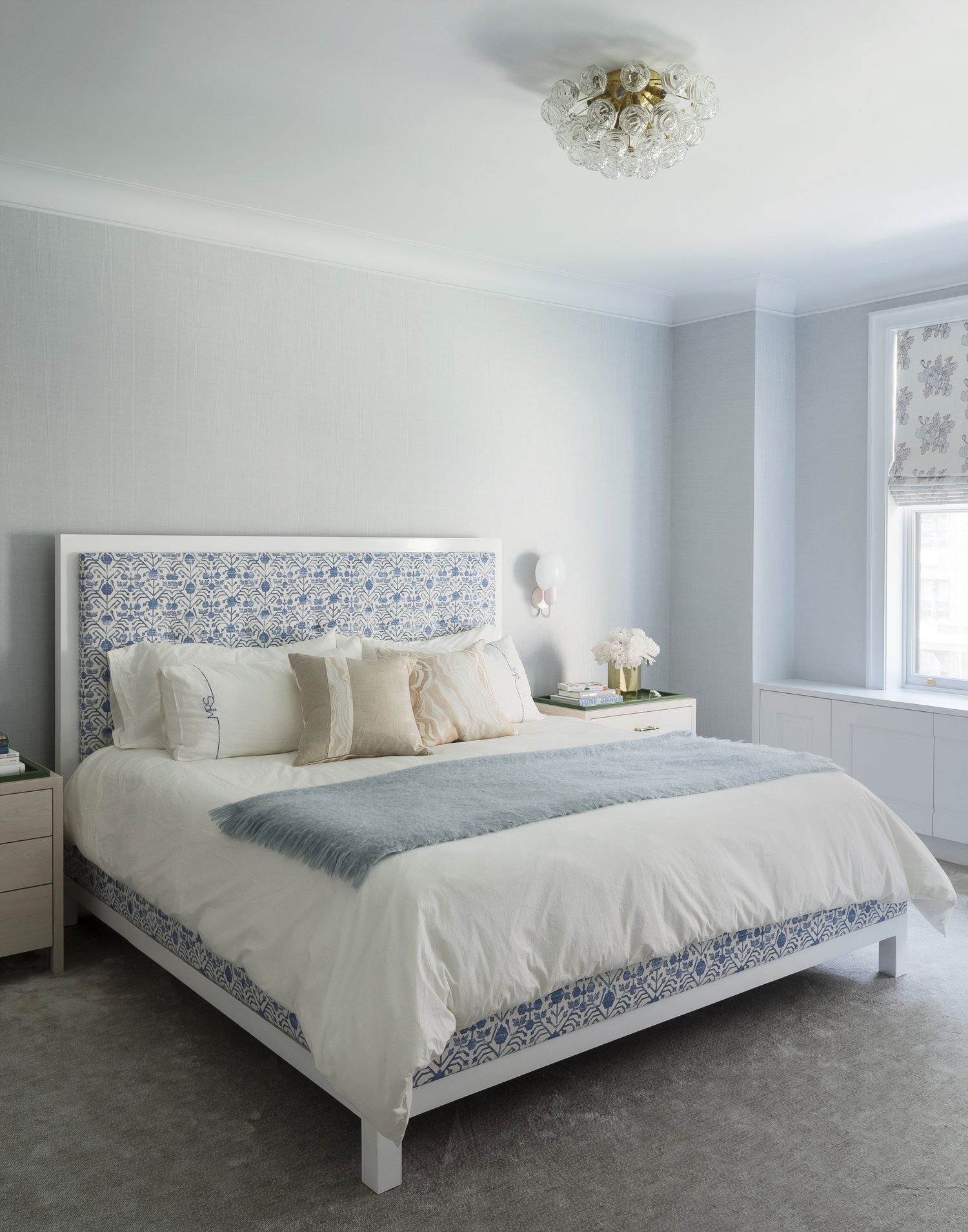 Спальня в серо голубых тонах с белой мебелью (58 фото)