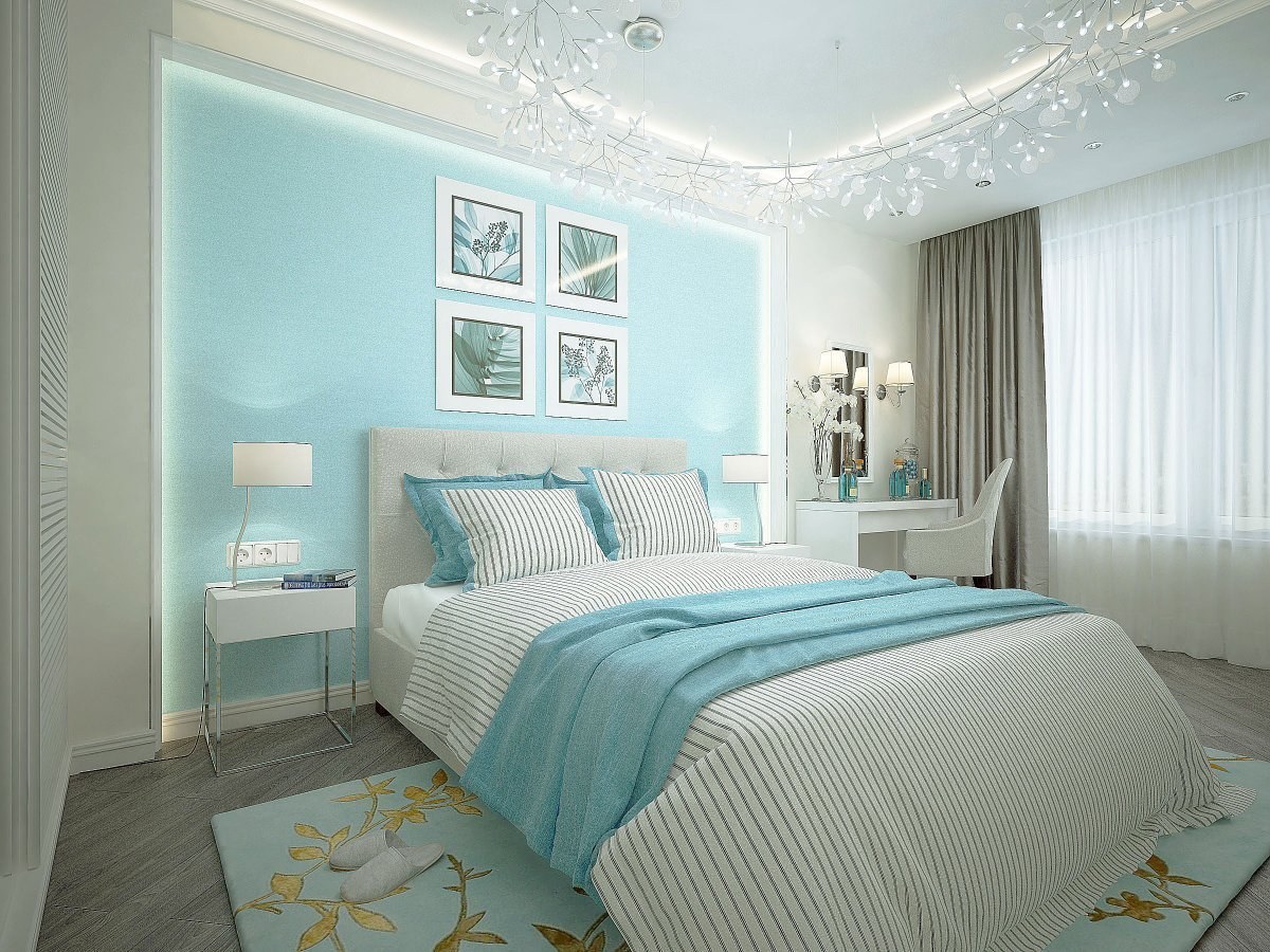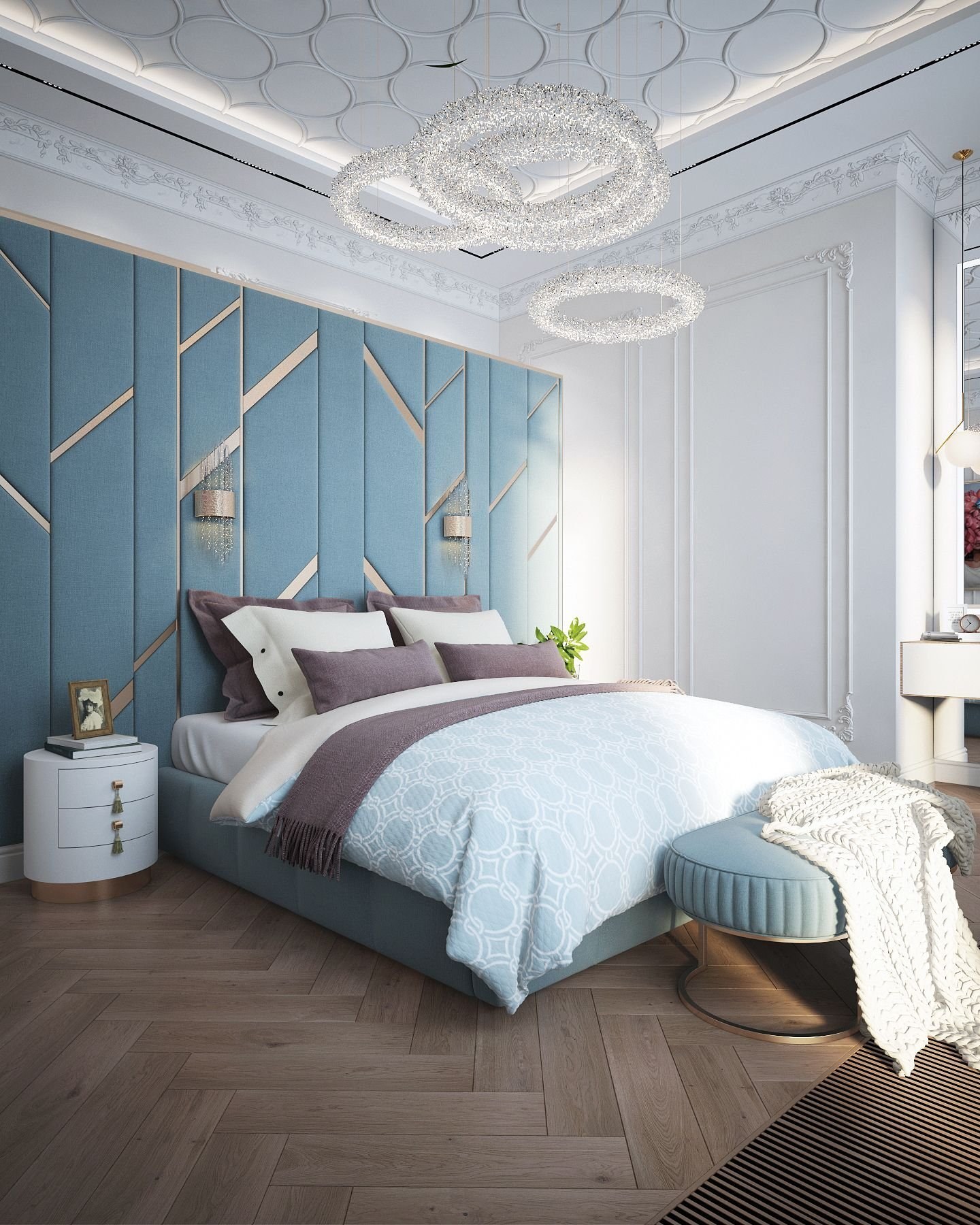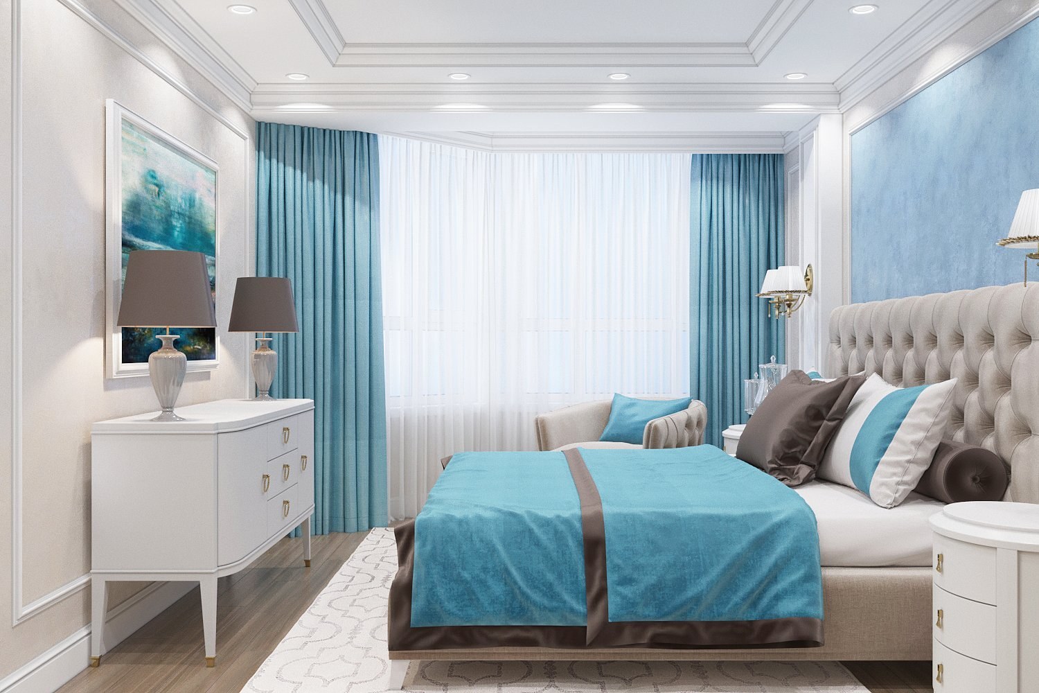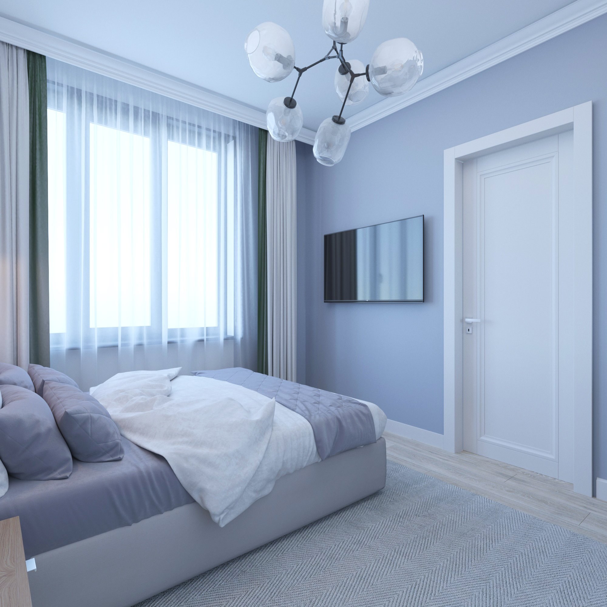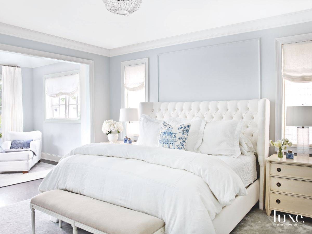 Спальня в серо голубых тонах с белой мебелью (58 фото)