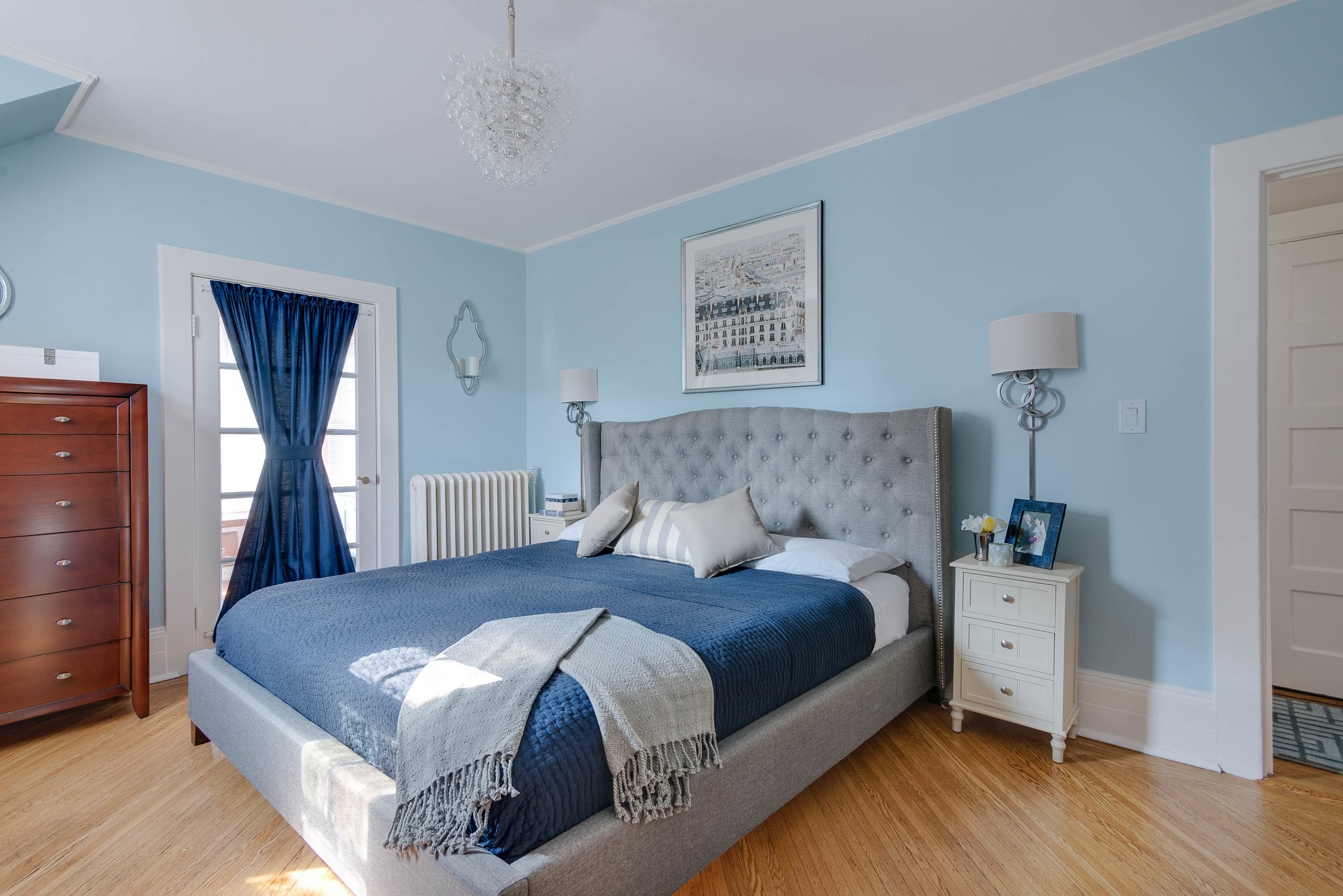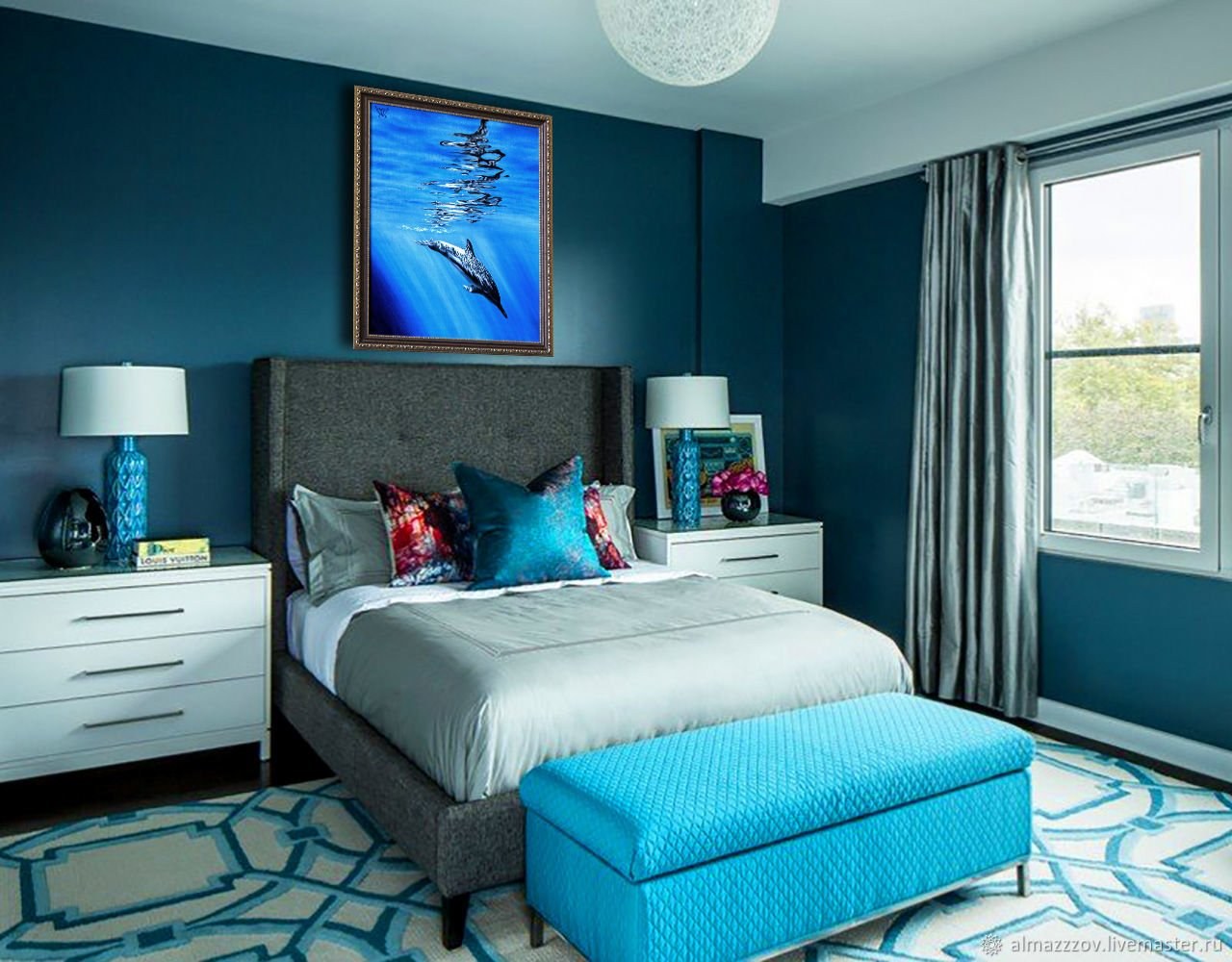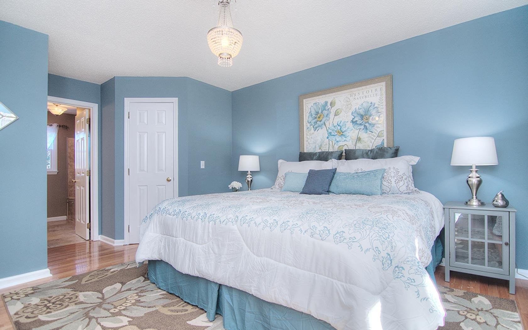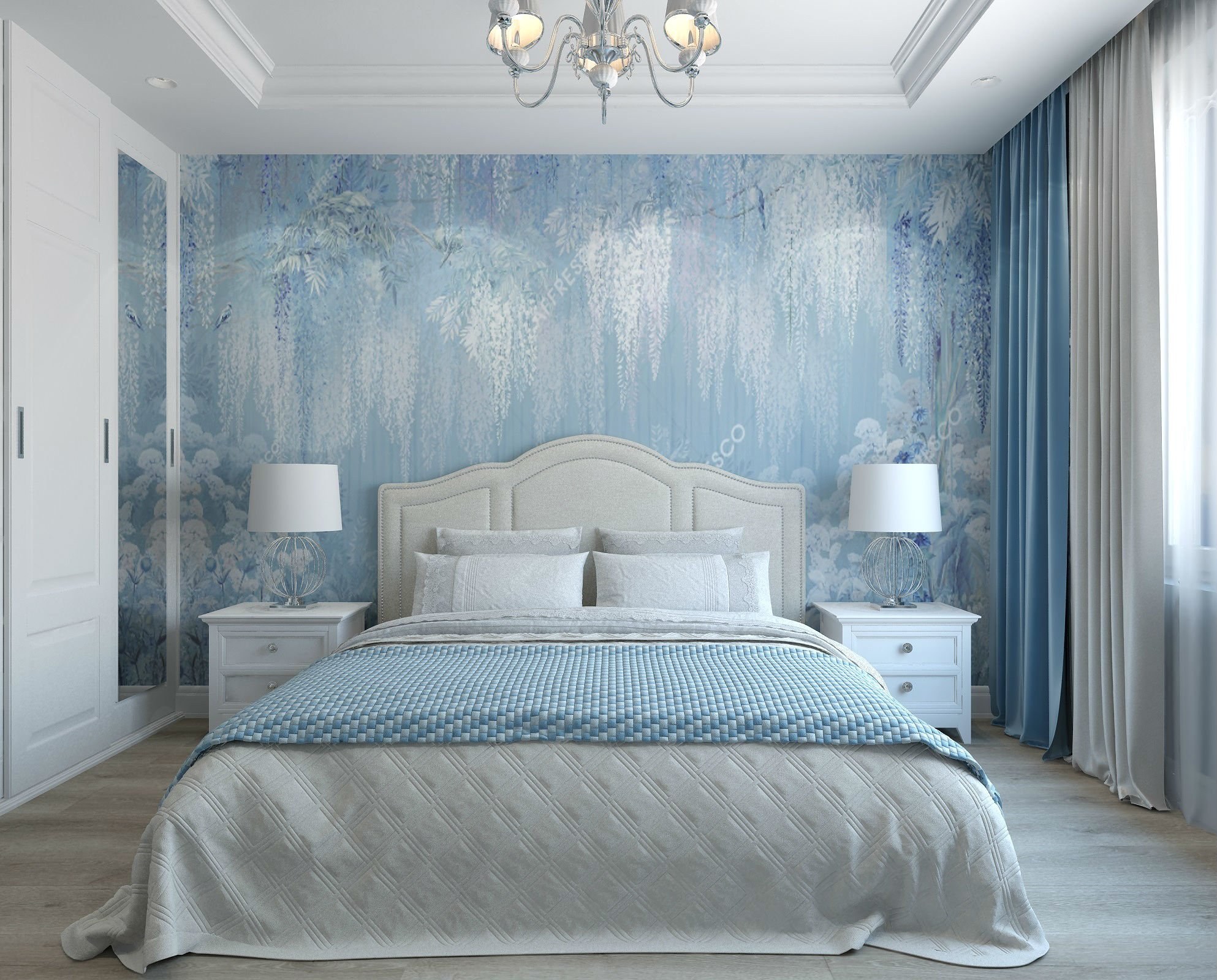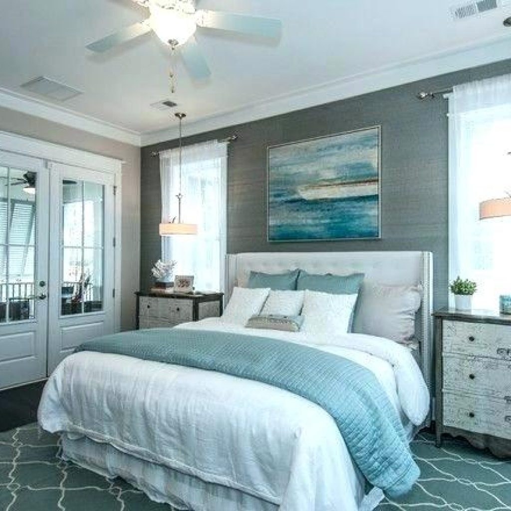 Спальня в серо голубых тонах с белой мебелью (58 фото)