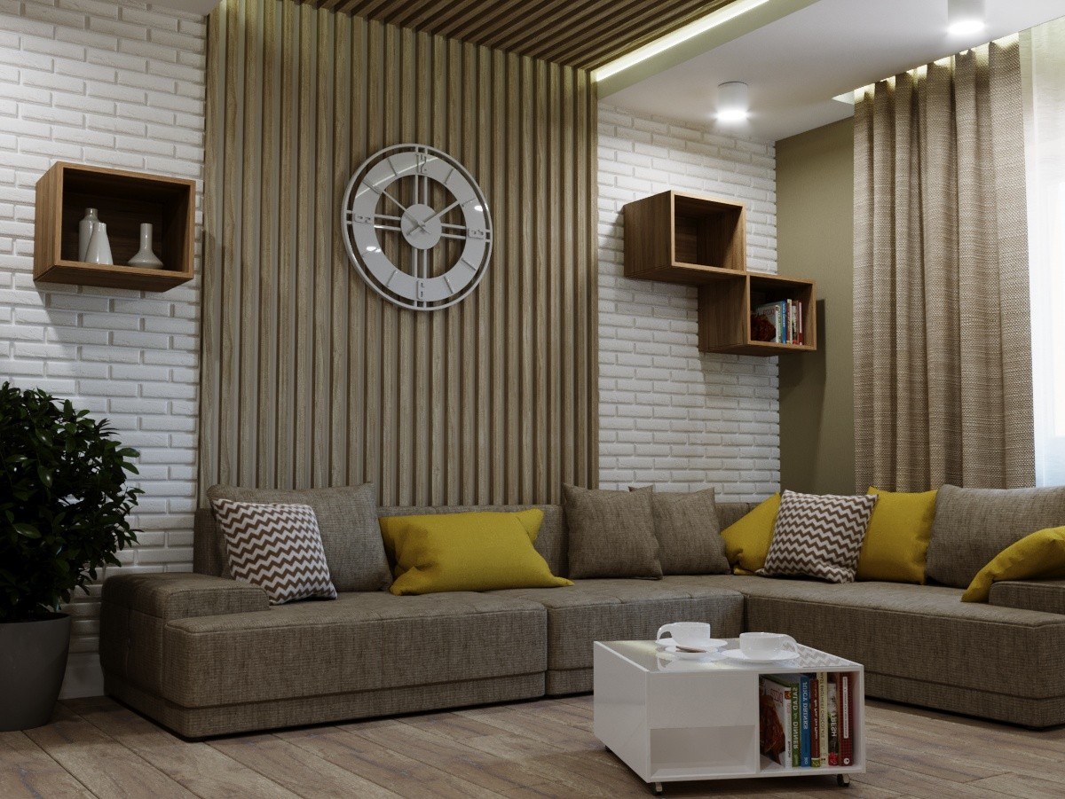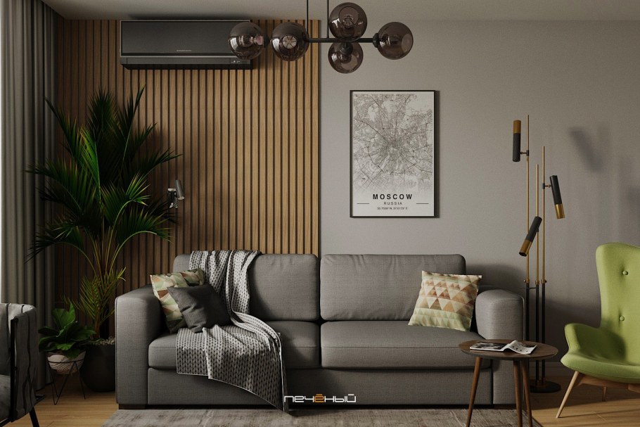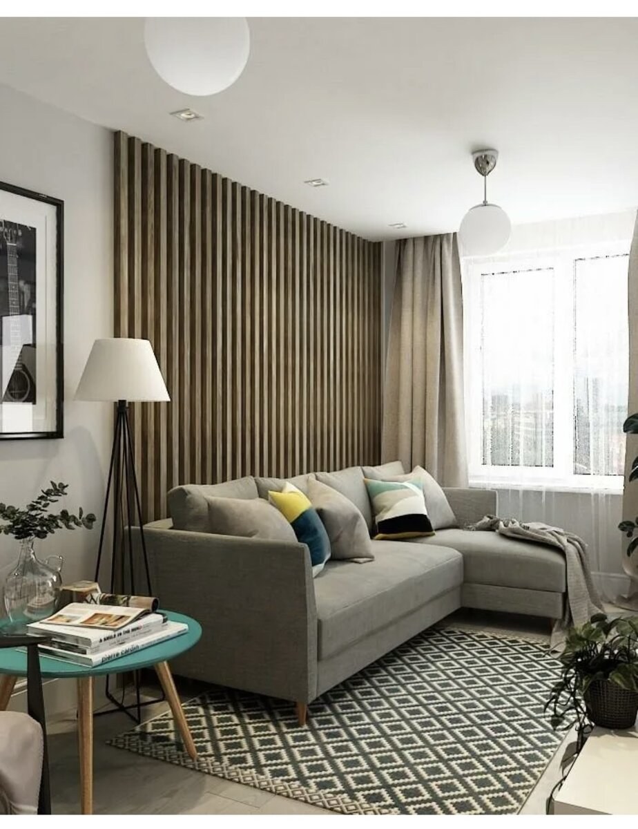 Гостиная с деревянными рейками