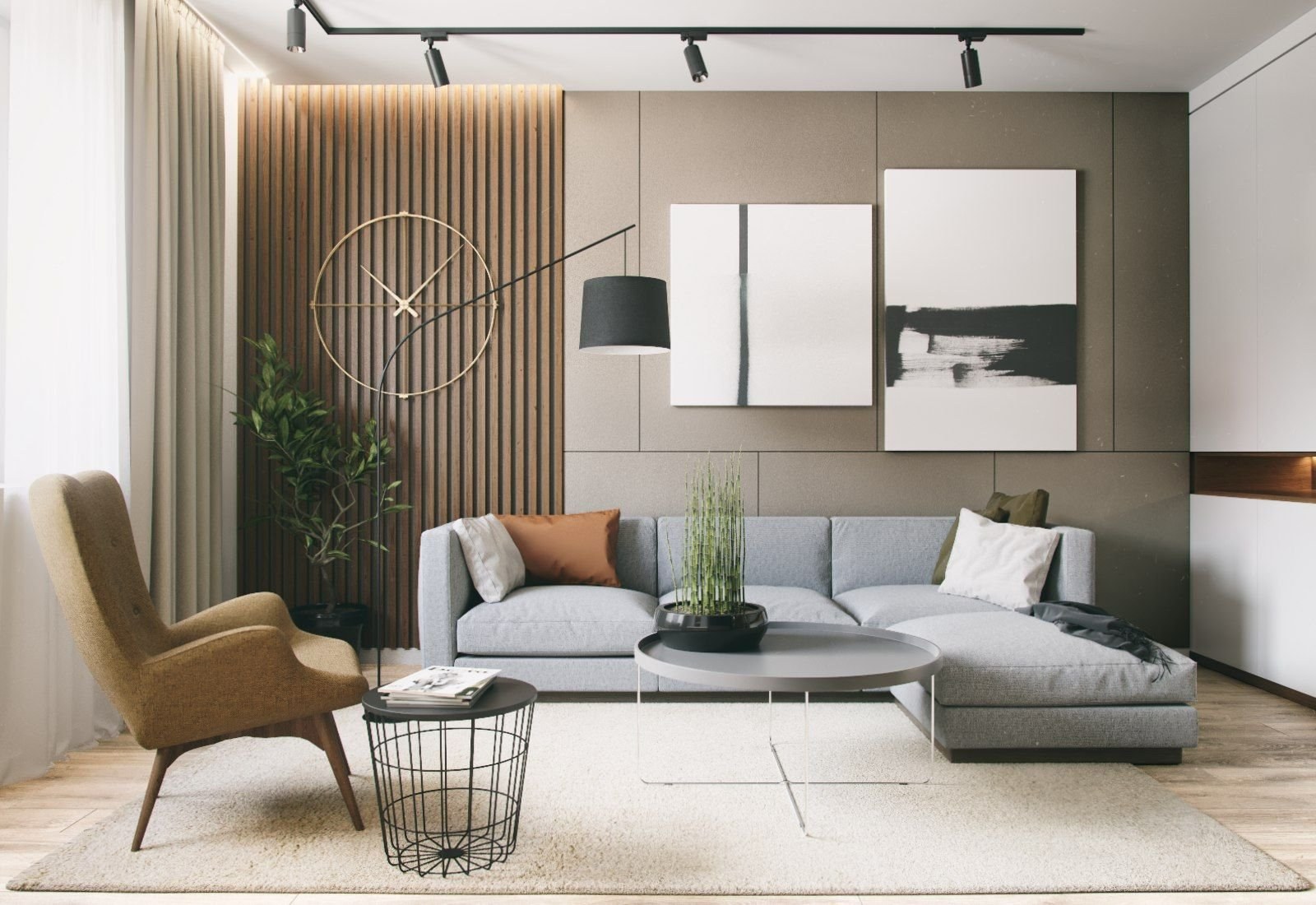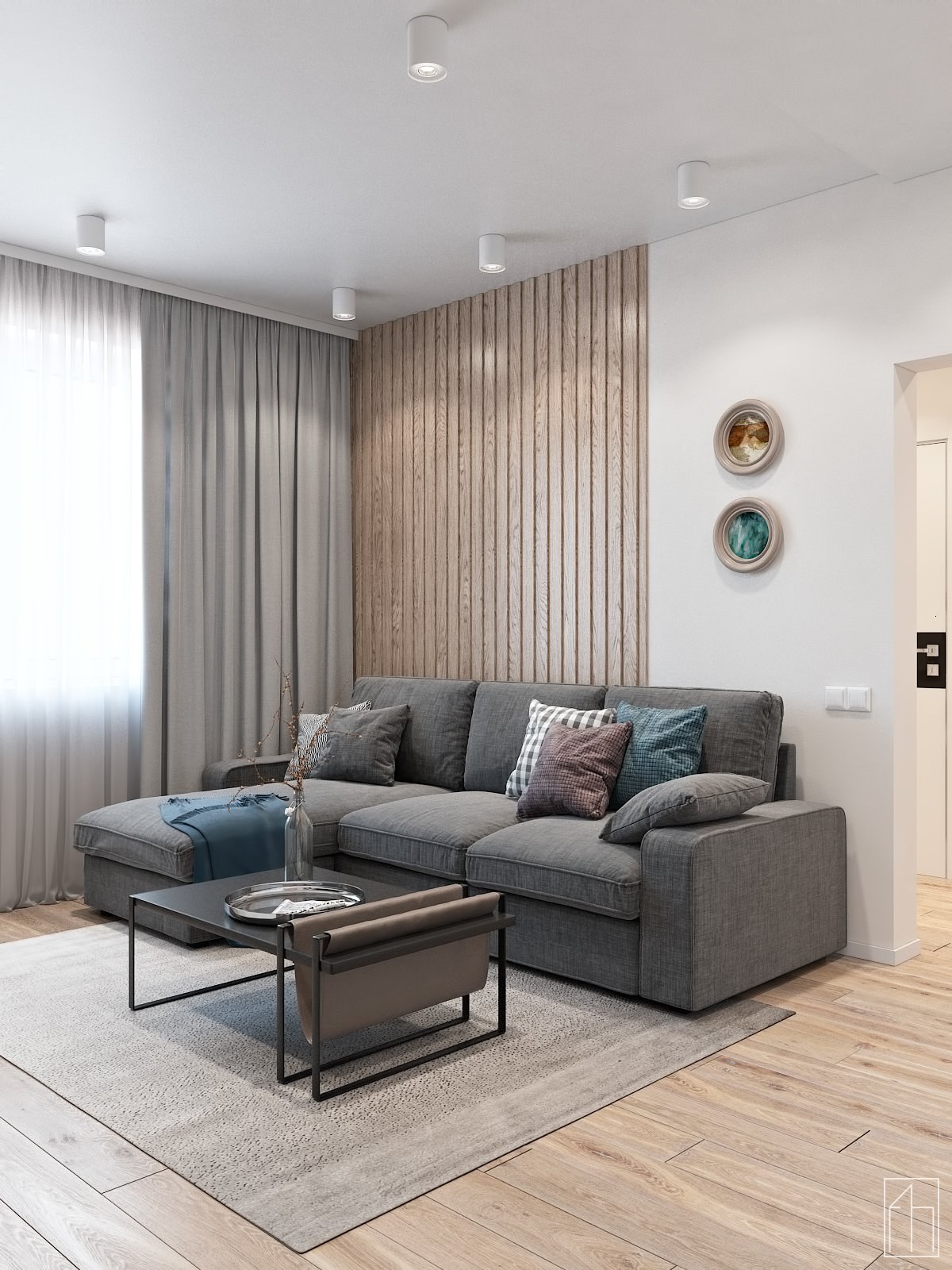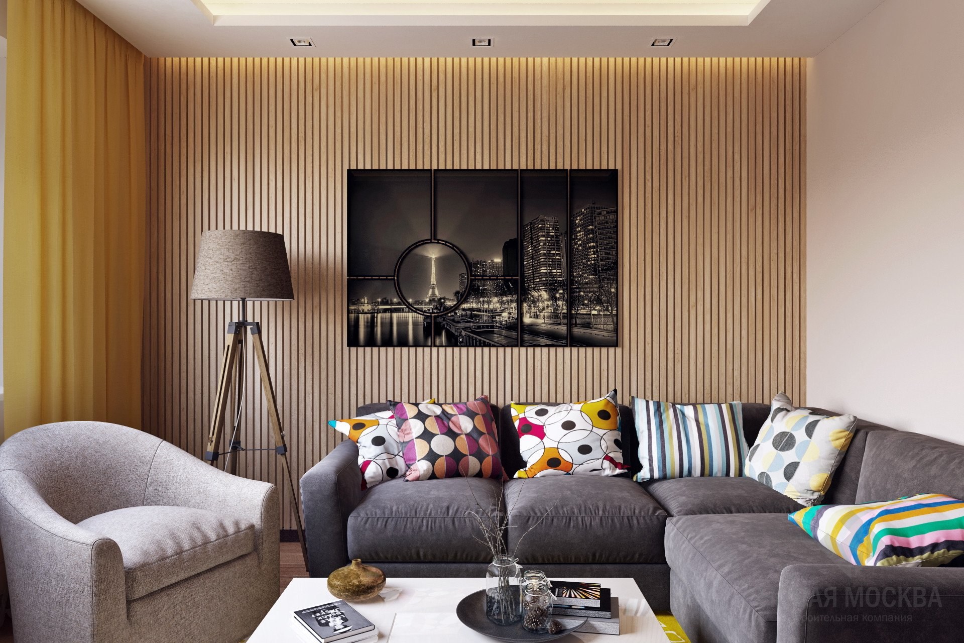 Гостиная с деревянными рейками
